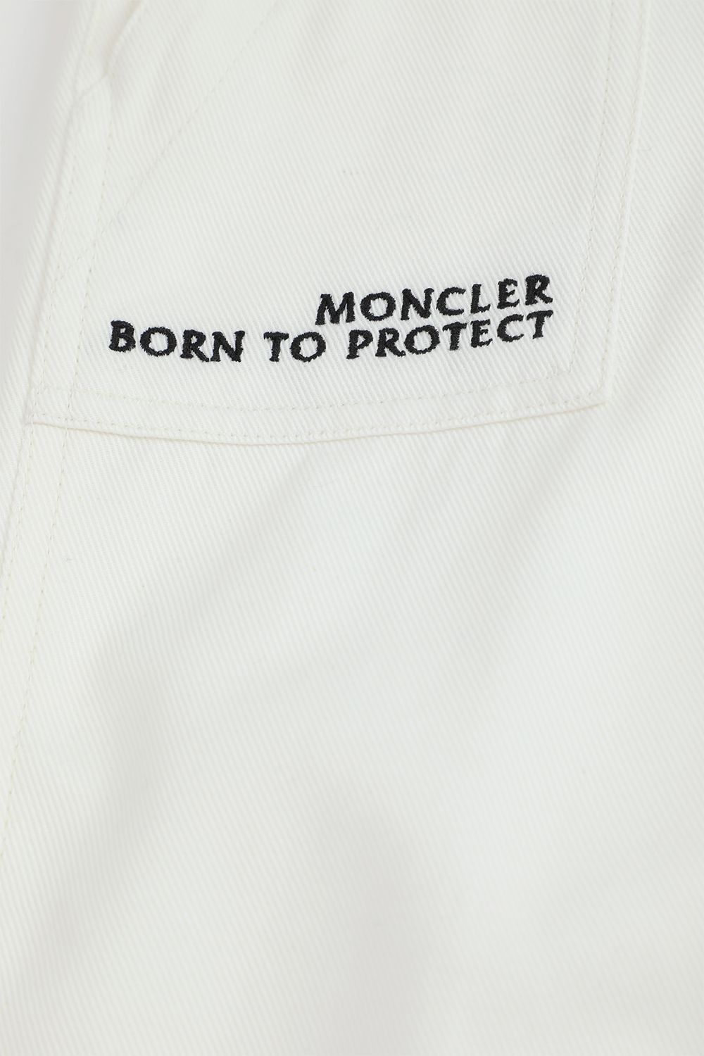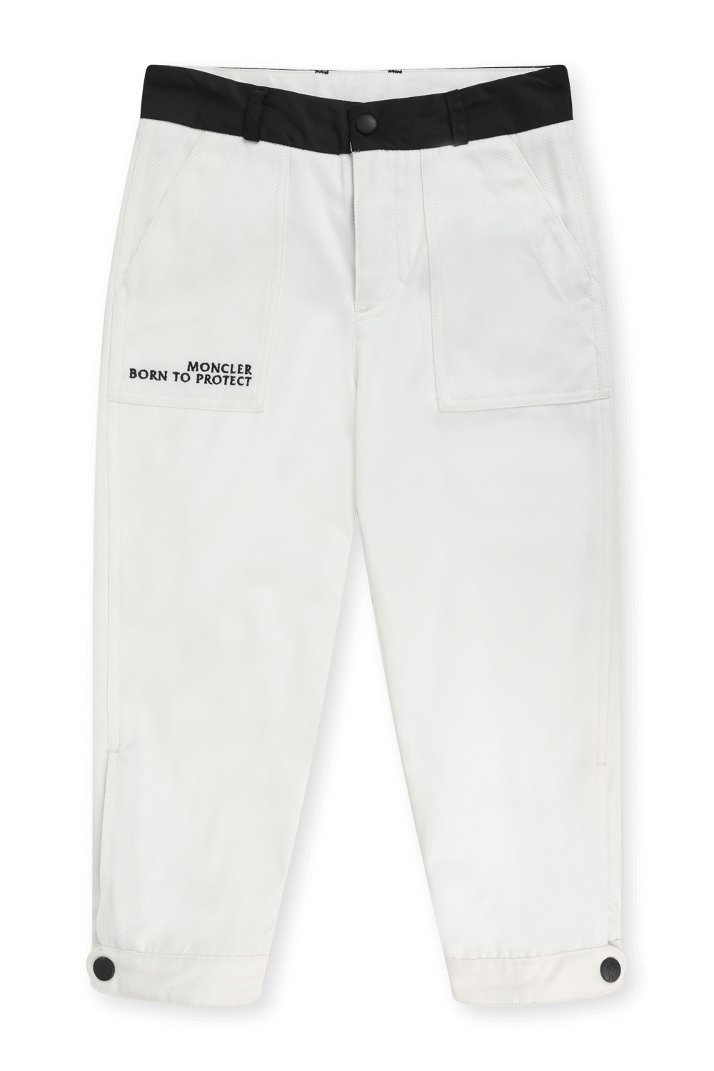 מכנסיים לבנים של בית האופנה האיטלקי Moncler העשויים מ-100% פוליאמיד איכותי לכדי צללית נינוחה וקולית עם אמרות מכופתרות לנוחות מירבית, לצד חגורת מותן אלסטית שחורה. המכנסיים מאובזרים בשני כיסים צדדיים כאשר לוגו המותג בגוון שחור קונטרסטי רקום על גבי אחד מהכיסים.