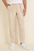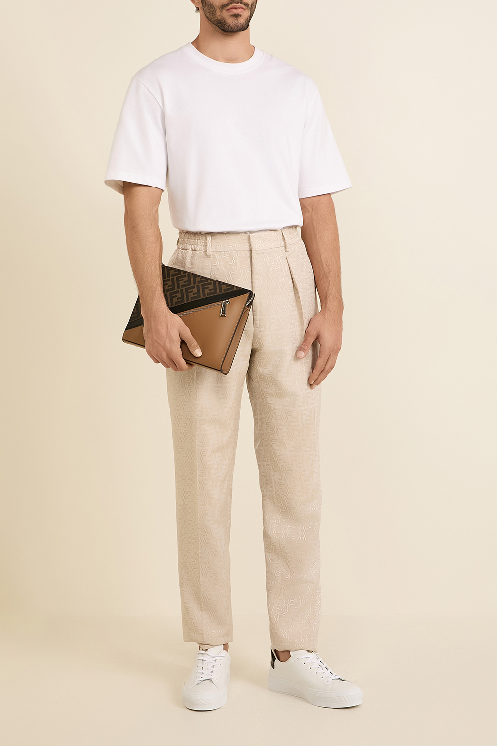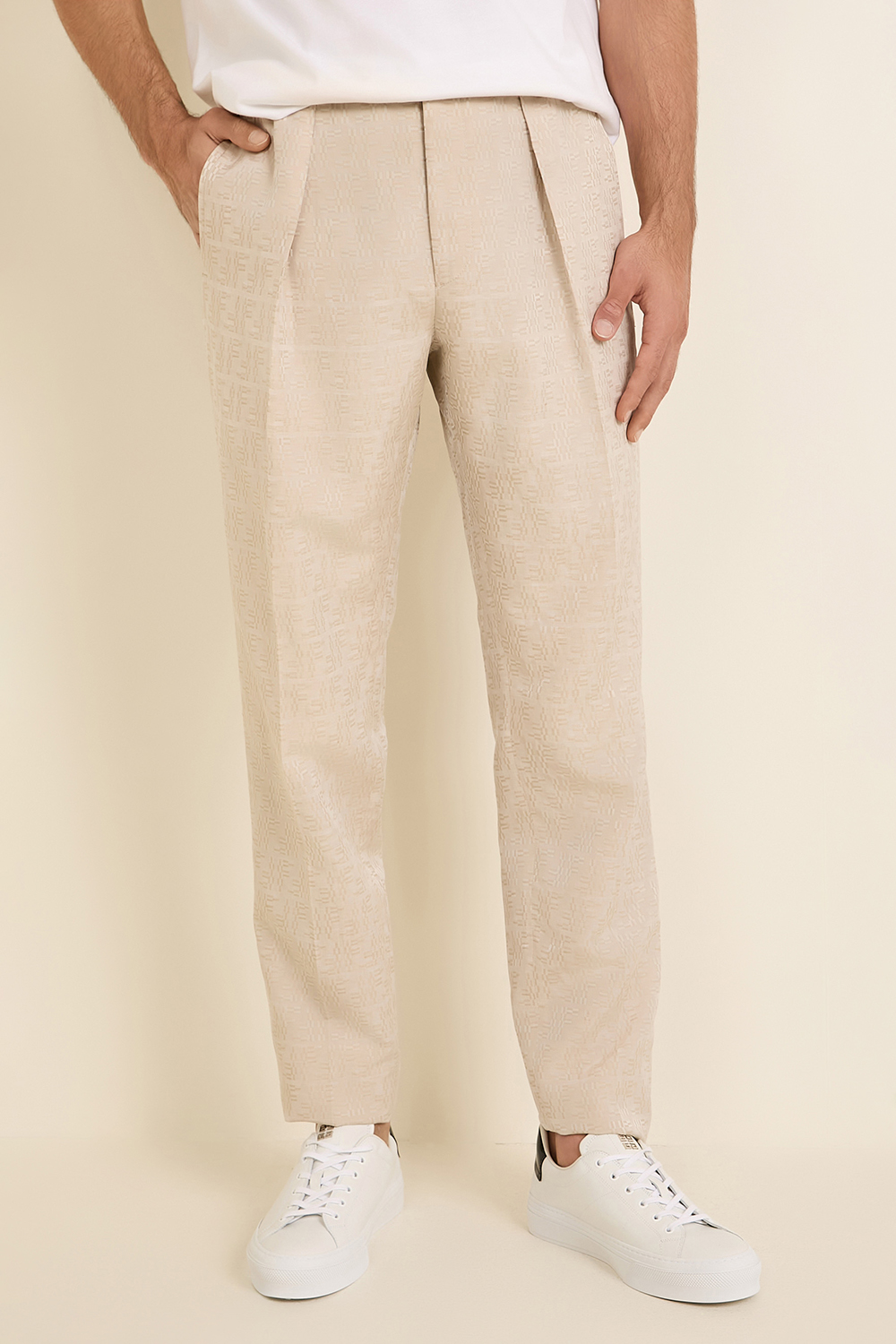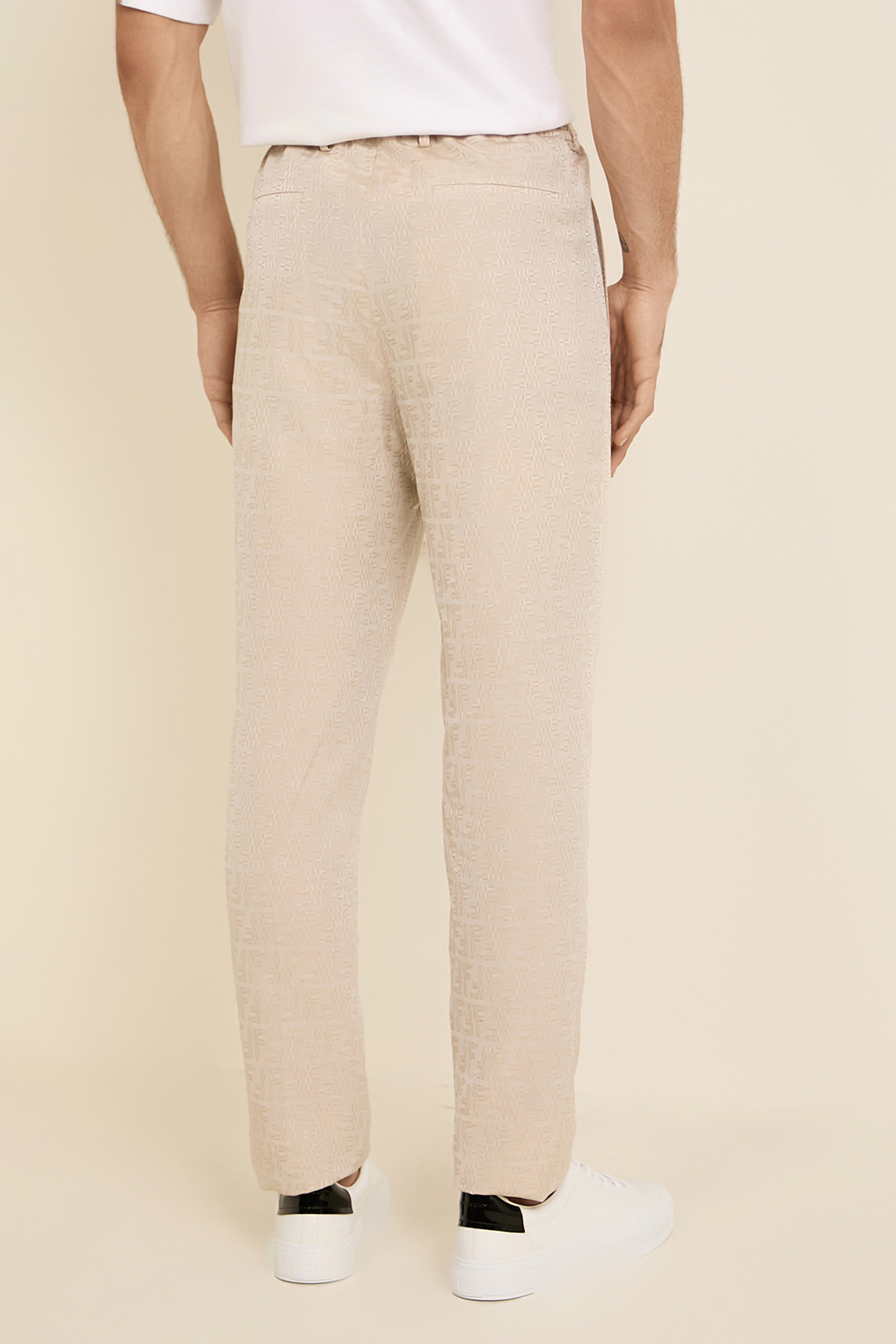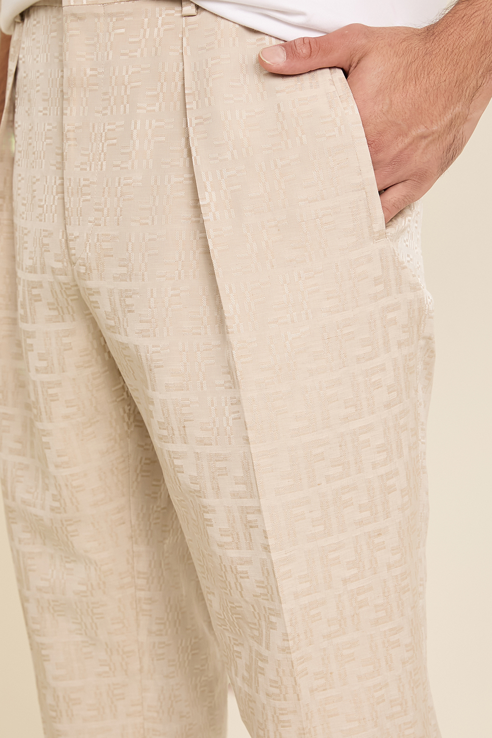 מכנסיים ארוכים מבית Fendi, תוצרת איטליה, עשויים תערובת ויסקוזה, פשתן וצמר בצבע בז' ובעיצוב מונוגרמה עדין כשהחלק האחורי של חגורת המותניים אלסטי.