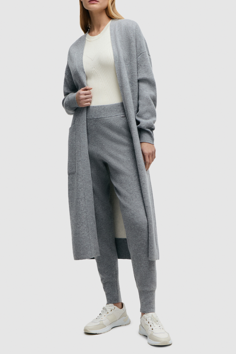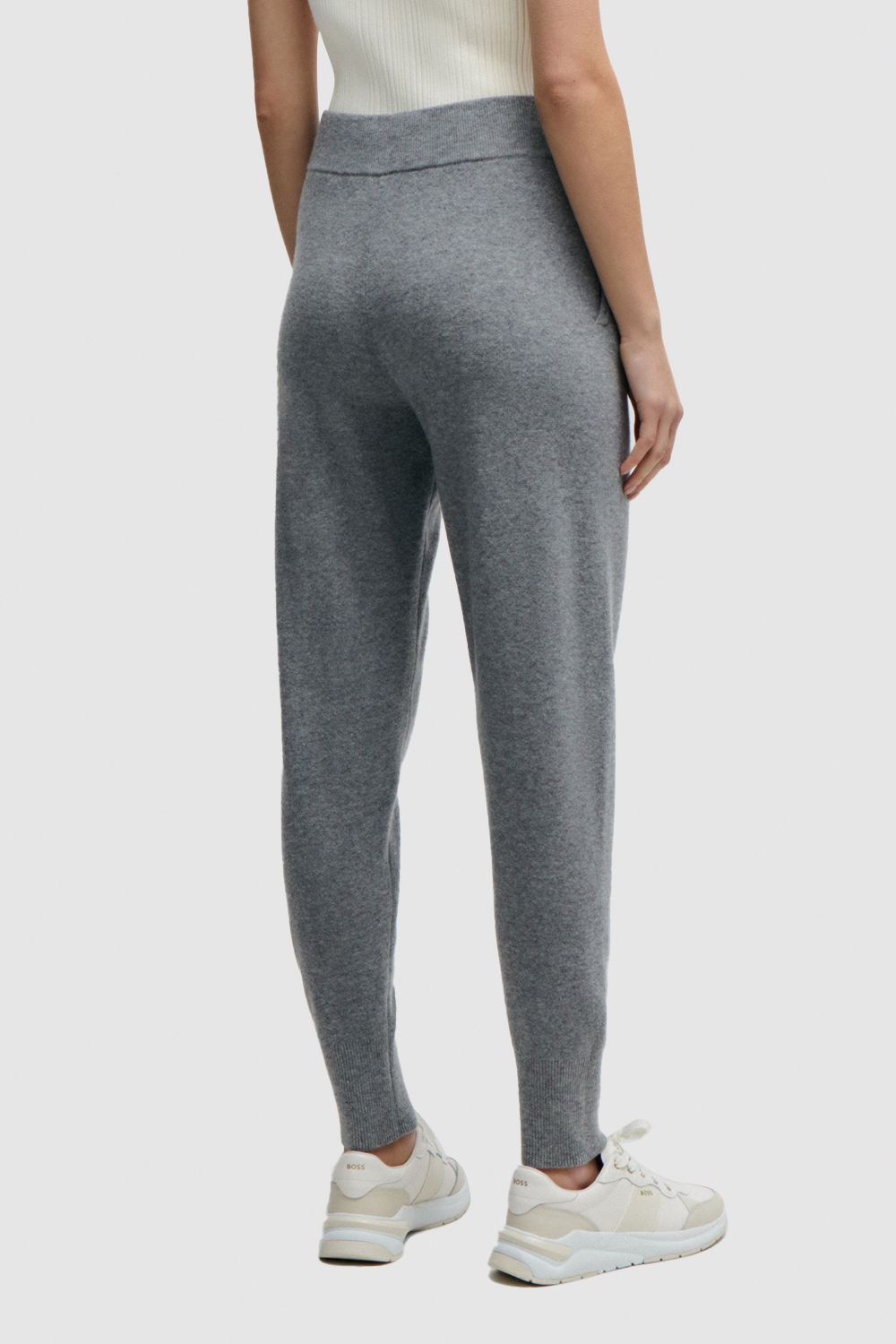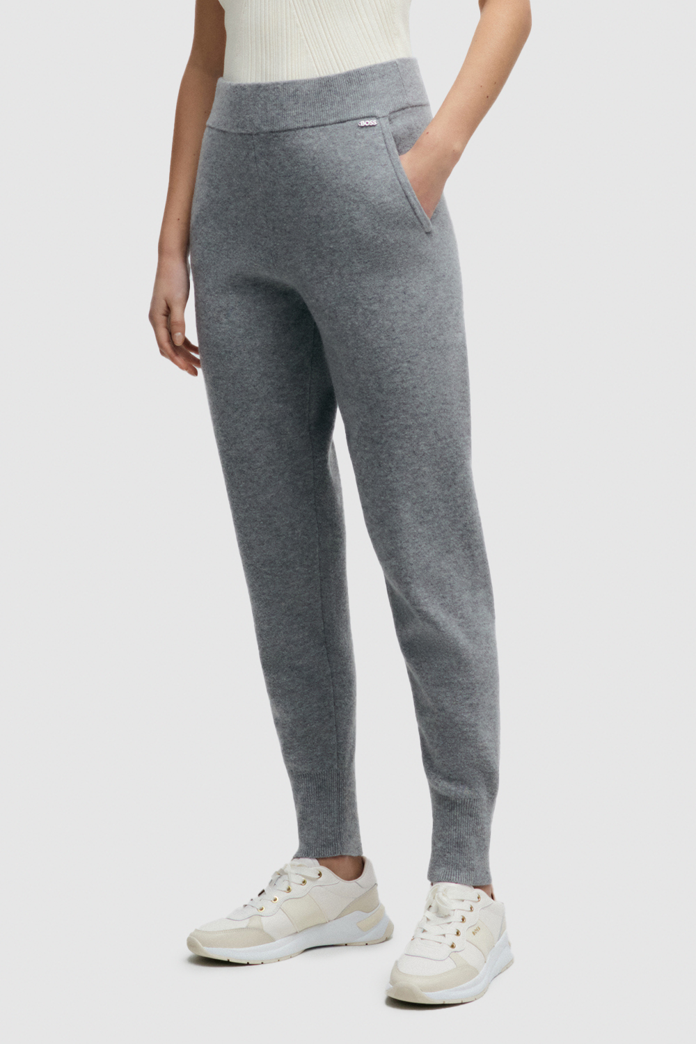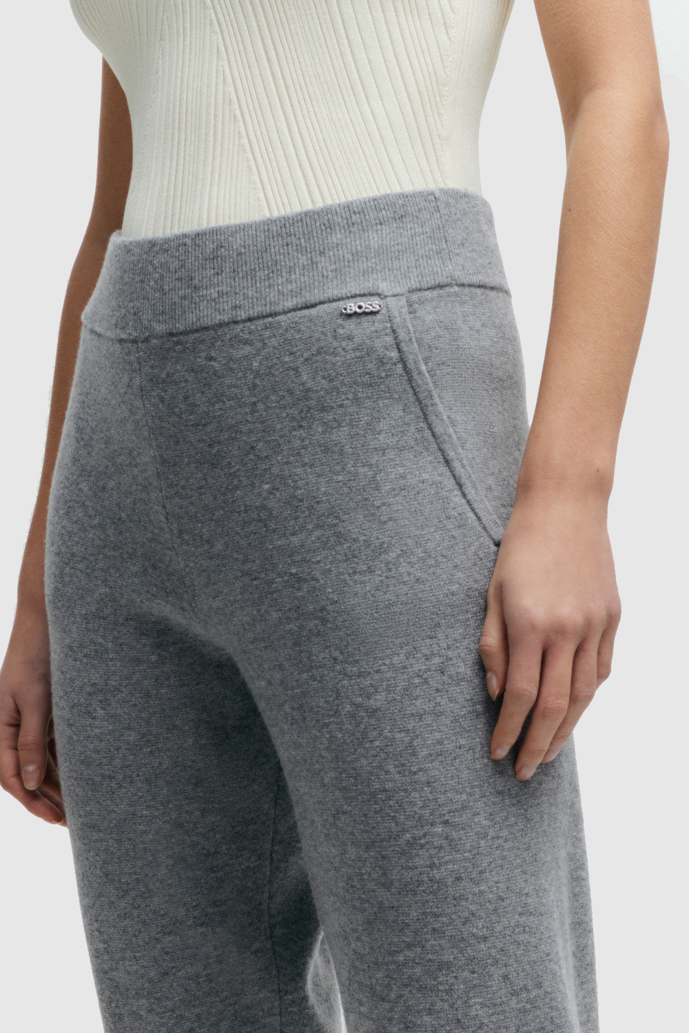 מכנסיים ארוכים מבית Boss, עשויים צמר בתולי וקשמיר בצבע אפור עם חגורת מותניים באריגת ריב.