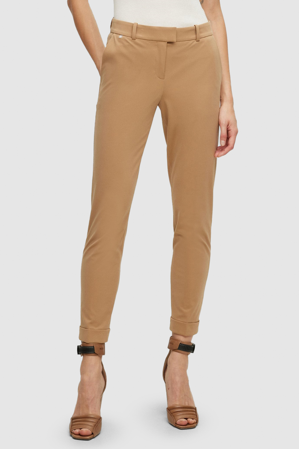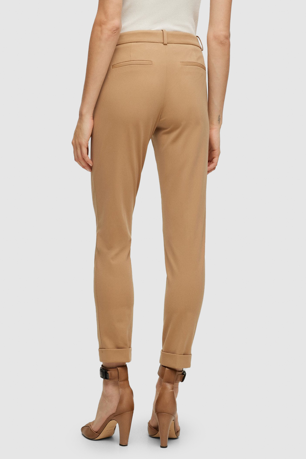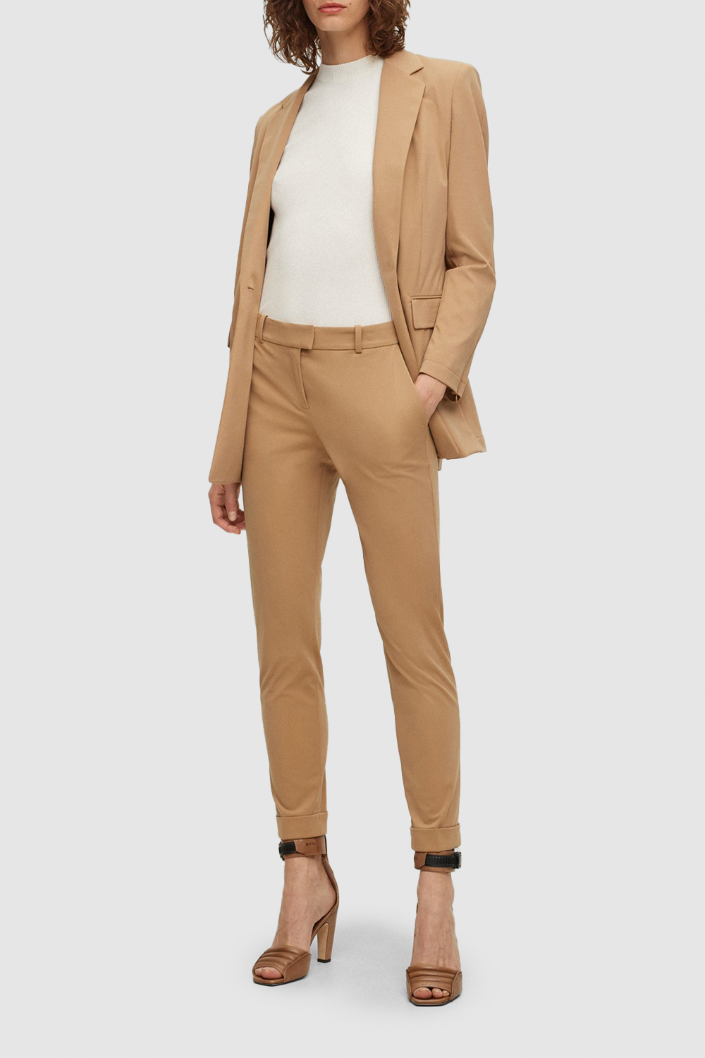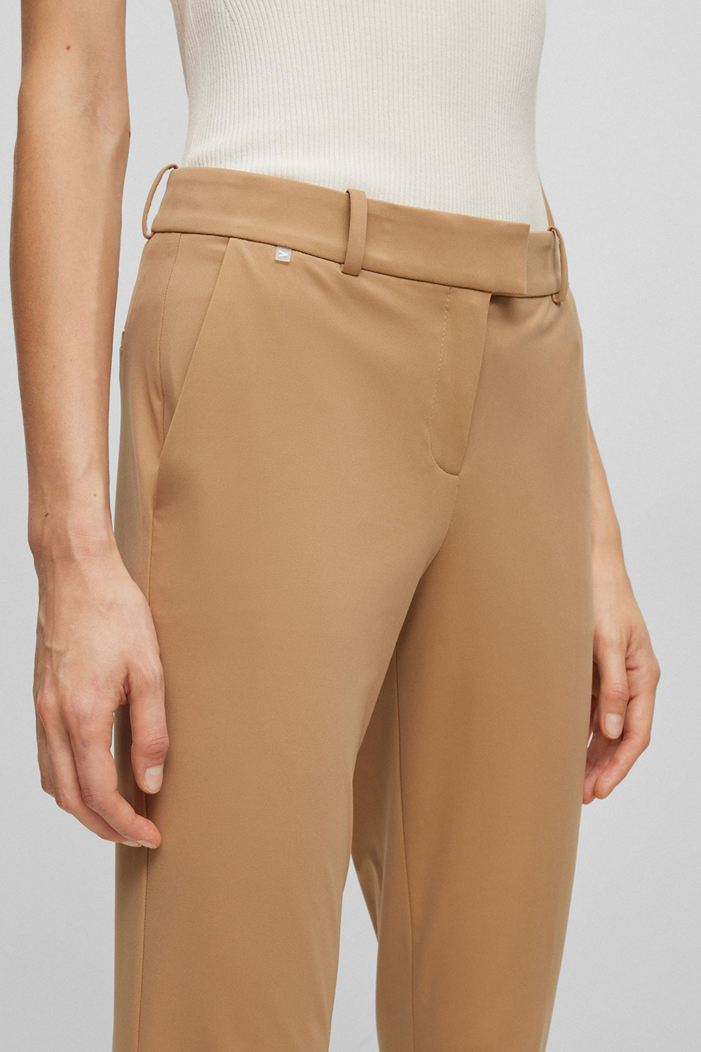 מכנסיים מחויטים מבית Boss, עשויים תערובת פוליאמיד ואלסטן בצבע בז' בסיומת קרופ ובגזרת סלים. ניתן לשלב את המכנסיים עם בלייזר בז' למראה חליפה אלגנטית.