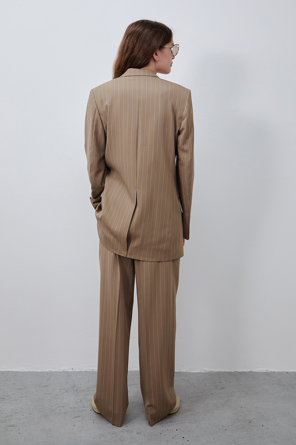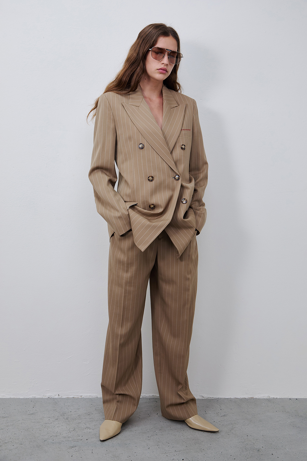 מכנסיים מחוייטים מבית Victoria Beckham, עשויים צמר בצבע מוקה עם פסים קלאסיים. הם מעוצבים בקו מותניים גבוה, בגזרה רחבה ויש להם כיסי אוברסייז קדמיים. שלבו אותם עם ז'קט תואם מתוך הקולקציה ליצירת חליפה מושלמת.