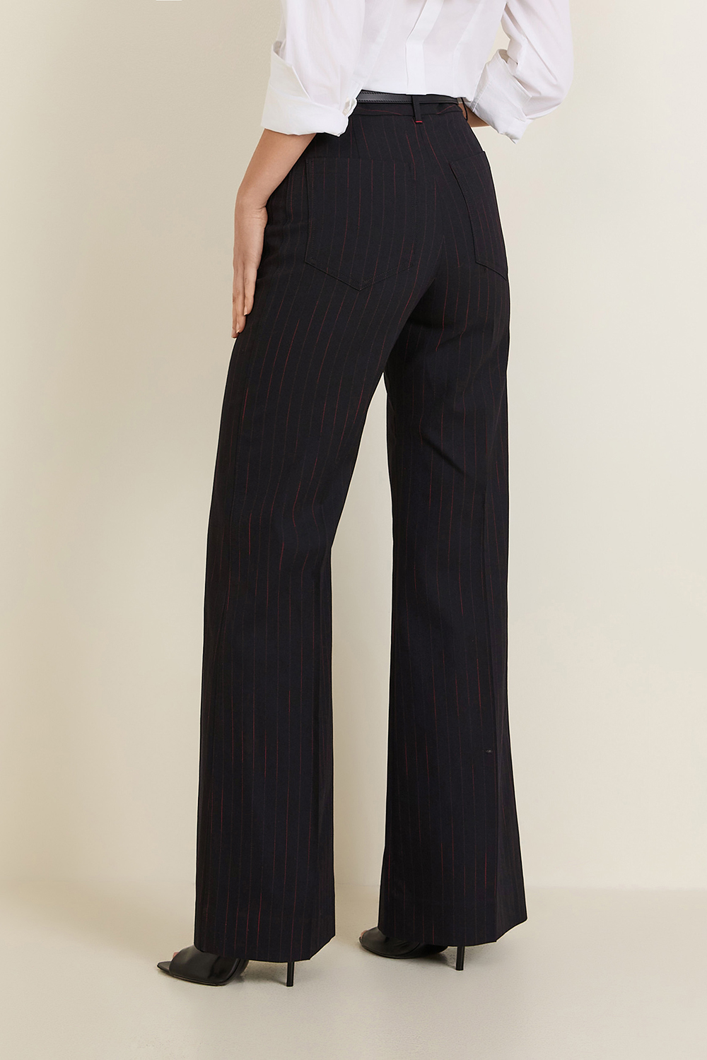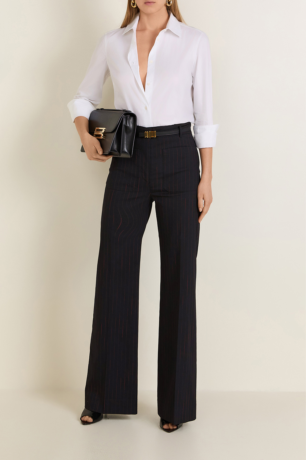 מכנסי Alina האייקונים של המעצבת Victoria Beckham בגזרה מתרחבת וקו מותניים גבוה. הפעם הם מעוצבים בסגנוון מחוייט, ועשויים תערובת צמר בתולי בצבע כחול כהה עם פסי סיכה דקים בצבע אדום.