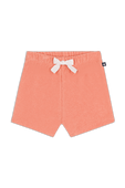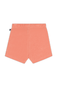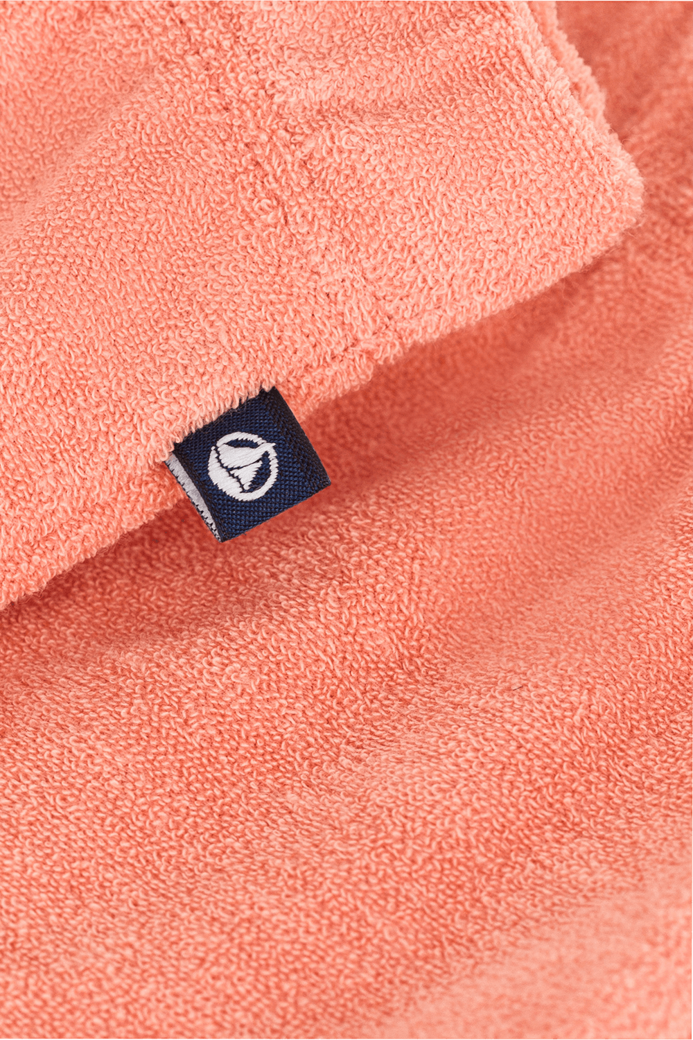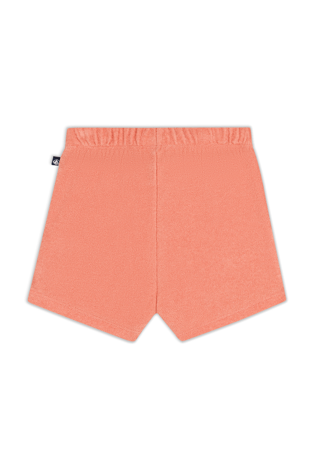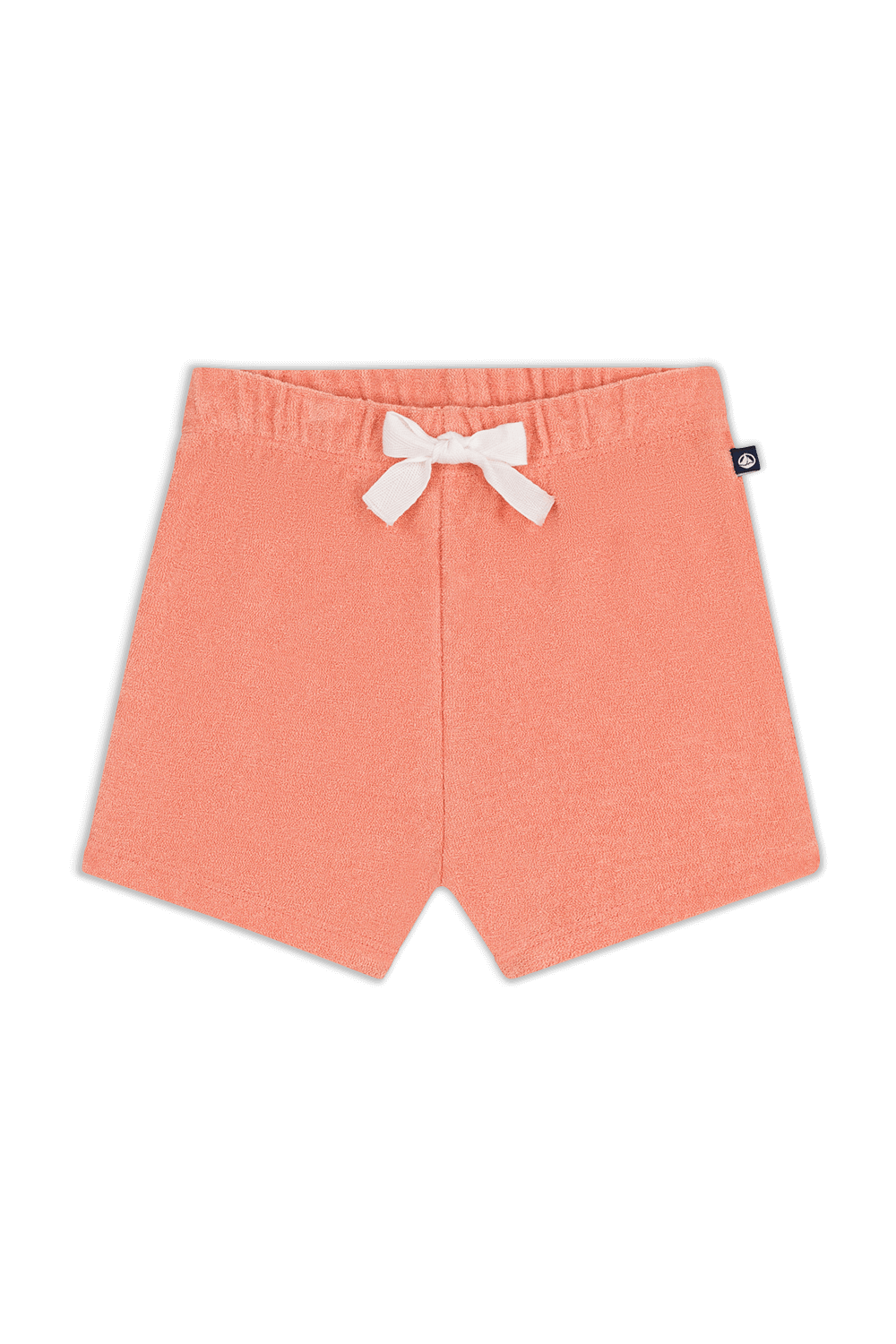 מכנסיים קצרים מבית Petit Bateau, עשויים בד מגבת רך בצבע אפרסק. יש להם חגורת מותניים אלסטית וסרט לקישוט.