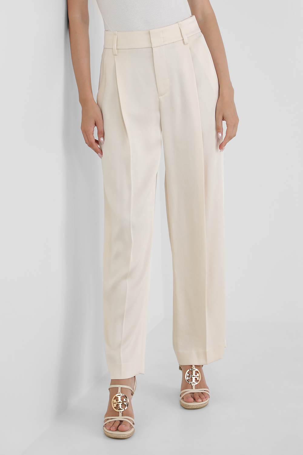 מכנסי אלגנט מבית Vince, עושיים תערובת בד פוליאסטר וטריאצטט באריגת סאטן בצבע לבן בגזרה רחבה.