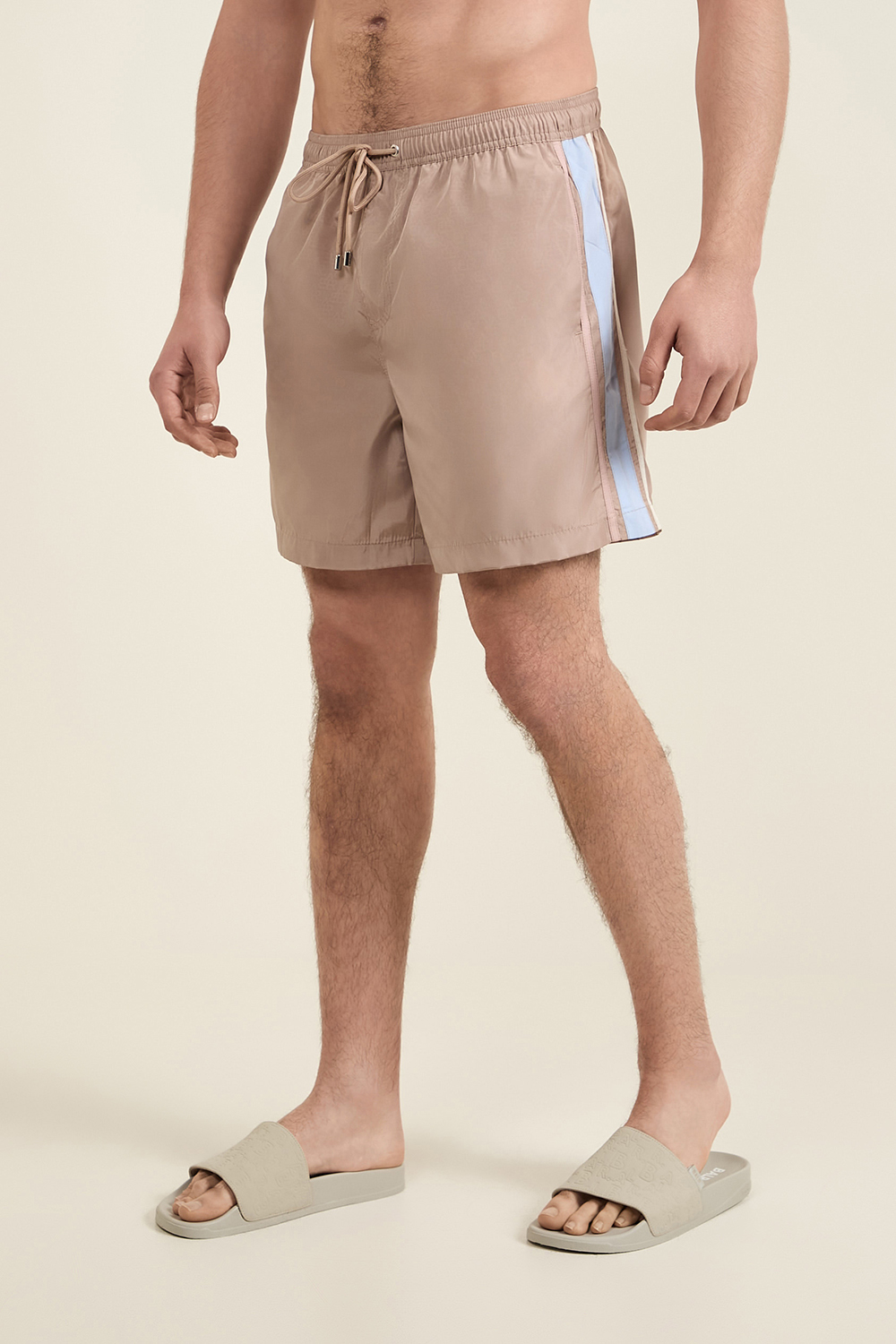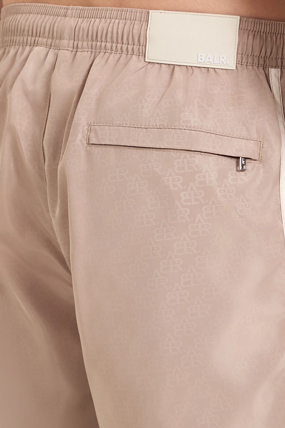 מכנסי בגד ים מבית Balr, עשויים ניילון רך ונעים בצבע בז' בדוגמת לוגו חזרתית ושני פסי צד בתכלת. יש להם ביטנת רשת, שני כיסי צד וכיס אחורי בסגירת רוכסן ושרוך קשירה בחגורה המותניים.