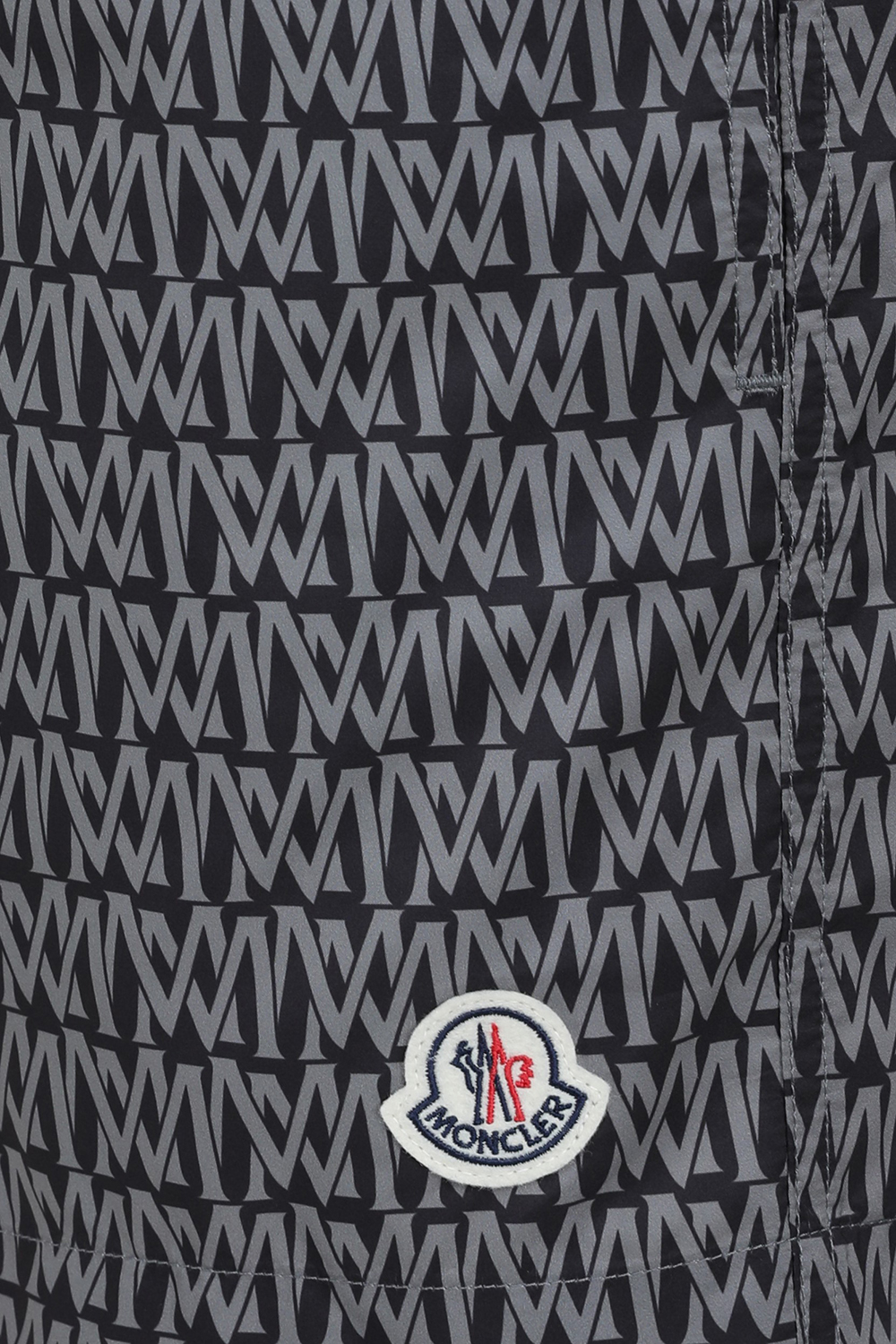 מכנסי בגד ים מבית Moncler, עשויים פוליאסטר בצבע כחול כהה עם הדפס מונוגרמה בצבע לבן. למכנסיים חגורת מותניים אלסטית בשילוב שרוכים ושני כיסי צד שיתאימו לחוף או לבריכה במזג אוויר חמים.