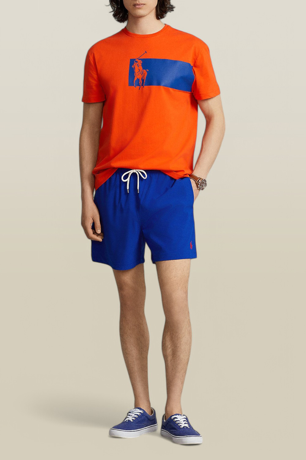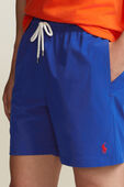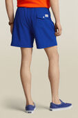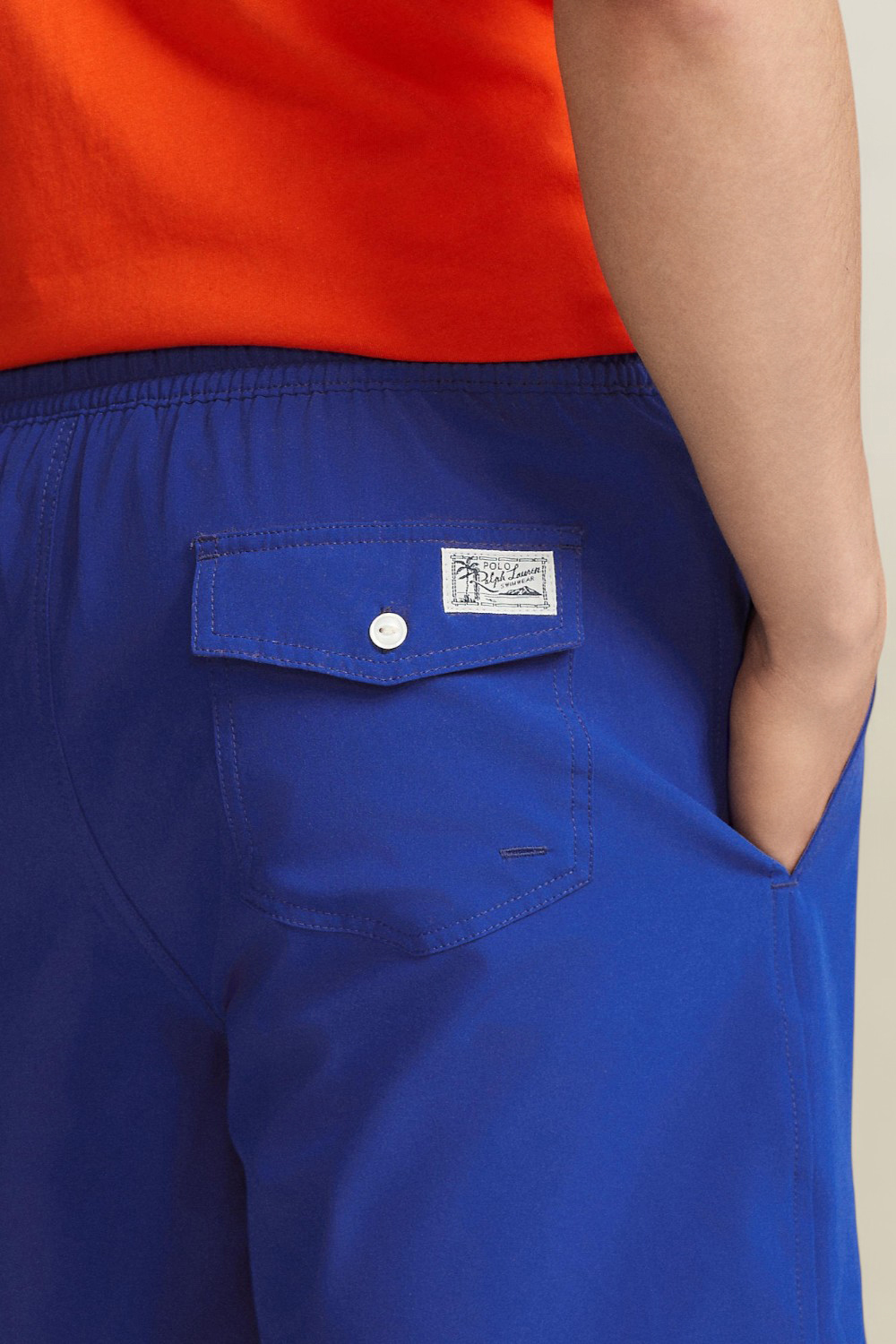 מכנסי בגדי ים Traveler בסטייל האייקוני של Polo Ralph Lauren - מוקפד ונוח - בתוך המים או מחוצה להם. הם עשויים ניילון אלסטי מעט בצבע כחול, עם ביטנת רשת צמודה, שרוך קשירה, שני כיסי צד וכיס אחורי בסגירת כפתור.