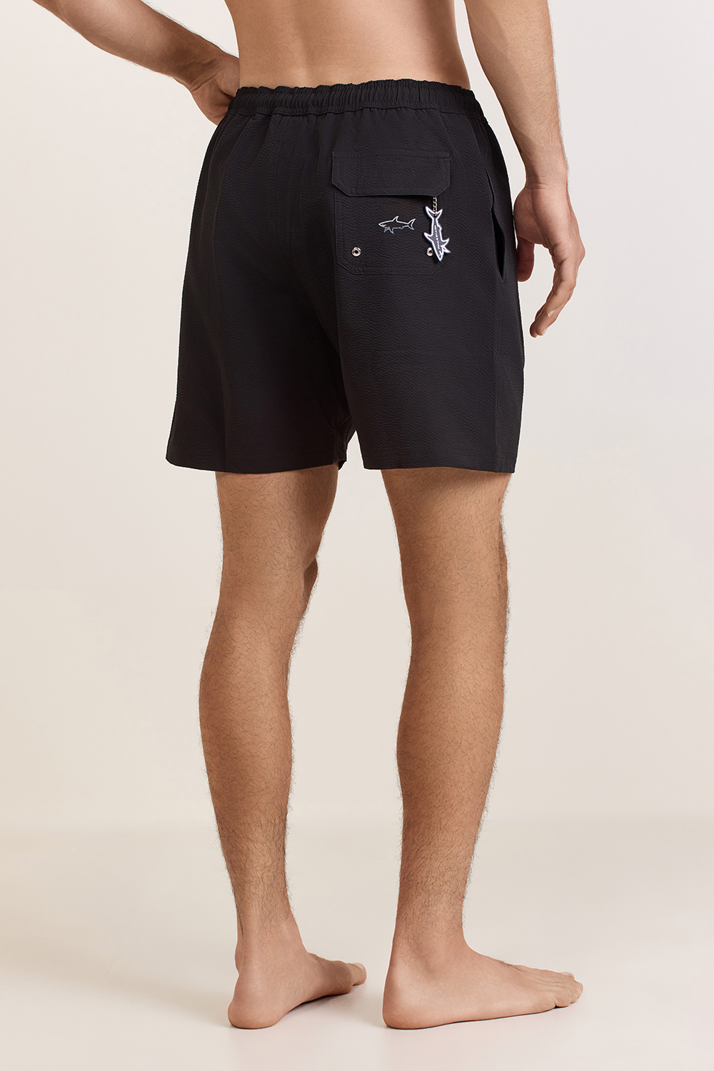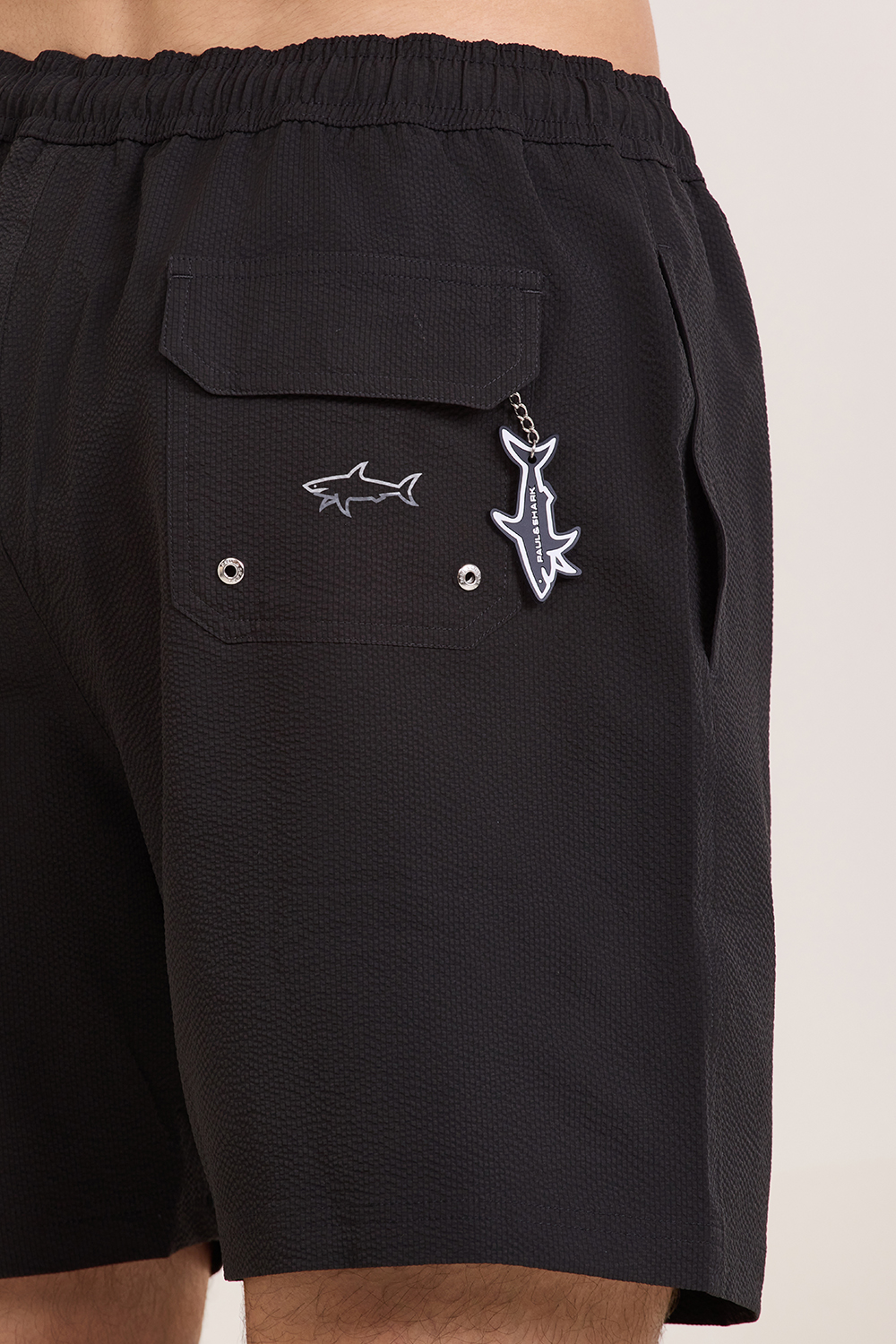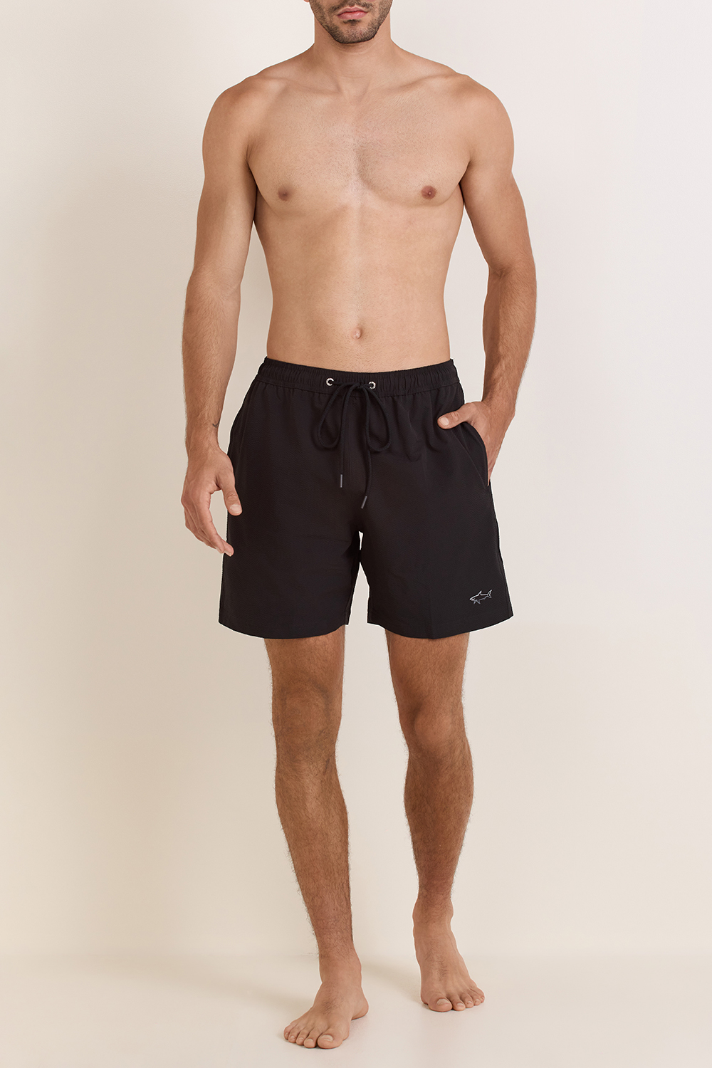 מכנסי בגד ים בצבע שחור מבית Paul&Shark, עשויים ניילון מגורען המיוצר בתנאי ייצור אקולוגיים. לבגד הים ביטנת רשת שחורה, כיס אחורי בסגירת סקוץ' ושני כיסי צד. יש לו חגורת מותניים אלסטית ושרוך קשירה והוא מגיע עם מחזיק מפתחות ממותג ותיק נשיאה מניילון שאפשר לקפל ולהכניס לתוכו את בגד הים אחרי השחייה - מבלי להרטיב את כל התיק.