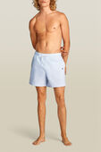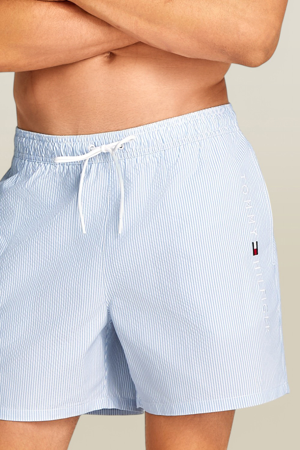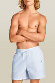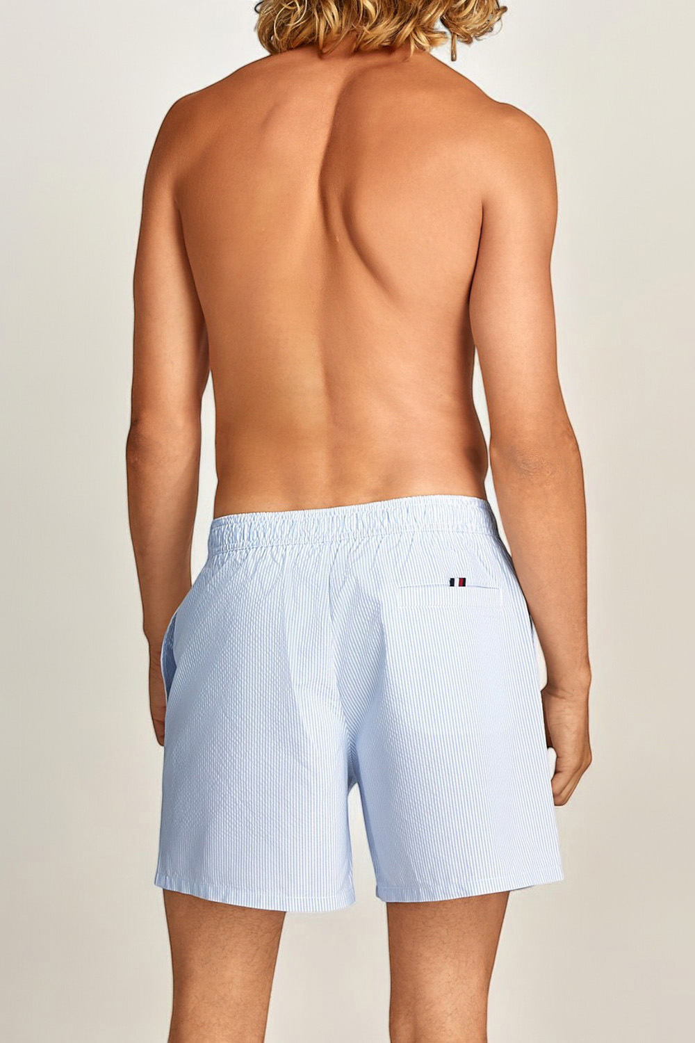מכנסי בגד ים מבית Tommy Hilfiger, עשויים פוליאסטר ממוחזר במרקם כותנה, בצבע תכלת ובדוגמת פסים עם לוגו בצד. יש להם בטנת רשת לבנה, חגורת מותניים אלסטית עם שרוך קשירה, שני כיסי צד וכיס אחורי בסגירת סקוטש.