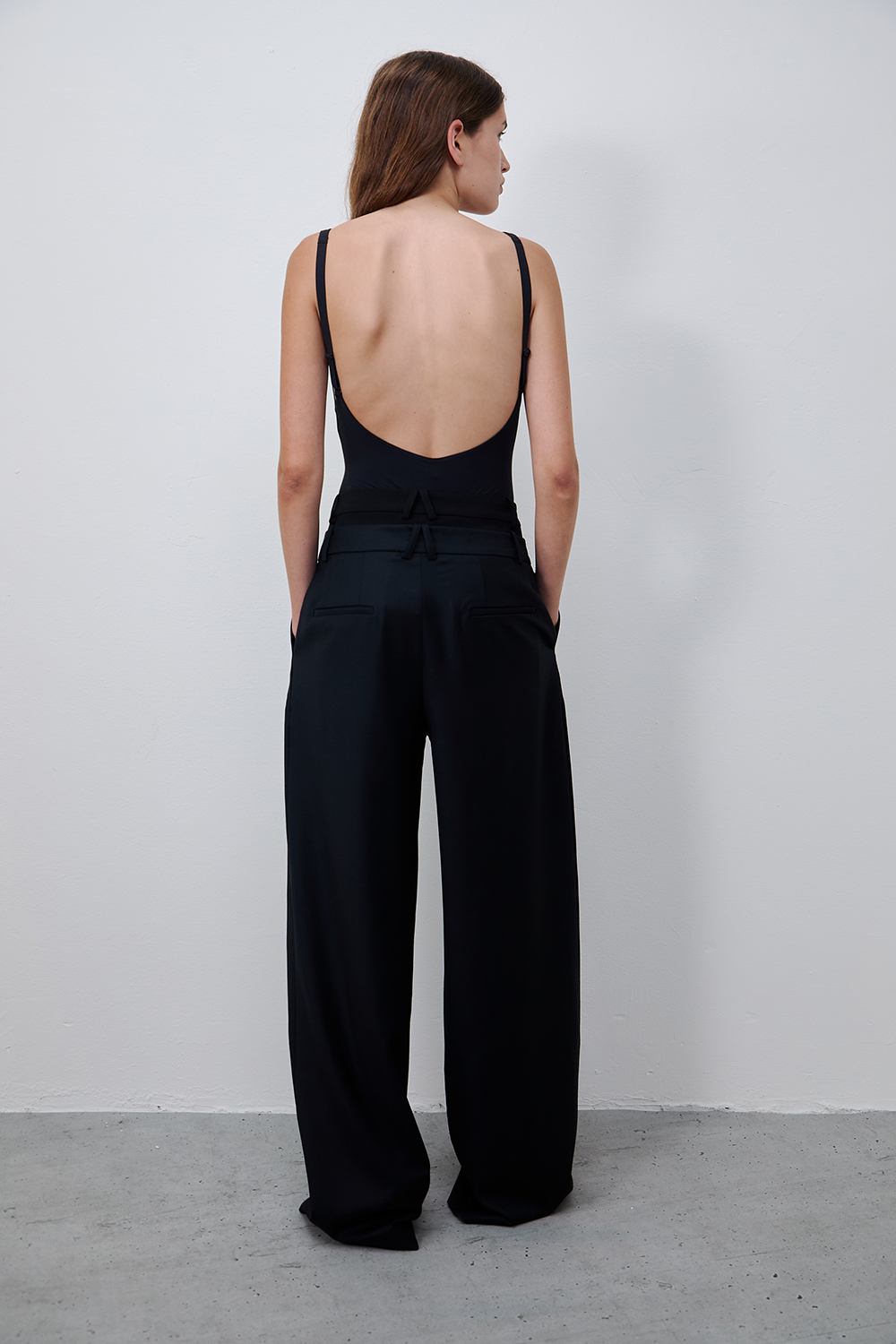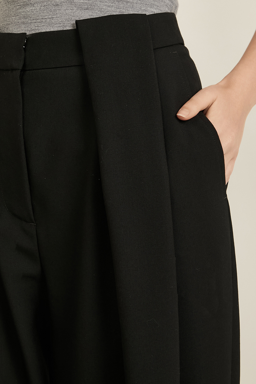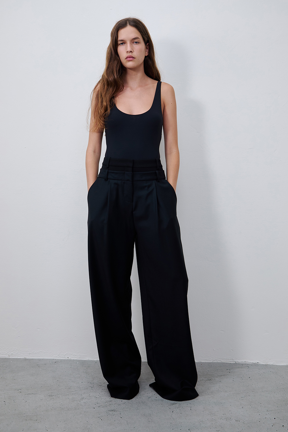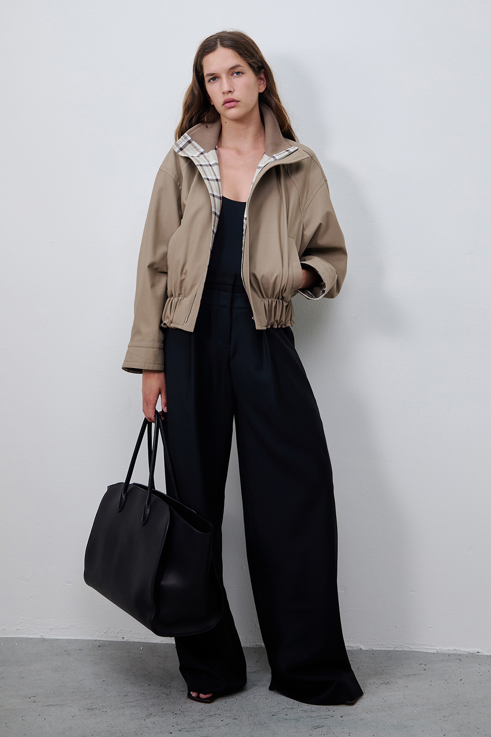 מכנסיים בגזרת בלון בעיצוב Stella Mccartney, המגלמים את נקודת מבטה הייחודית על השילוב בין גבריות לנשיות לקיץ 2025. הם עשויים תערובת ויסקוזה ופשתן ידידותיים לסביבה, במראה מחוייט, עם חיתוך מותניים נמוך, רגל ישרה ולולאות מכנסיים אוברסייז שהופכים לקפלים.