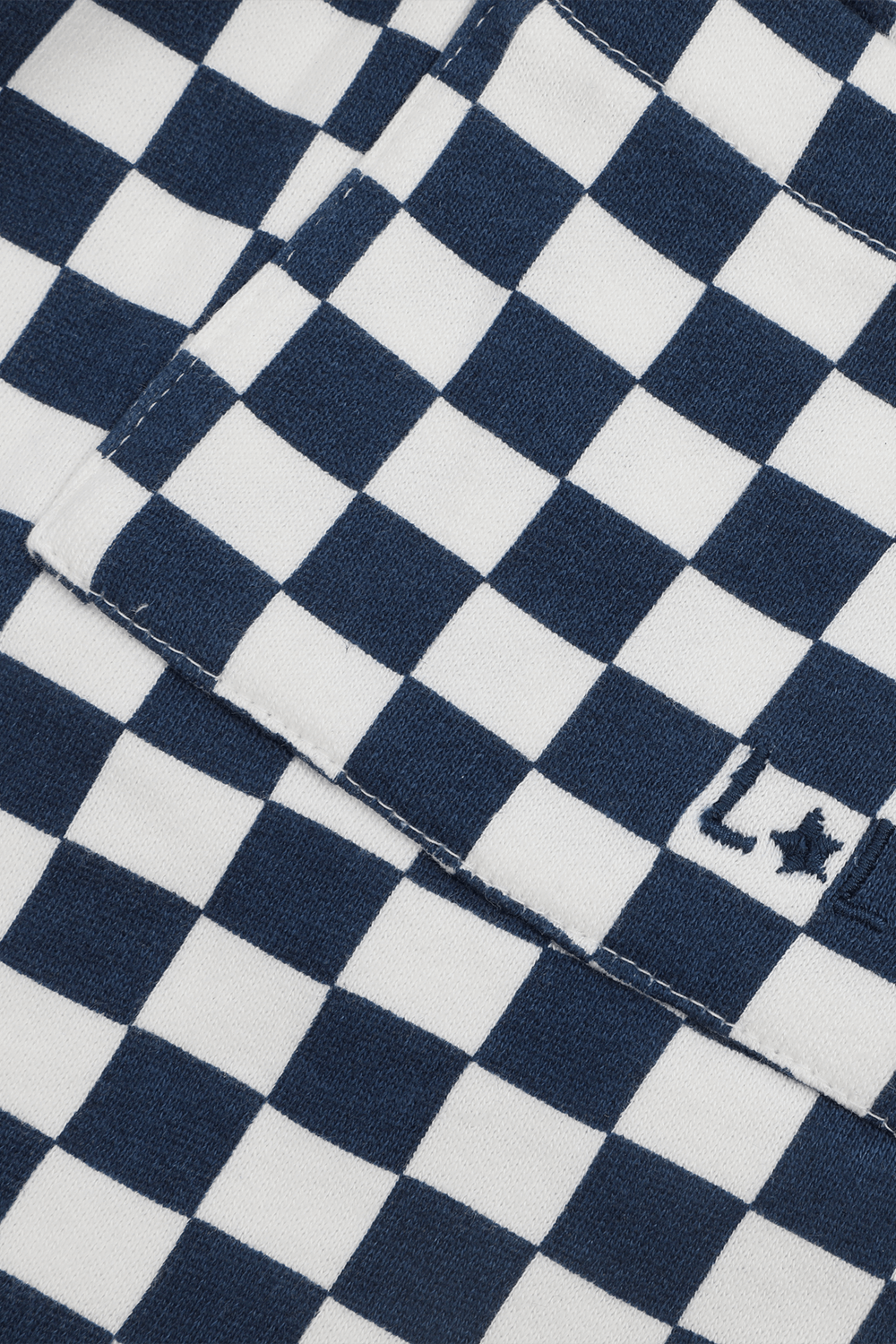 מכנסי ברמודה מבית Louis Louise מדגם Brooklyn העשויים כותנת פליז בהדפס משבצות בצבעי כחול ולבן. למכנסיים שרוכי קשירה, שני כיסי צד, וכיס אחורי.