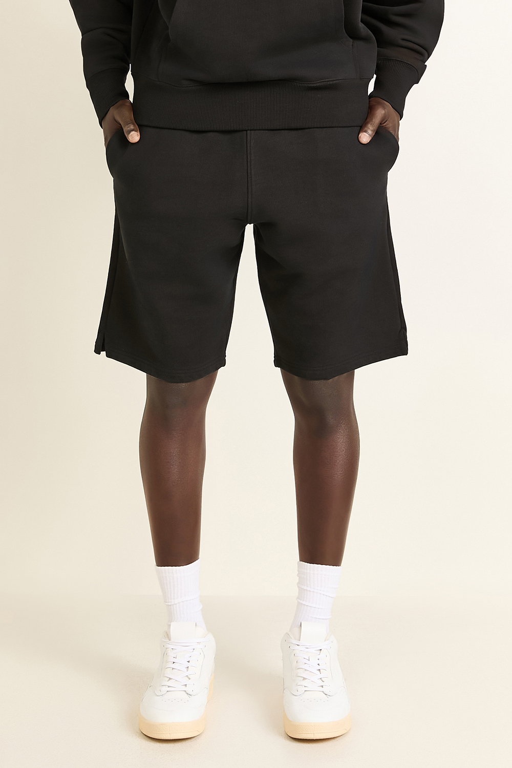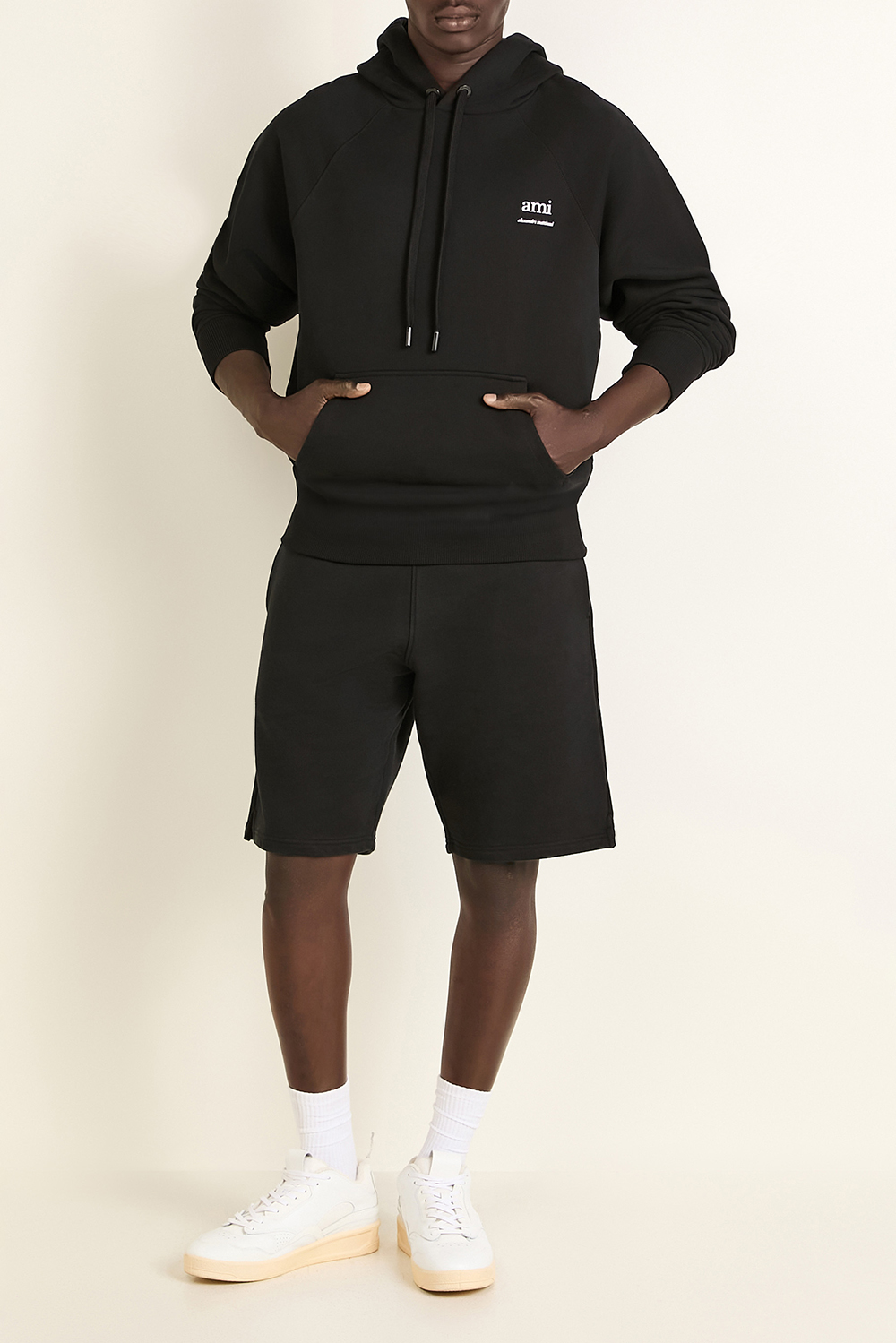 מכנסי ברמודה מבית Ami Paris, עשויים כותנת פרנץ' טרי אורגנית בצבע שחור עם שרוך קשירה בחגורת המותניים.