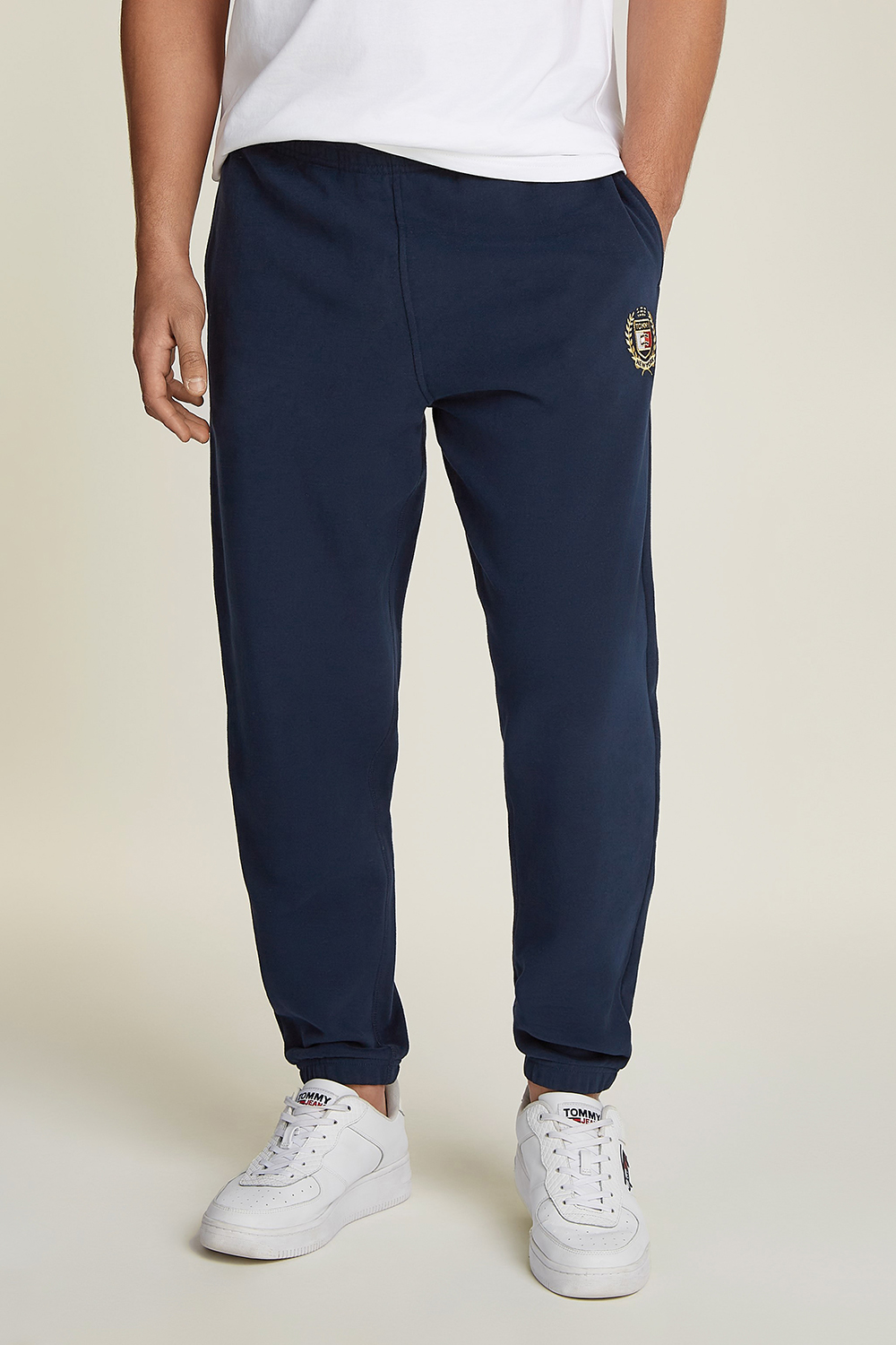 מכנסי ג'וגר מבית Tommy Hilfiger, עשויים כותנה מחודשת בצבע כחול עם לוגו רקום, ובשילוב קו מותניים אלסטי ושרוך קשירה להידוק. למכנסיים שני כיסי צד וכיס אחורי.