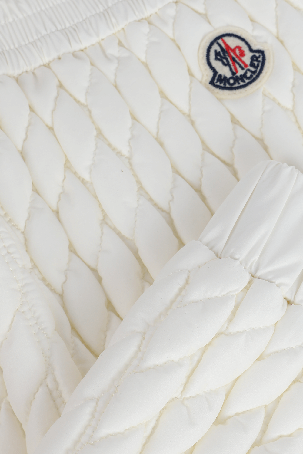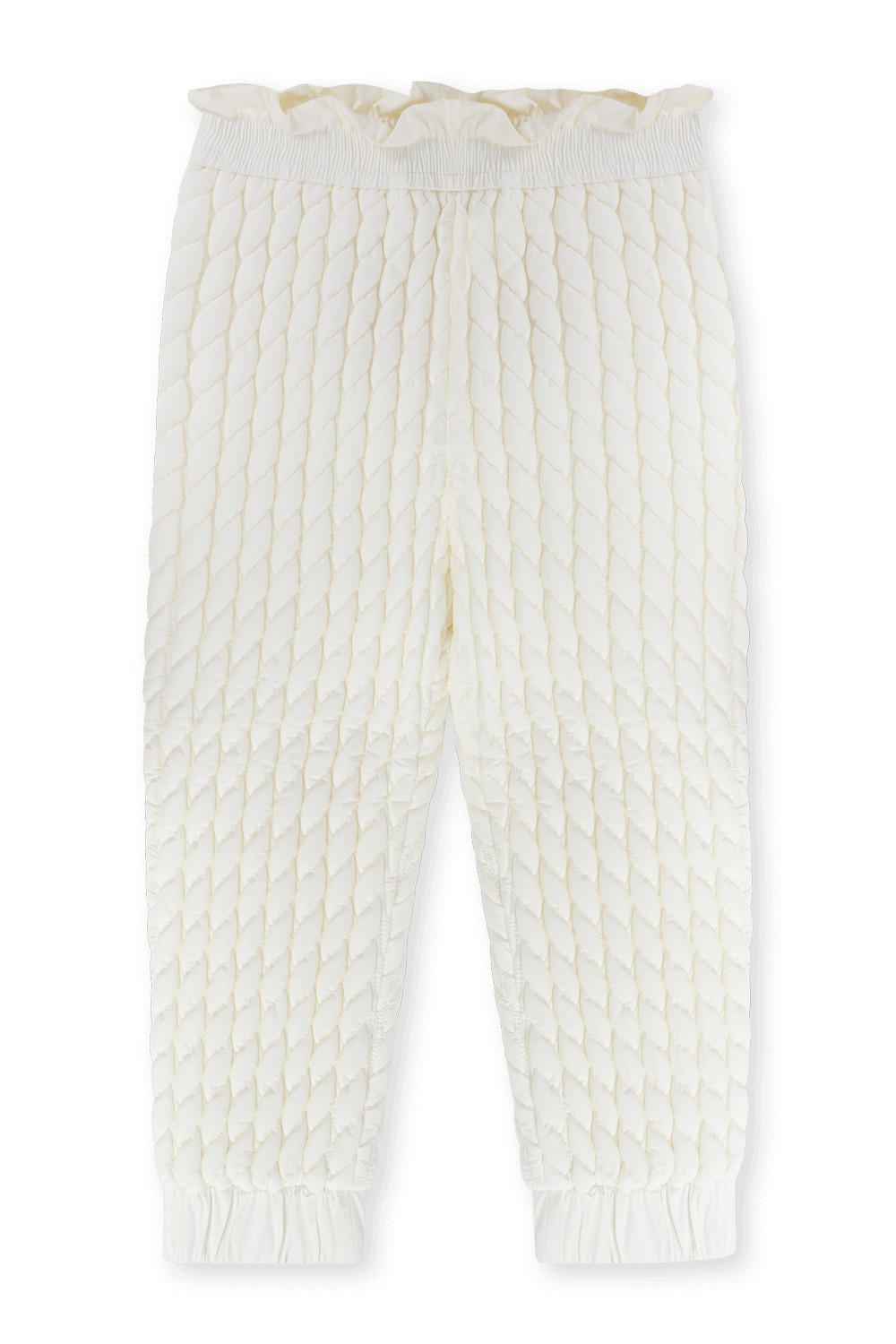 מכנסי ג`וג ארוכים מבית המותג Moncler Kids, העשויים כותנה איכותית בצבע לבן ובמראה צמות סרוג. לפריט חגורת מתניים אלסטית בעלת סיומת מלמלה לצד שרוולים מכווצים, כאשר לוגו פאץ` המותג מצורף מאחור.