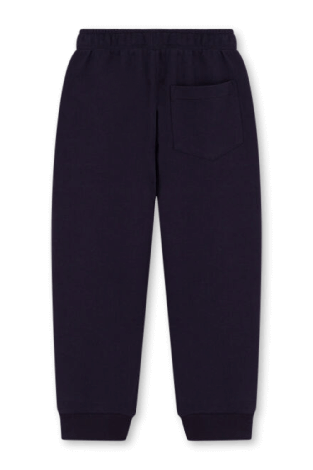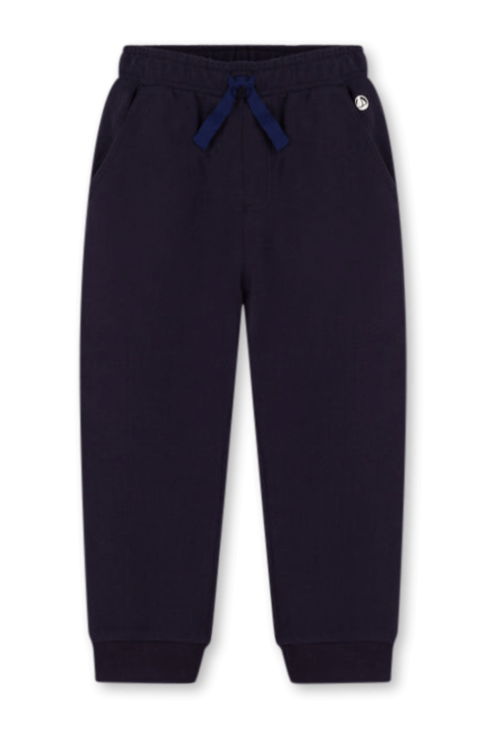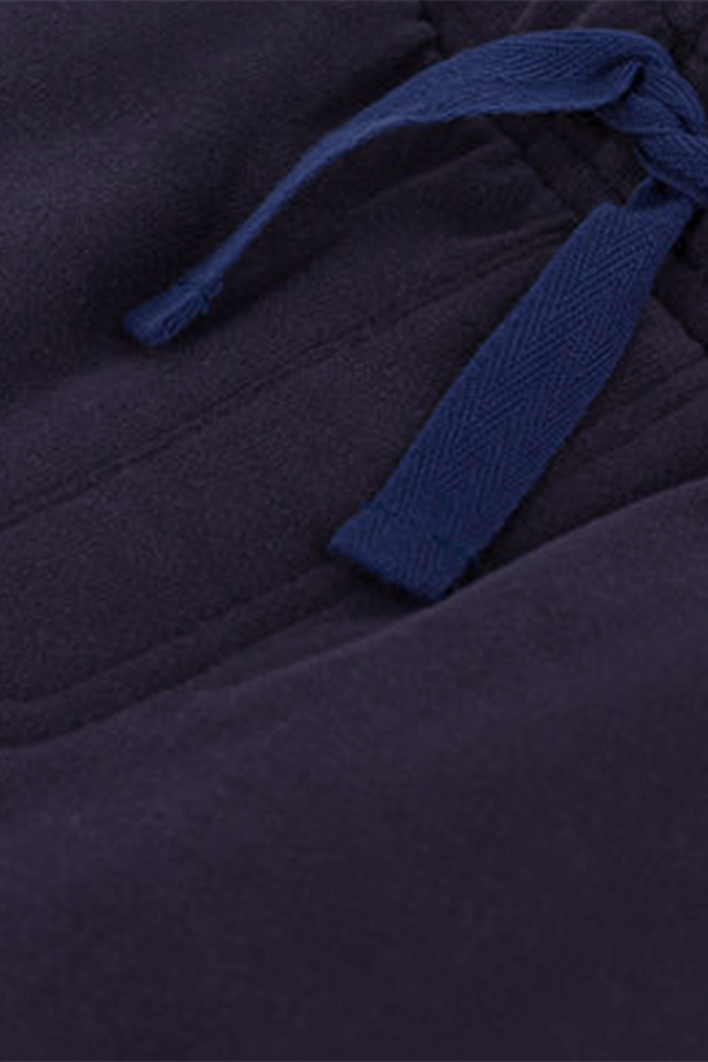 מכנסי ג'וג בעיצוב המותג הצרפתי Petit Bateau העשויים כותנת פליז אורגנית ומחממת בצבע כחול נייבי. למכנסיים גזרה נינוחה עם אמרות מהודקות, חגורת מתניים גמישה עם שרוכים, שני כיסי צד וכיס אחורי.