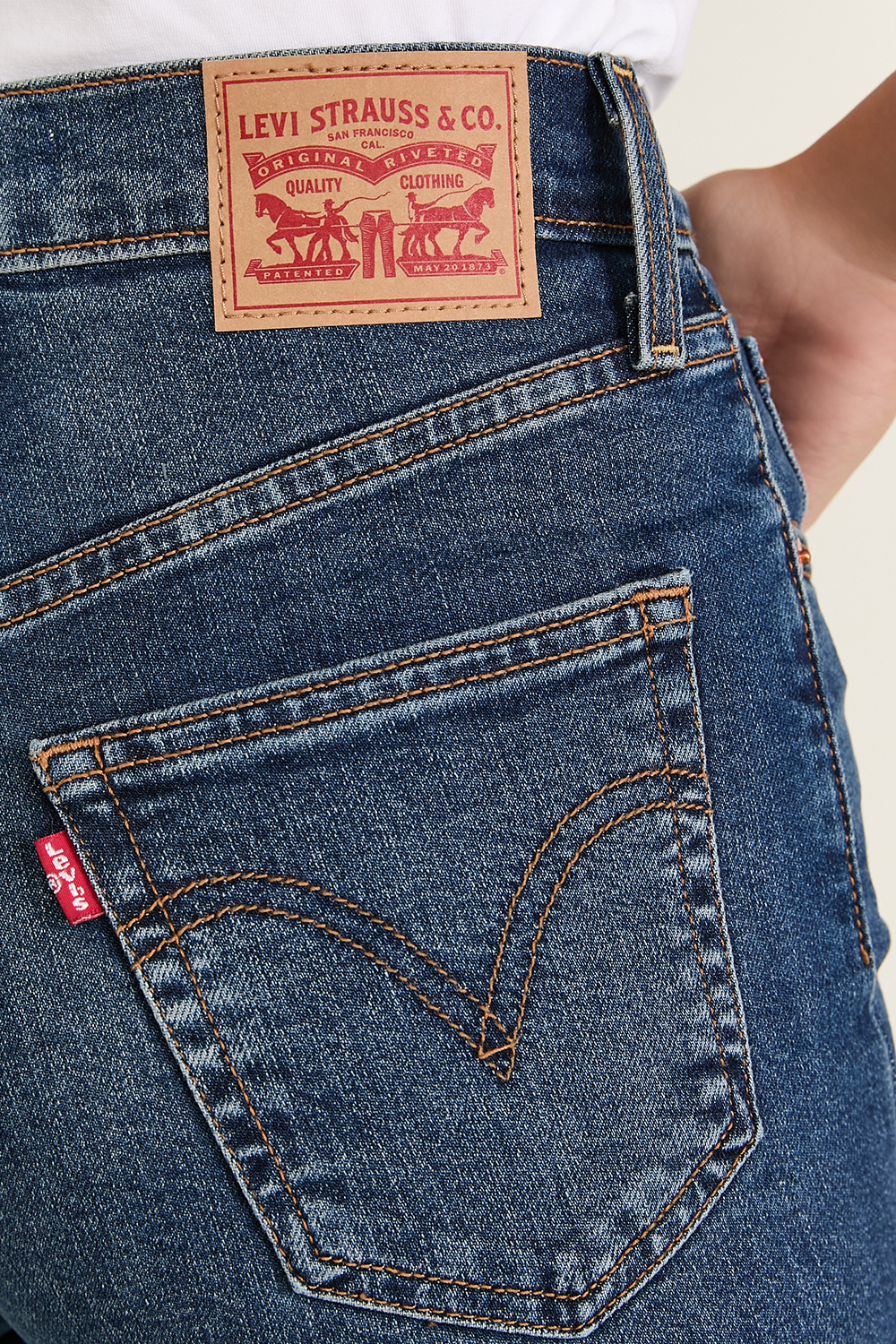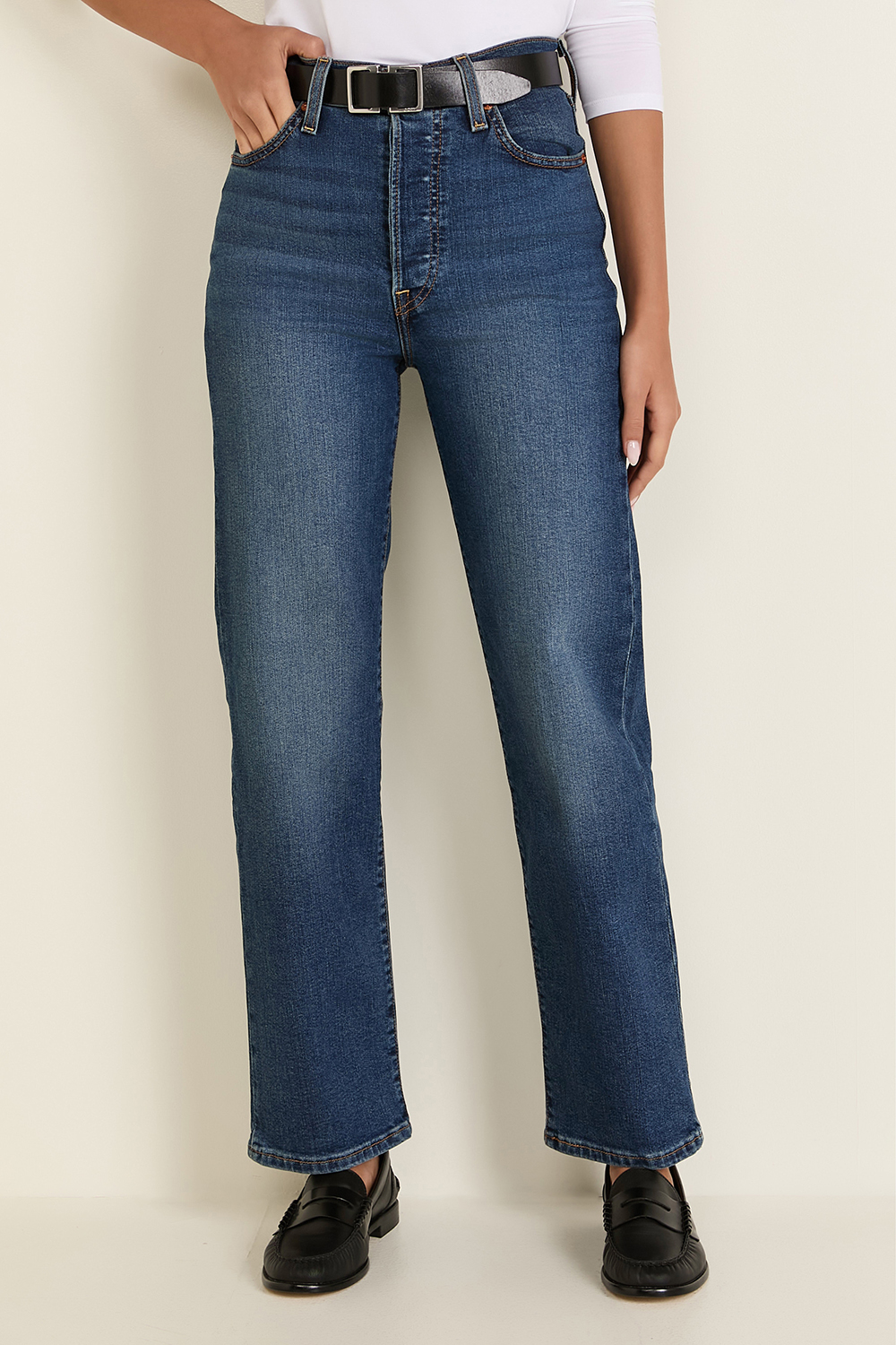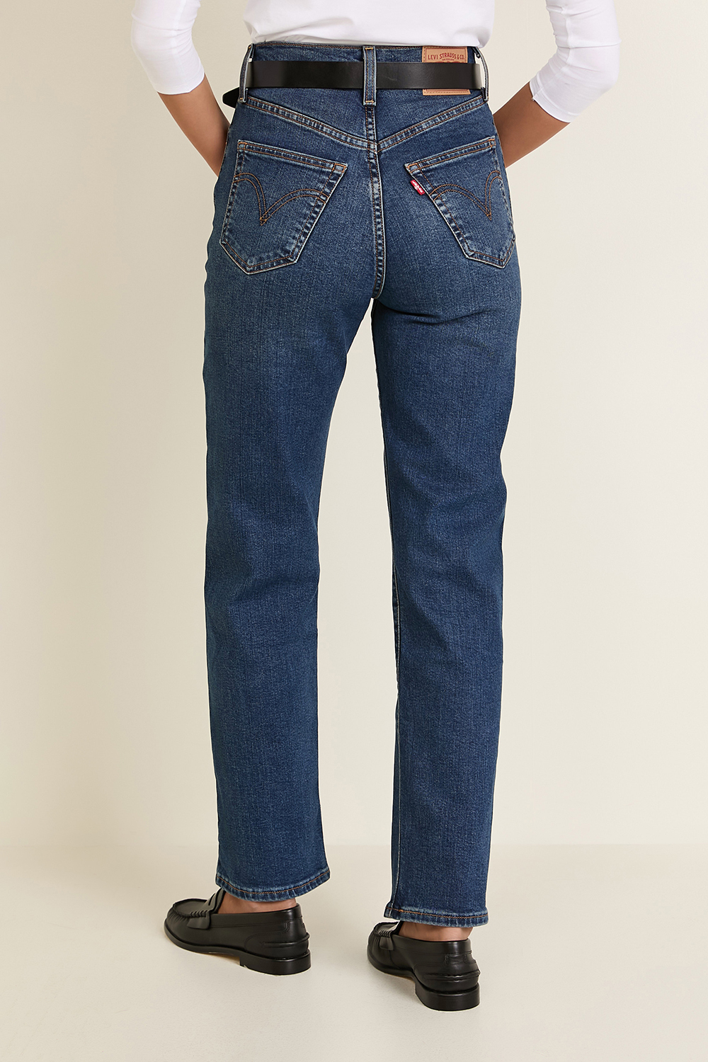 מכנסי ג'ינס Ribcage Full Length מבית Levi's, עשויים תערובת כותנת דנים ופוליאסטר בצבע כחול משופשף ובגזרה ישרה באורך מלא.