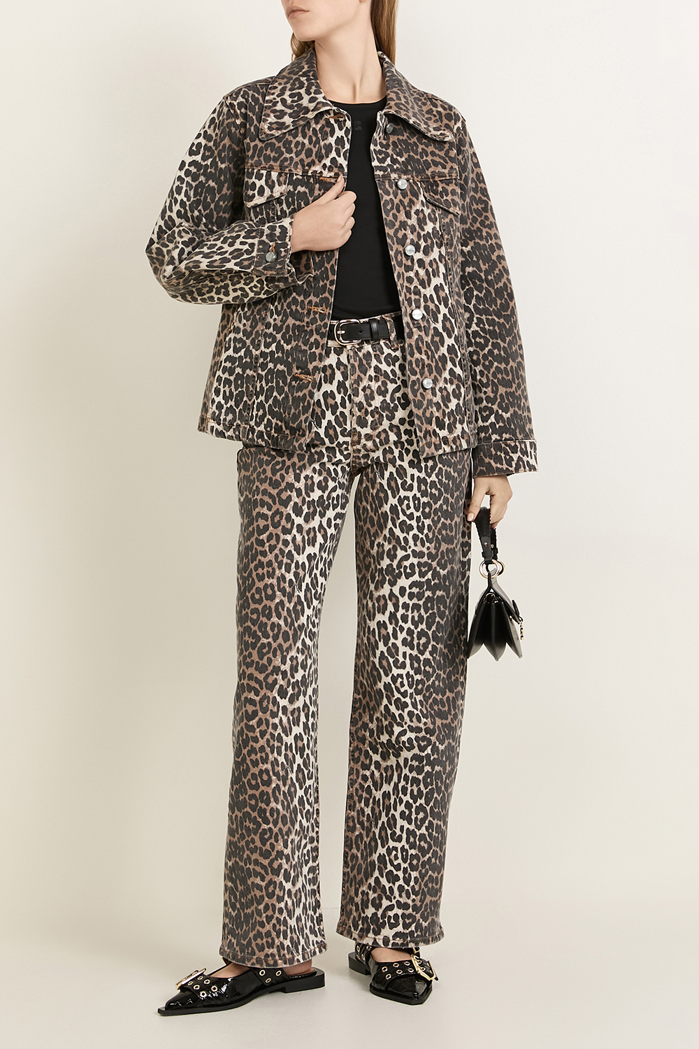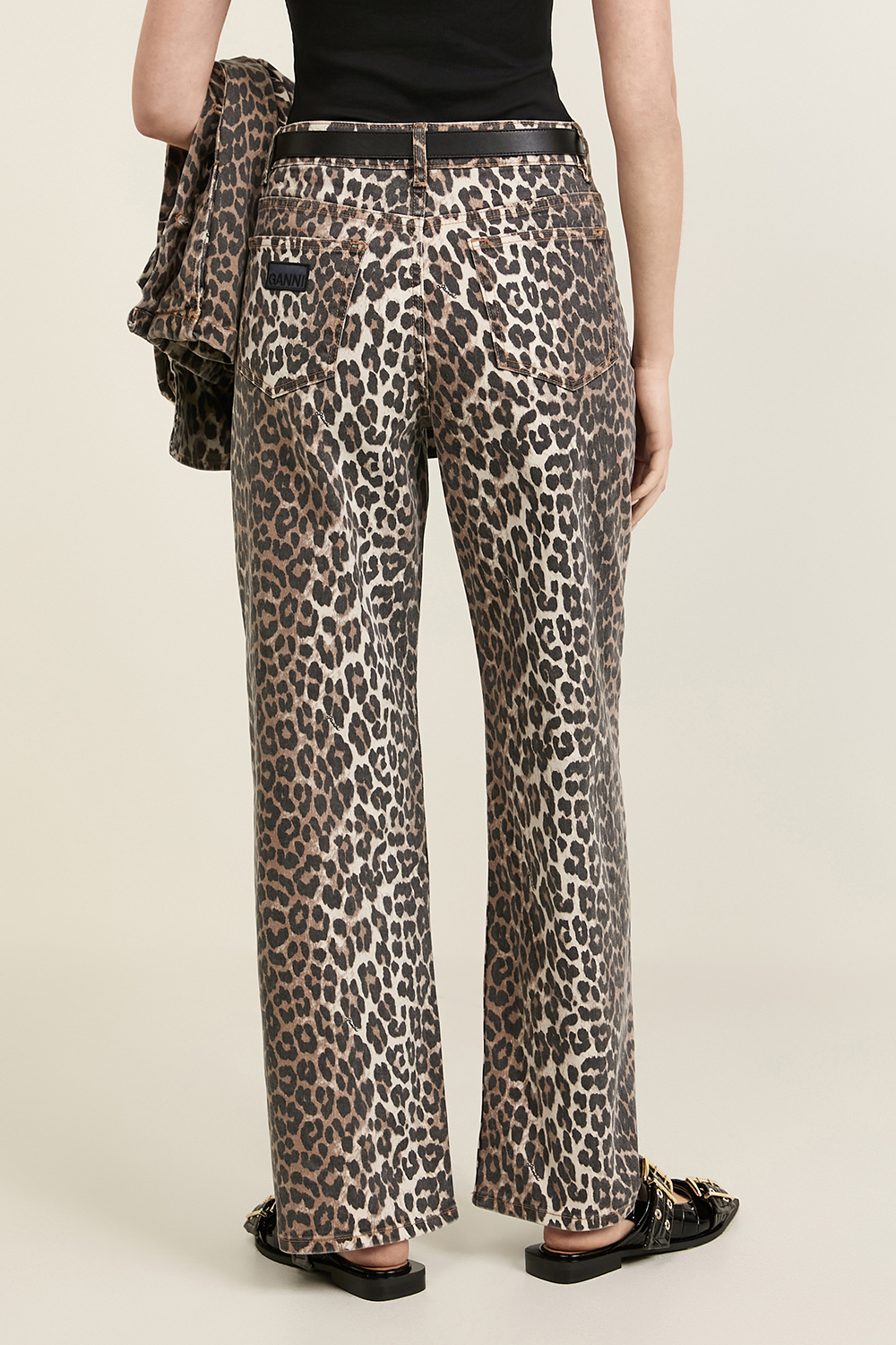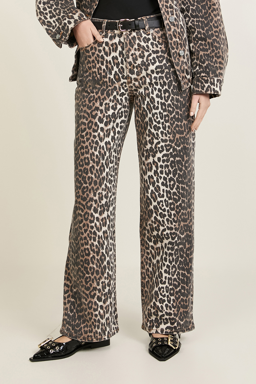 מכנסי ג'ינס מבית Ganni, עשויים כותנת דנים אורגנית בדוגמת חברבורות בצבעי חום ושחור ובגזרה ישרה ומשוחררת.