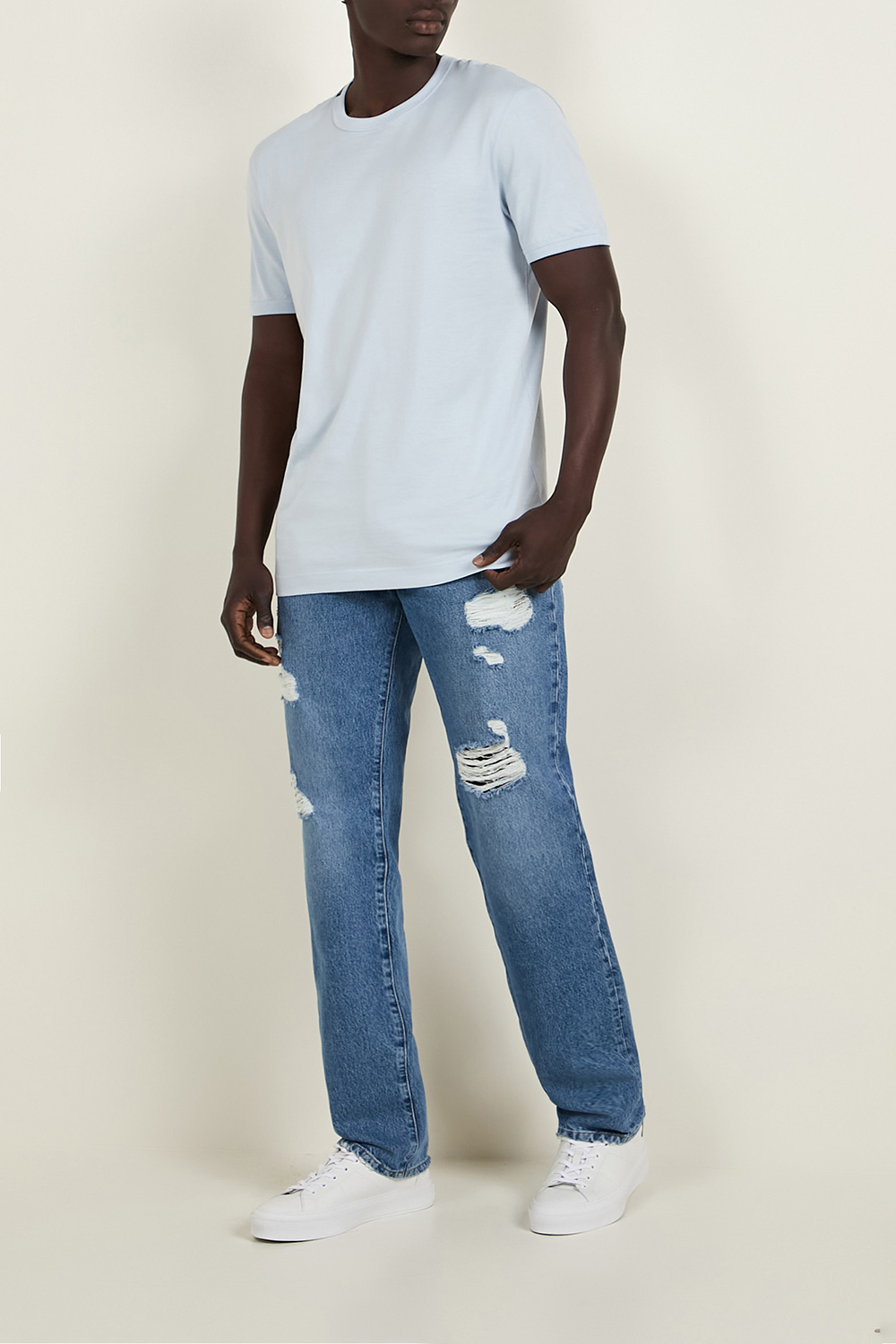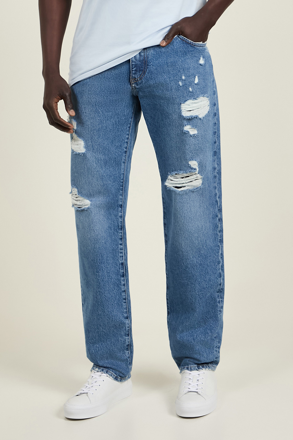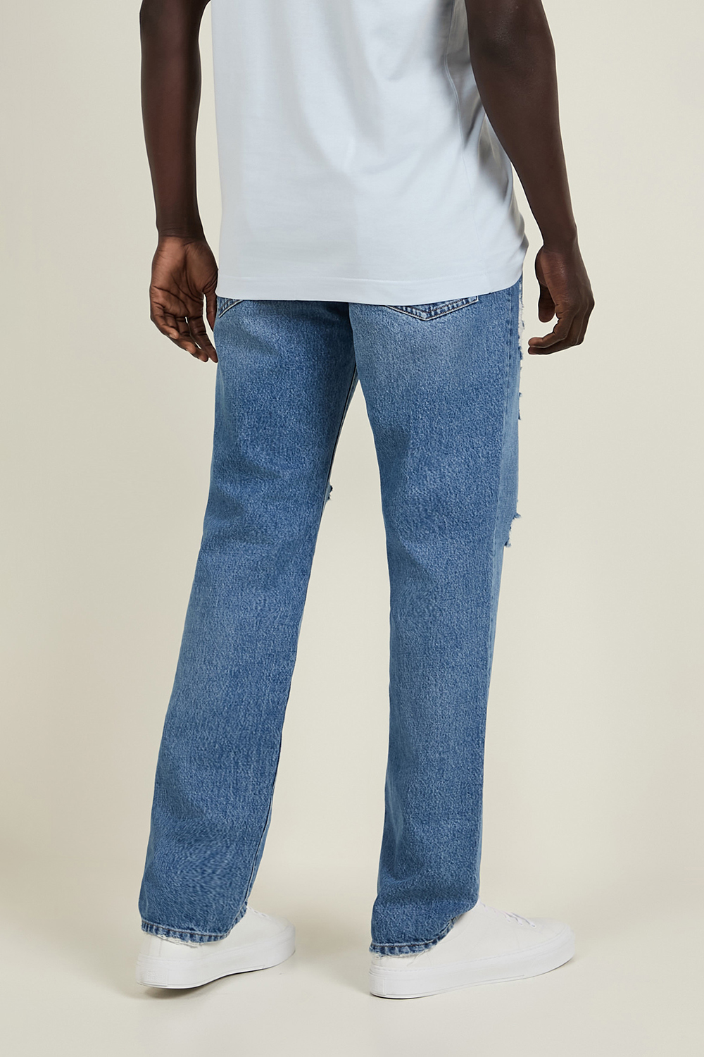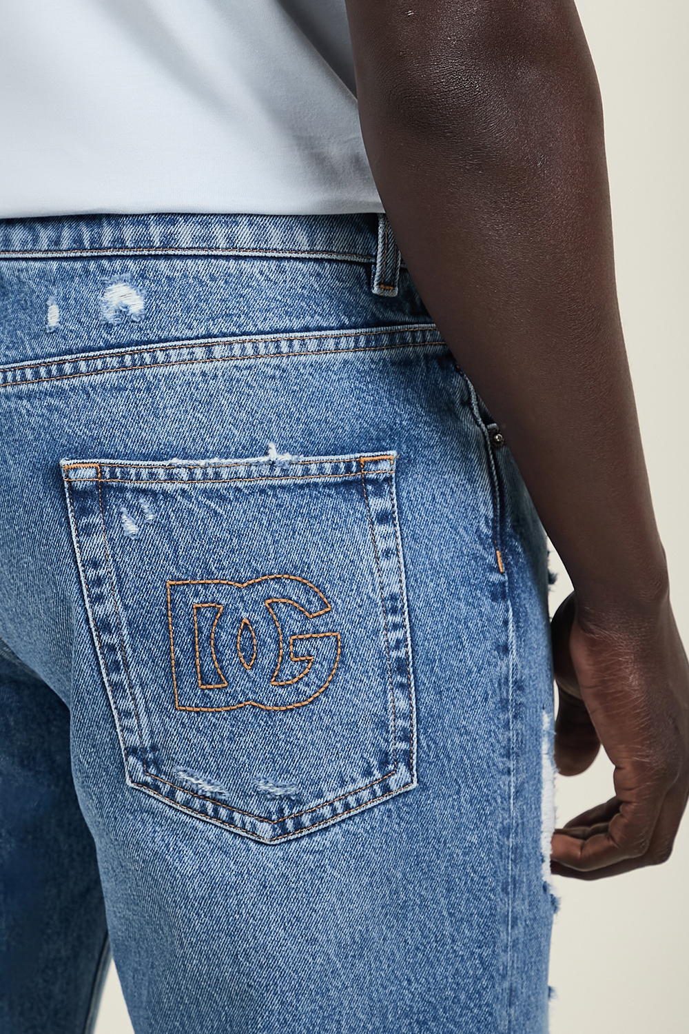 מכנסי ג'ינס בגזרה ישרה מבית Dolce&Gabbana, עשויים כותנת דנים בצבע כחול בעיצוב קרעים. נסגרים ברוכסן.