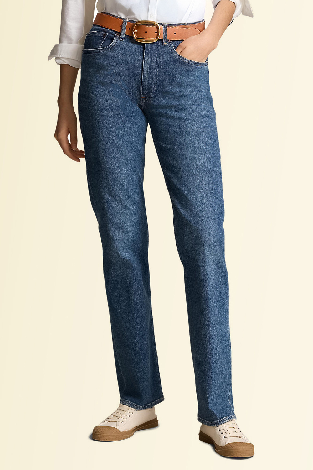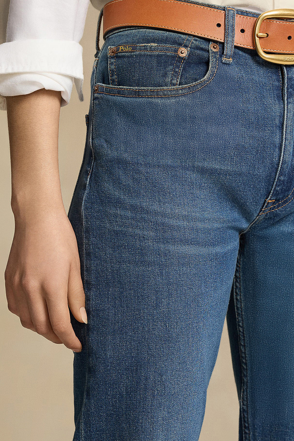 מכנסי ג'ינס בגזרה ישרה מבית Polo Ralph Lauren, עשויים תערובת כותנת דנים ואלסטן בצבע כחול ובעיצוב מעט משופשף.