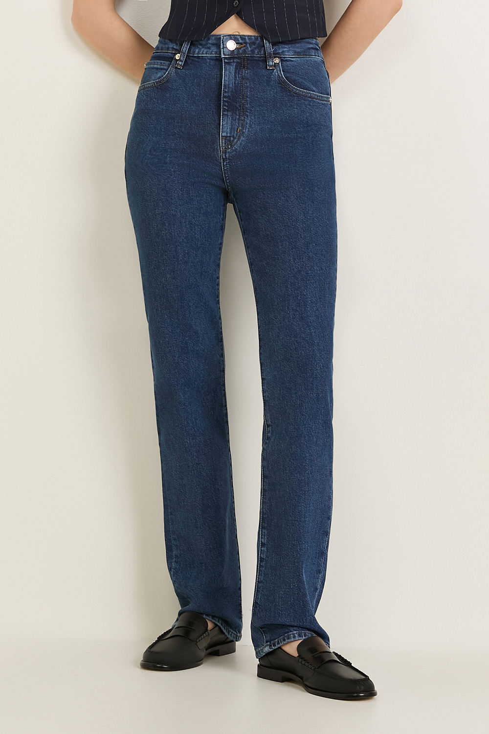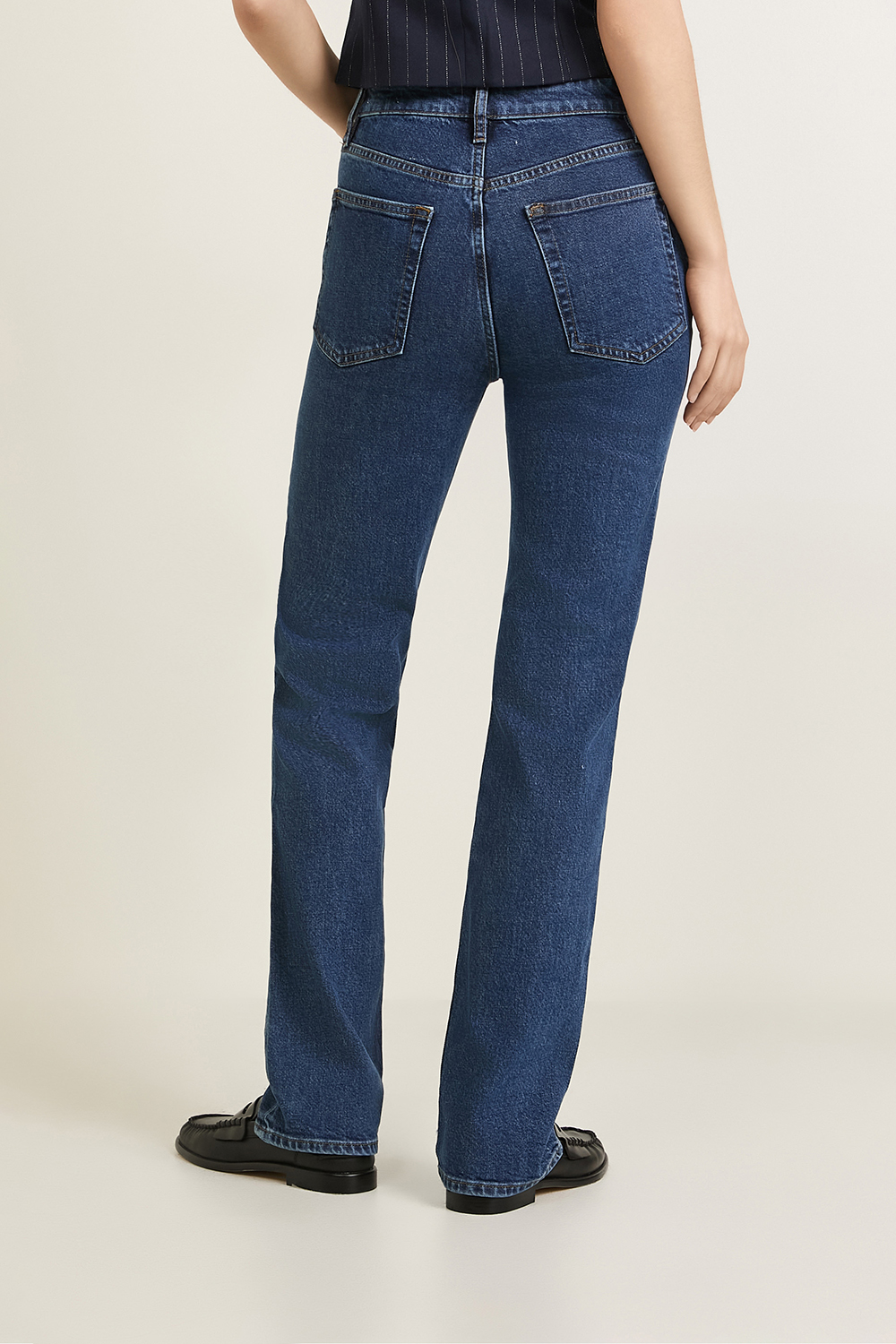 מכנסי ג'ינס מבית Frame, עשויים תערובת כותנת דנים ואלסטן בצבע כחול ובגזרה ישרה בהשראת מראה וינטג'.