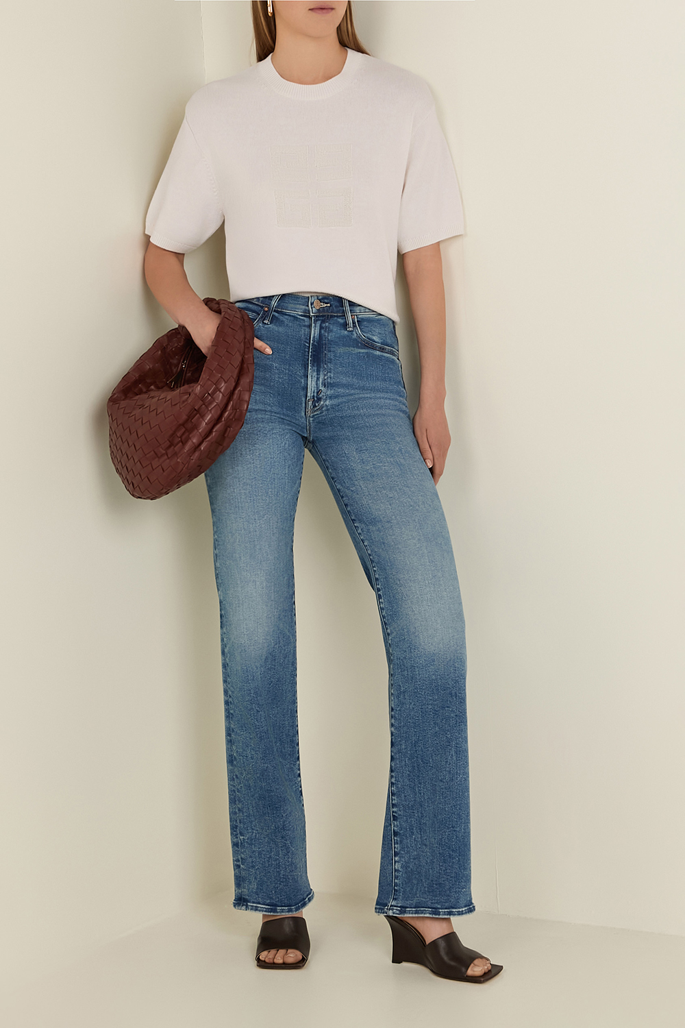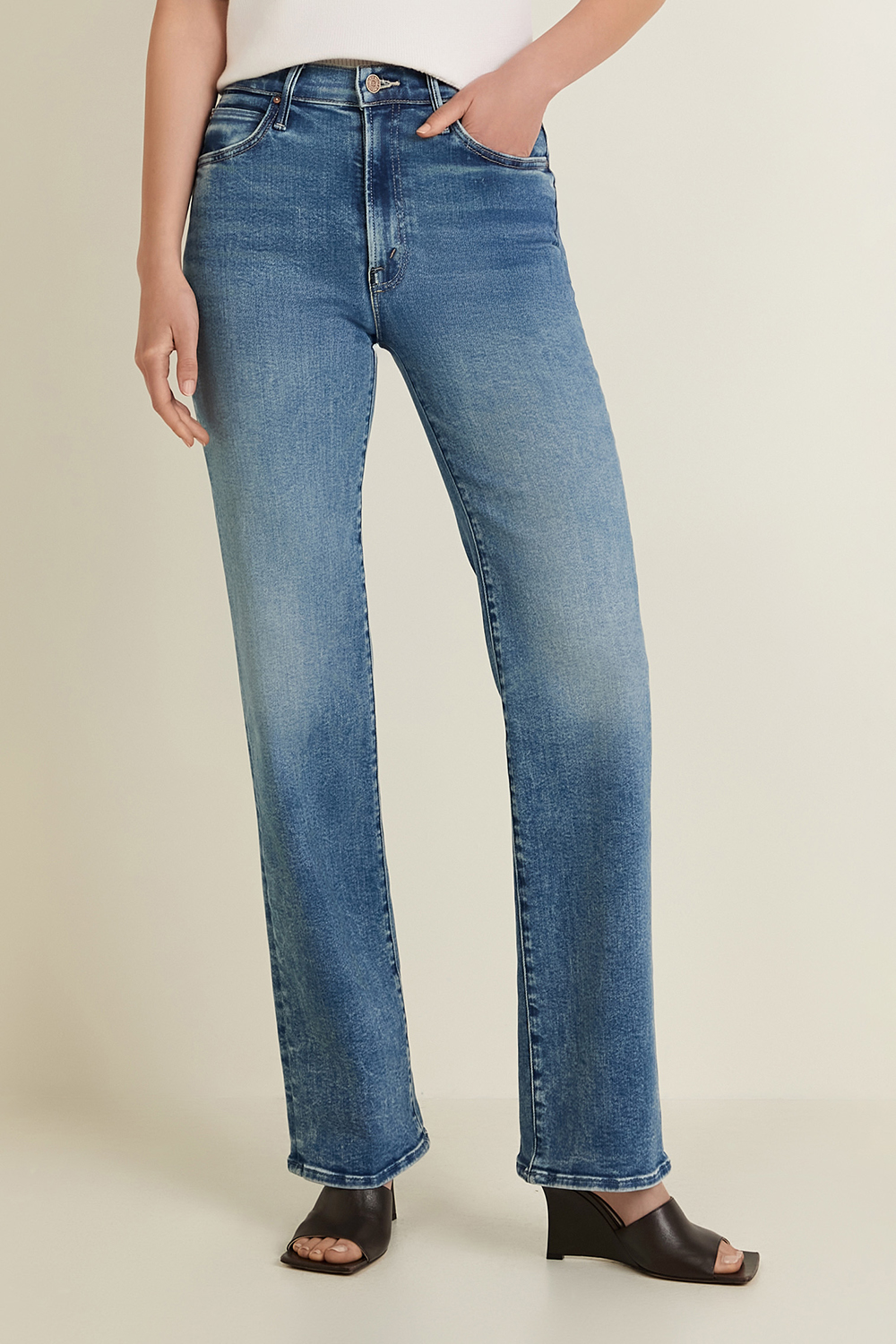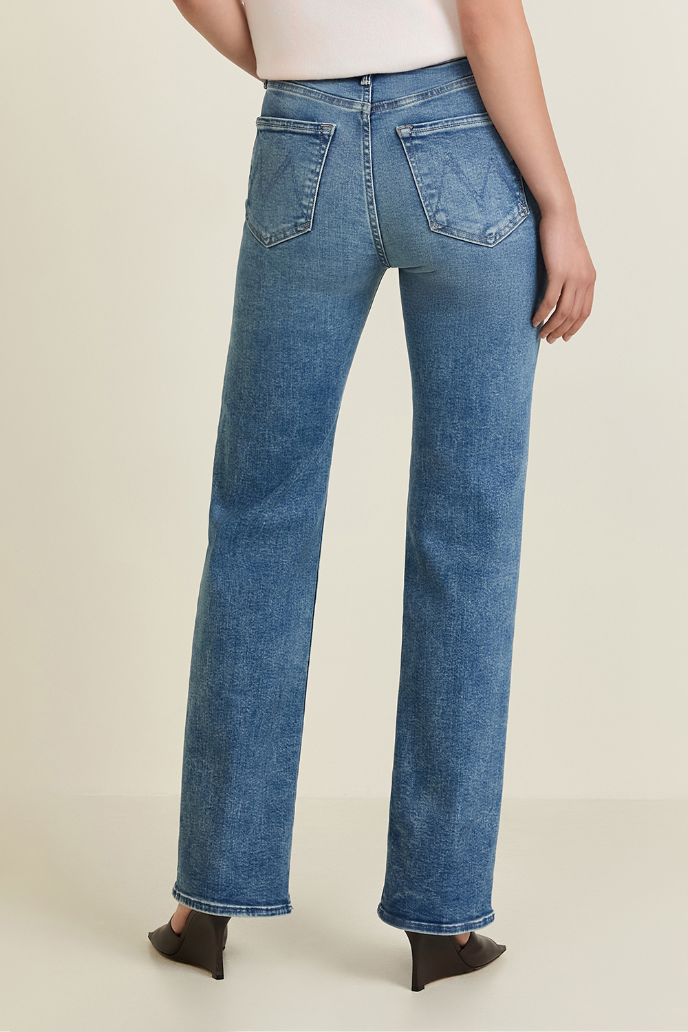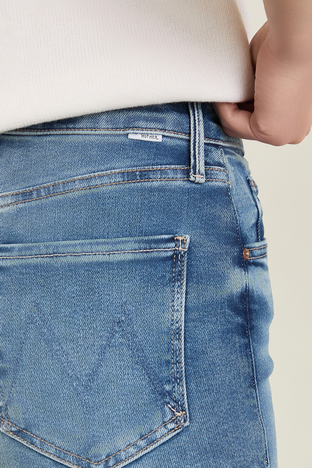 מכנסי ג'ינס The Kick It בגזרה ישרה מבית Mother, עשויים כותנת דנים בצבע כחול בקו מותניים גבוה. מיוצרים בלוס אנג'לס.