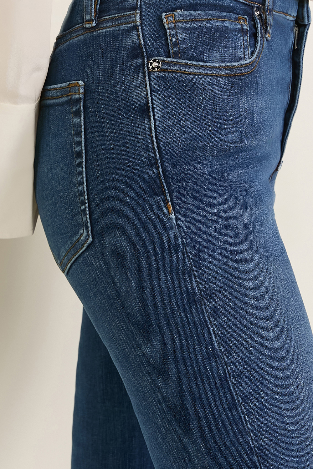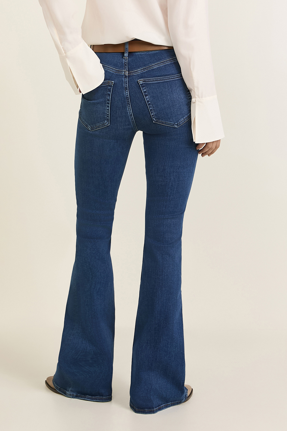 מכנסי ג'ינס בגזרה גבוהה ומתרחבת מבית Frame, עשויים תערובת כותנת דנים אורגנית ופוליאסטר בצבע כחול.