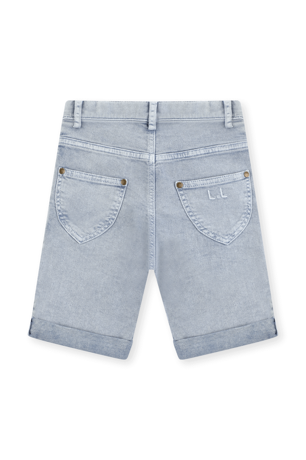מכנסי ג`ינס מבית Louis Louise. המכנסיים עשויים מתערובת כותנת דנים גמישה בצבע כחול בהיר ובגזרת ברמודה עם אמרות מקופלות ולוגו רקום על גבי הכיס האחורי.