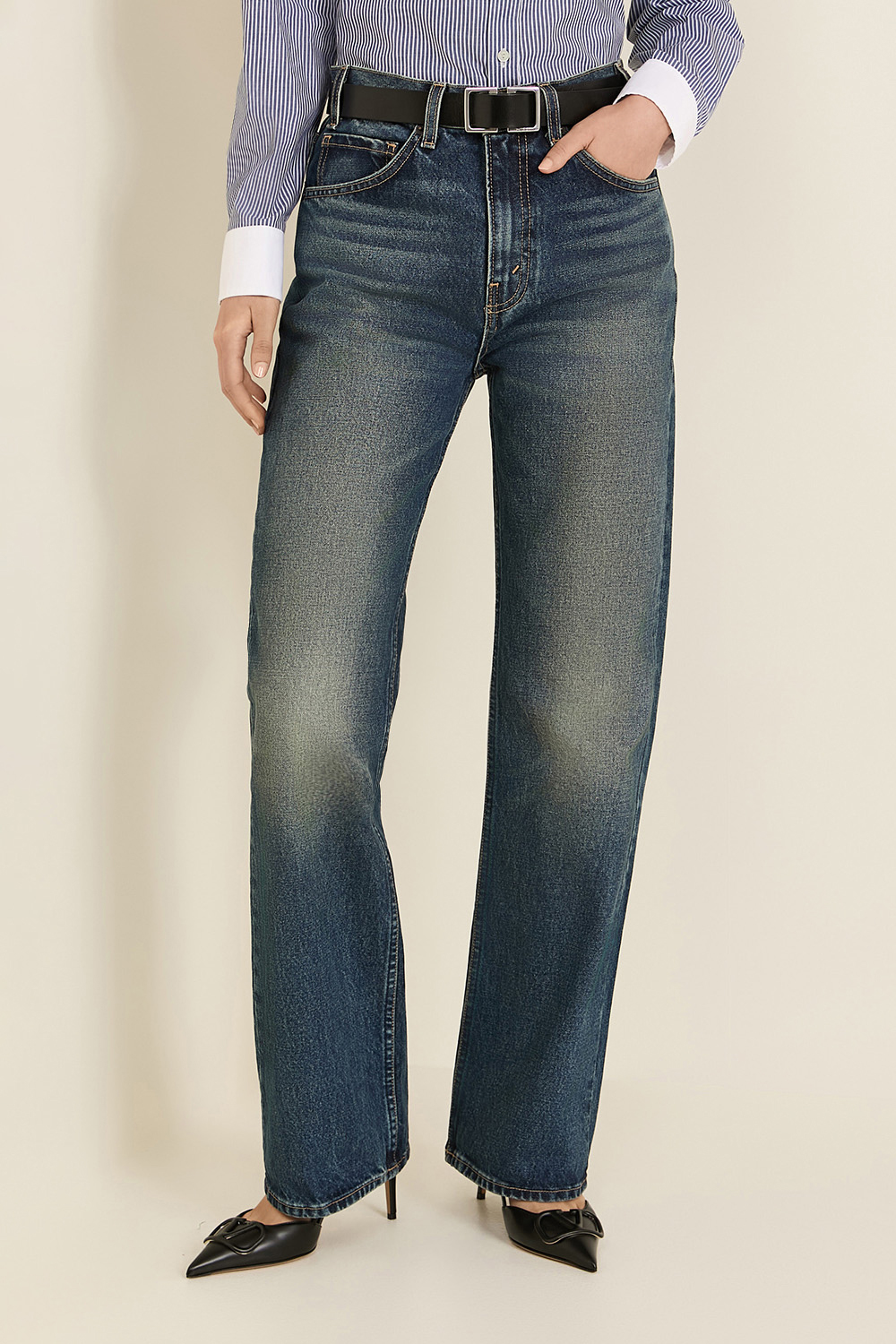מכנסי ג'ינס Mitchell מבית Nili Lotan, עשויים כותנת דנים יפנית לא סטרצ'ית בצבע כחול כהה, בגזרה משוחררת וקו מותניים בינוני. נסגרים ברוכסן.
