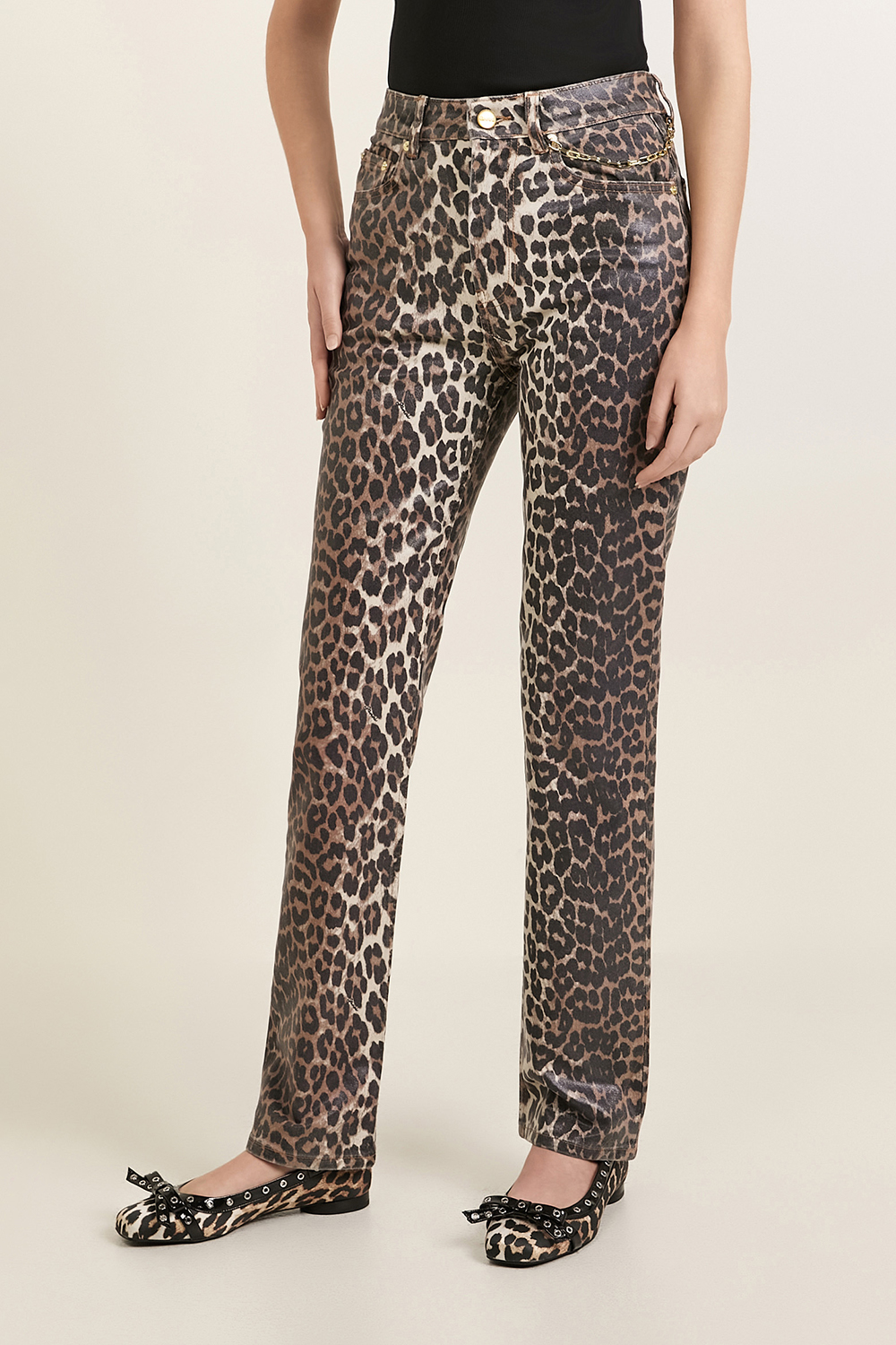מכנסי ג'ינס בגזרה ישרה מבית Ganni, עשויים כותנת דנים אורגנית בהדפס מנומר באפקט מעט מבריק. הם נסגרים ברוכסן וכפתור מעוצב, ובכיס השמאלי משולבת שרשרת זהב קצרה הניתנת להסרה.