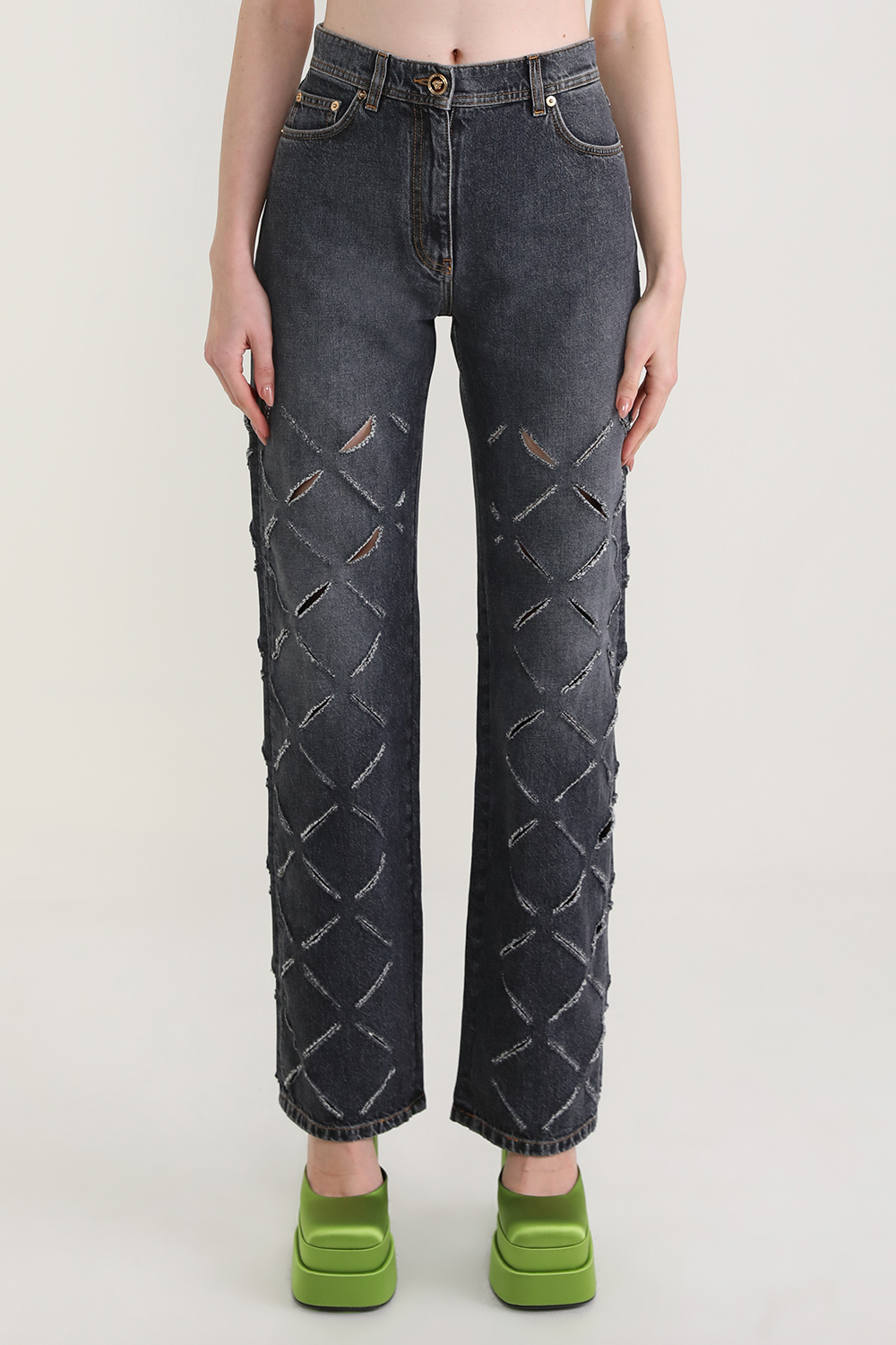 "מכנסי ג`ינס ארוכים בעיצוב בית האופנה היוקרתי Versace, העשויים כותנת דנים חזקה ונעימה בגוון אפור משופשף, ומציגים גזרה רחבה ומחמיאה, בעלת רכיסת כפתור מטאלי בדמות המדוזה בגוון זהוב. לפריט חיתוכים דקים וחזרתיים בצורת יהלומים לכל אורכו, לצד חמישה כיסים ולוגו פאץ` אחורי מעור."