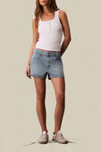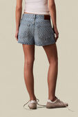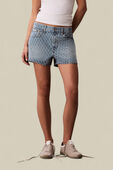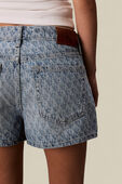 מכנסי ג'ינס קצרים מבית Calvin Klein, המעוצבים בהשראת שנות ה-90. הם עשויים כותנת דנים בצבע כחול-דגרדה ובהדפס לוגו.