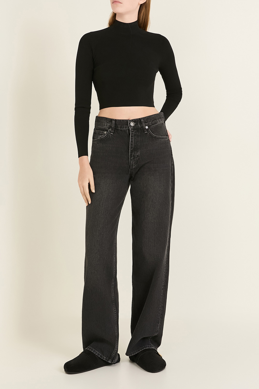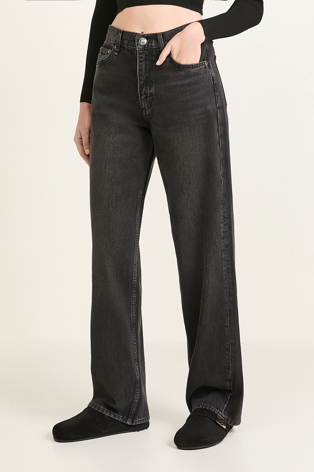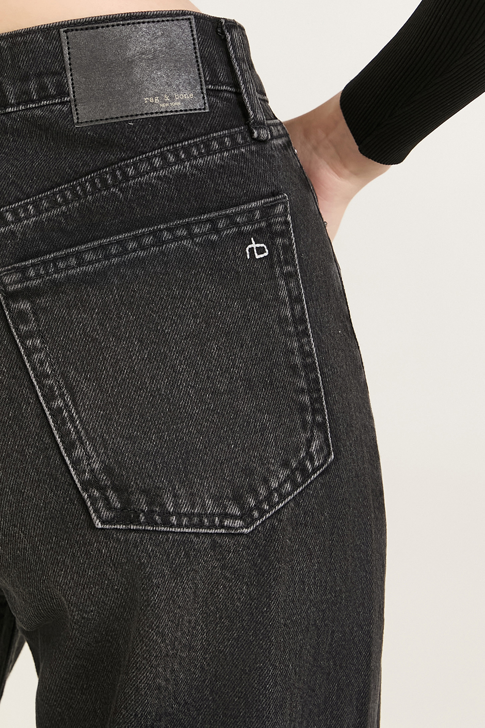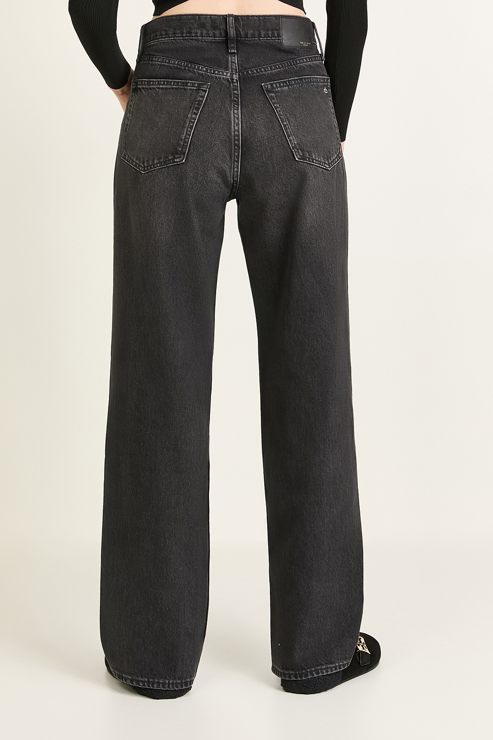 מכנסי ג׳ינס דגם Shea High Rise Relaxed Straight Full Length מבית האופנה Rag&Bone. הם עשויים כותנת דנים בצבע שחור בקו מותניים גבוה ובגזרה משוחררת.