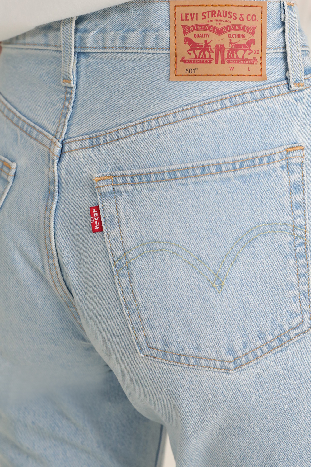 מכנסי ג'ינס מדגם 501 מבית Levi's, עשויים כותנת דנים בצבע כחול בהיר בעיצוב קרעים ובגזרה ישרה. ניתן לשלב את המכנסיים עם חולצת טי בגזרה נינוחה למראה קז'ואלי.