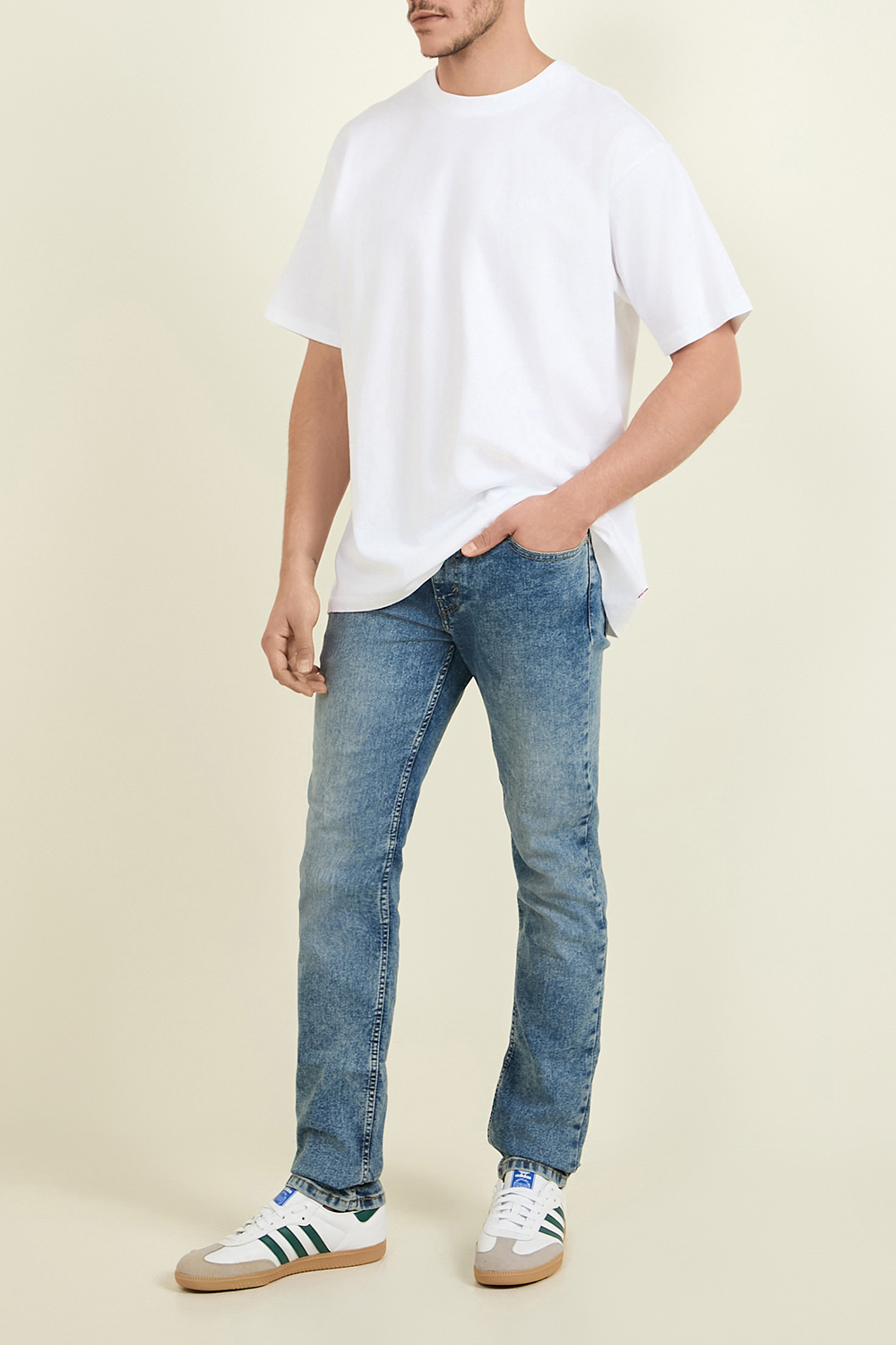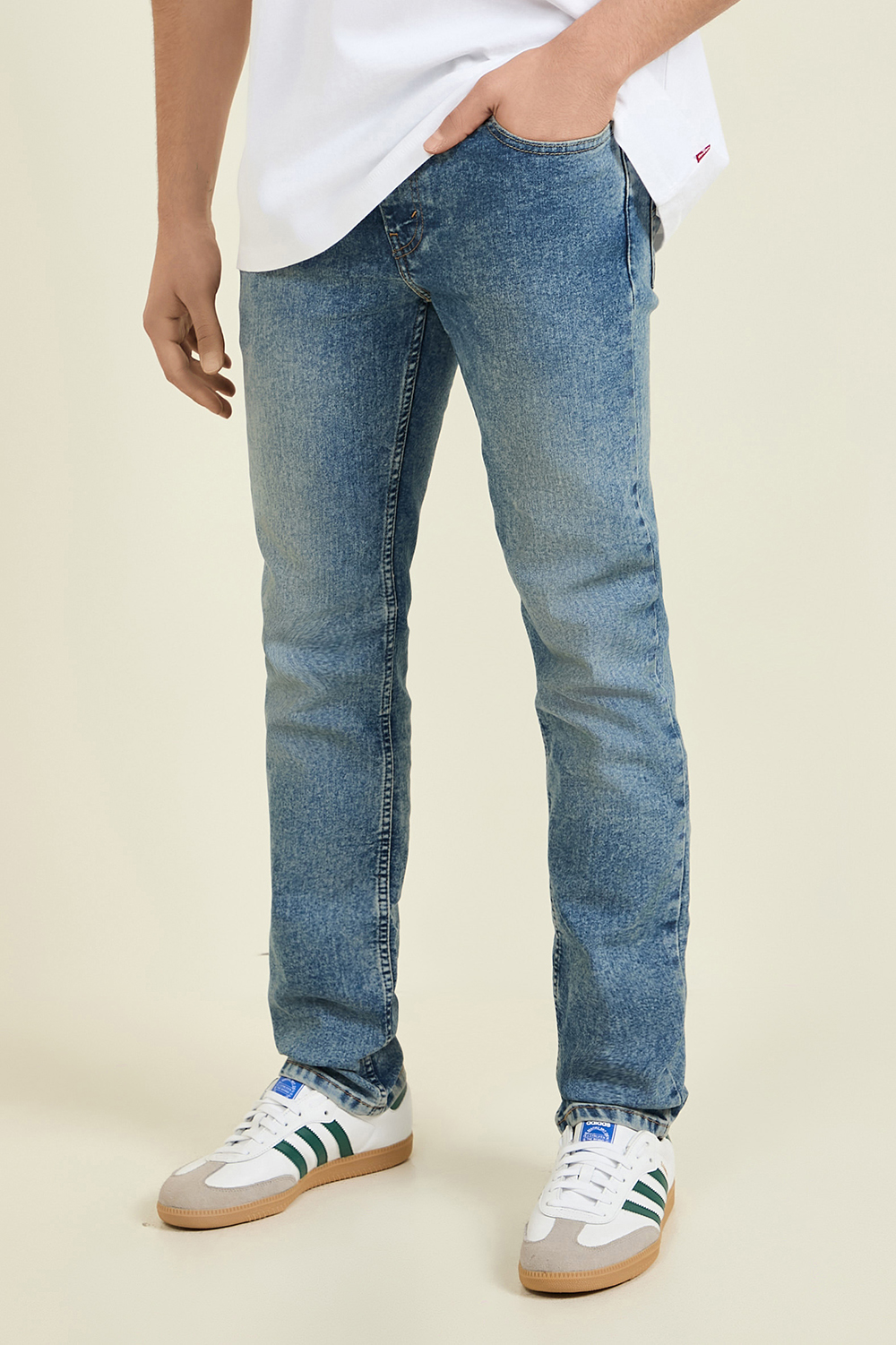 מכנסי ג'ינס בגזרת סלים ובגובה מותניים נמוך דגם Slim Fit 511 מבית Levi's. הם עשויים כותנת דנים בצבע כחול מעט משופשף.