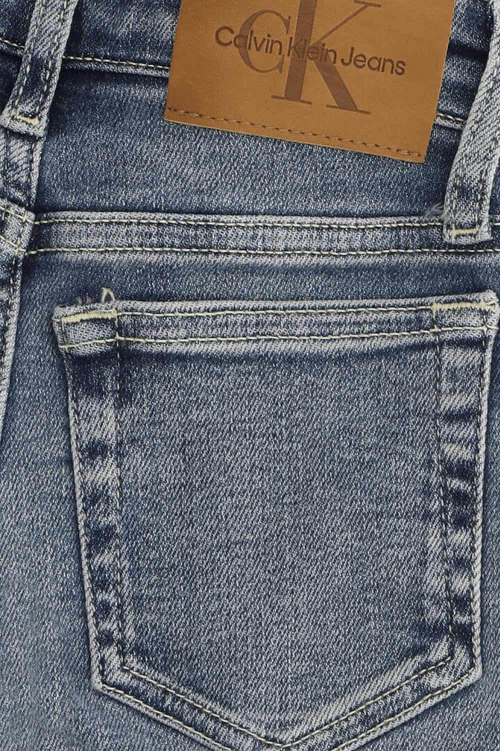 מכנסי ג'ינס מבית Calvin Klein, עשויים כותנת דנים ממוחזרת ואלסטן בצבע כחול ובעיצוב משופשף.