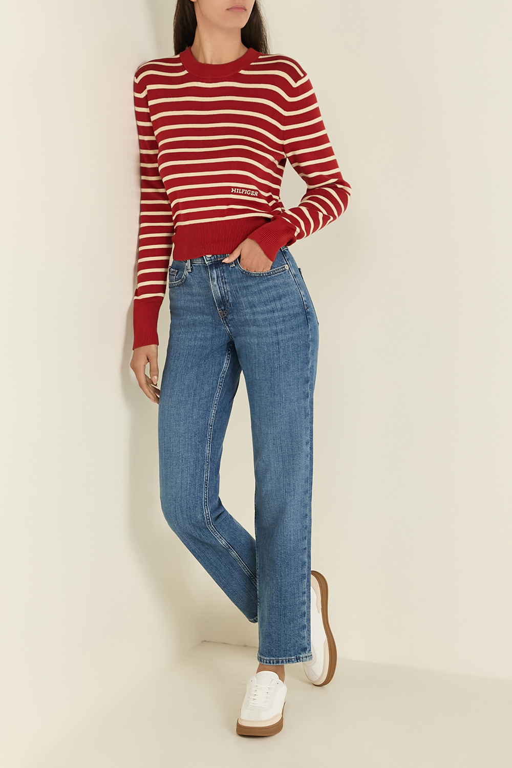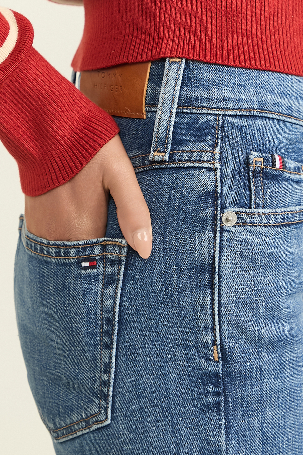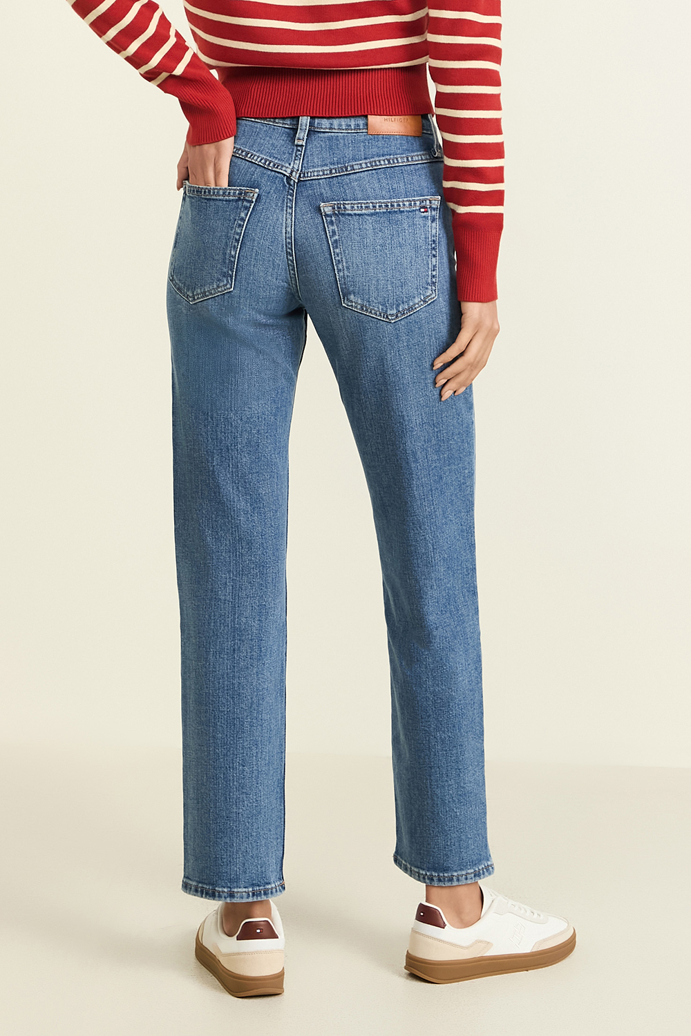 מכנסי ג'ינס בגזרה ישרה ובגובה מותניים בינוני מבית Tommy Hilfiger, עשויים כותנת דנים ממוחזרת בצבע כחול. נסגרים ברוכסן.