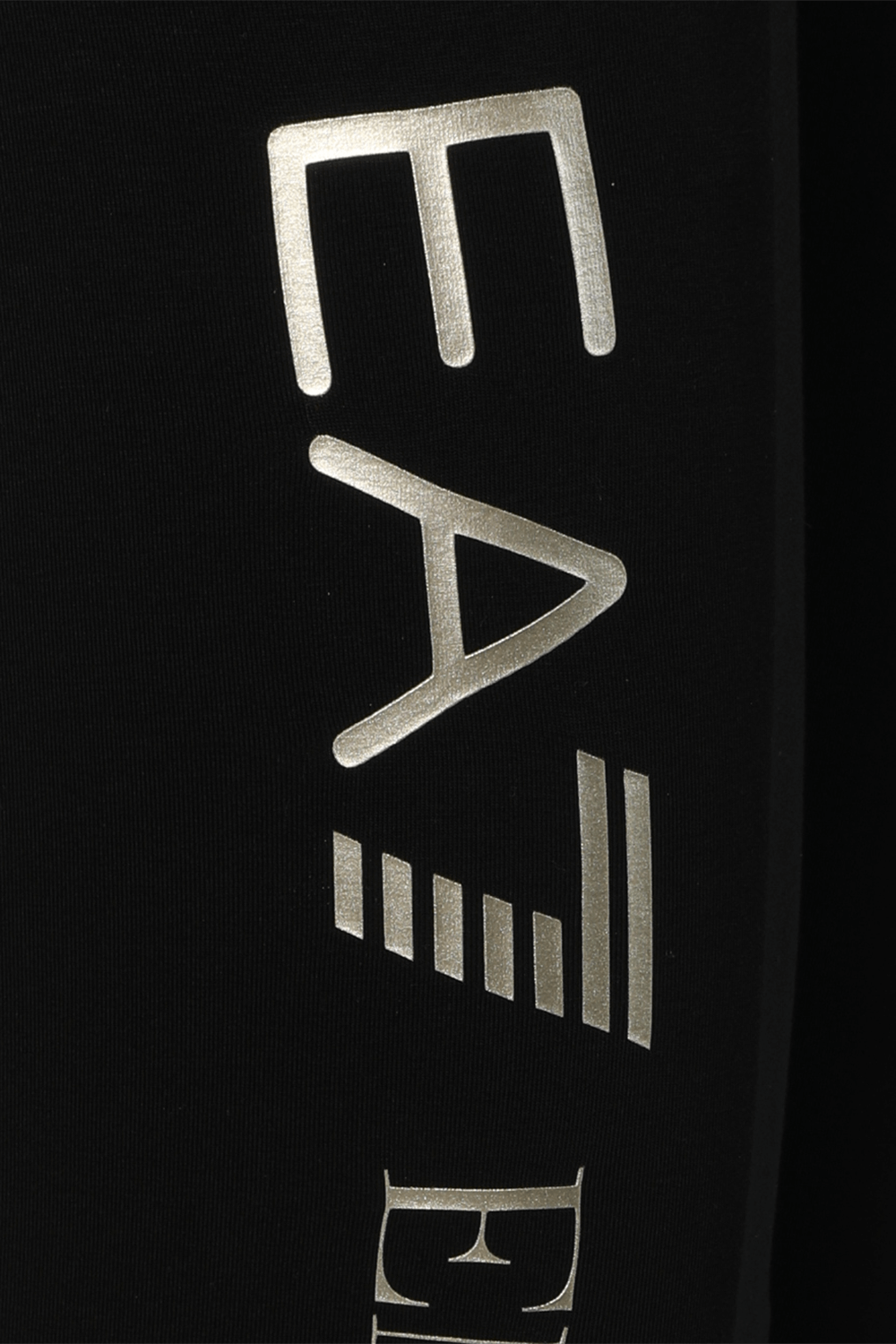 מכנסי טייץ שחורים מבית Emporio Armani העשויים תערובת כותנה אלסטית ונוחה לכדי צללית צמודה בעלת חגורת מתניים גמישה המונחת בגובה טבעי. הדפס שם המותג בגוון זהוב מתנוסס בכל אורכה של צדי הרגל הימנית בעוד שעל גבי הרגל השניה מודפס הלוגו בגוון זהה.
