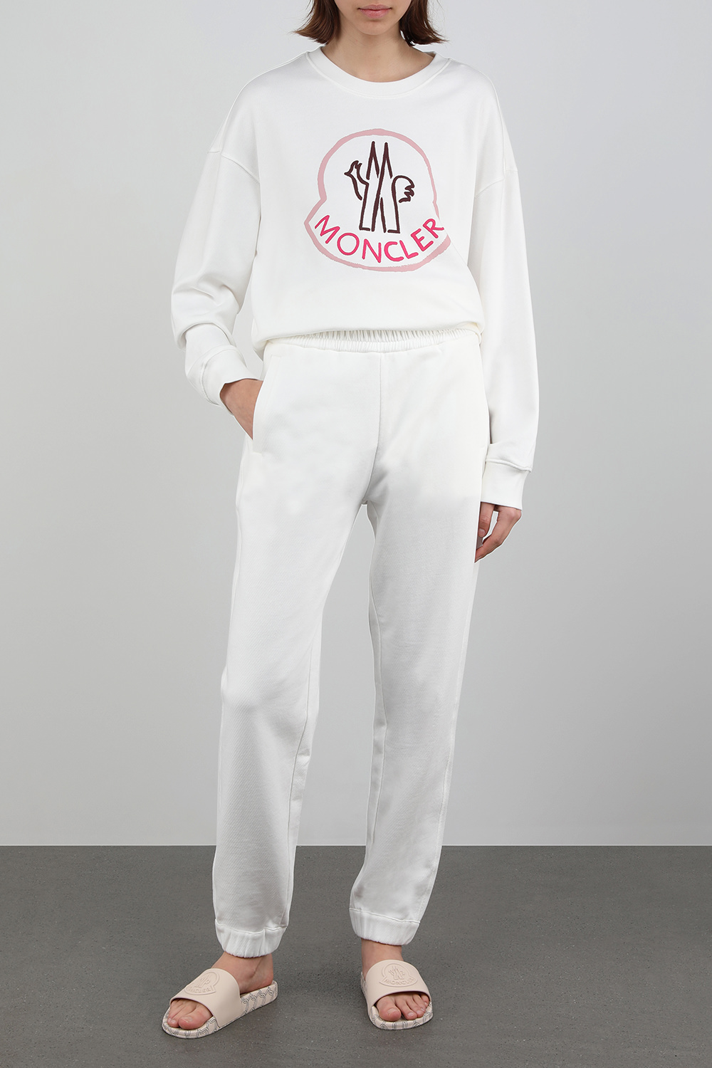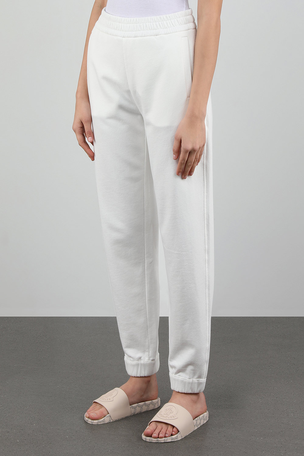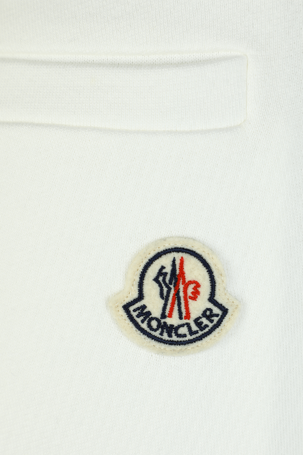 מכנסיים מבית מונקלר. זהו דגם העשוי מ-100% משובחת בגוון לבן. לפרט גזרת סלים נינוחה עם קו מותן גמיש ואמרות אלסטיות. לוגו המותג המופיע על גבי הכיס האחרוי חותם את עיצובו השיקי של פריט זה.