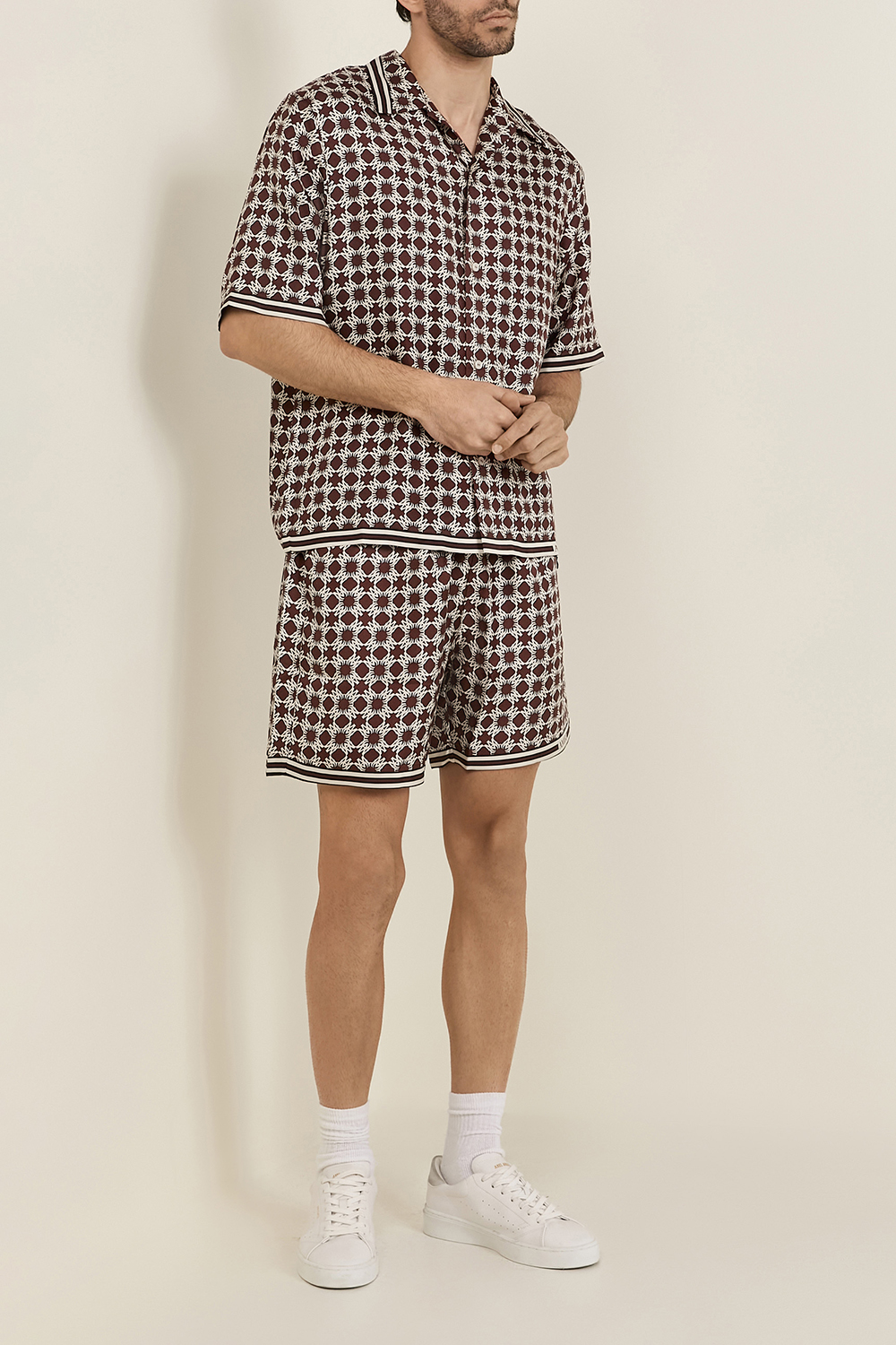 מכנסיים קצרים מבית Amiri, תוצרת איטליה, עשויים משי בצבע חום ובעיצוב מונוגרמה לבן בשילוב חגורת מותניים אלסטית ושני כיסי צד.
