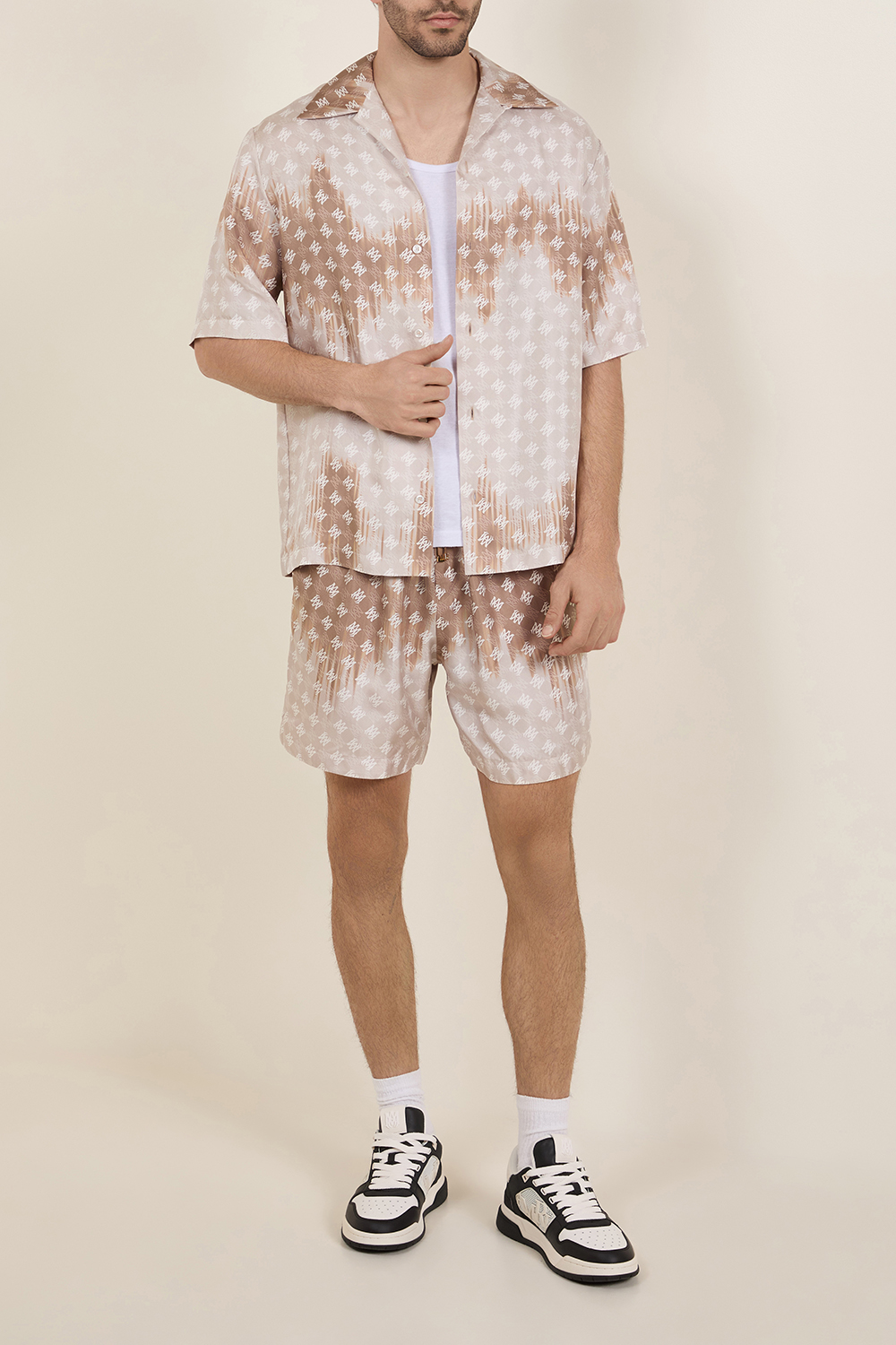מכנסיים קצרים מבית Amiri, תוצרת איטליה, עשויים משי בצבע חום ובהדפס מונוגרמת MA Quad האייקונית - ובקיץ 2025 היא זוכה לאפקט הבהרה יחודי של קרני שמש. יש להם חגורת מותניים אלסטית ושני כיסי צד.