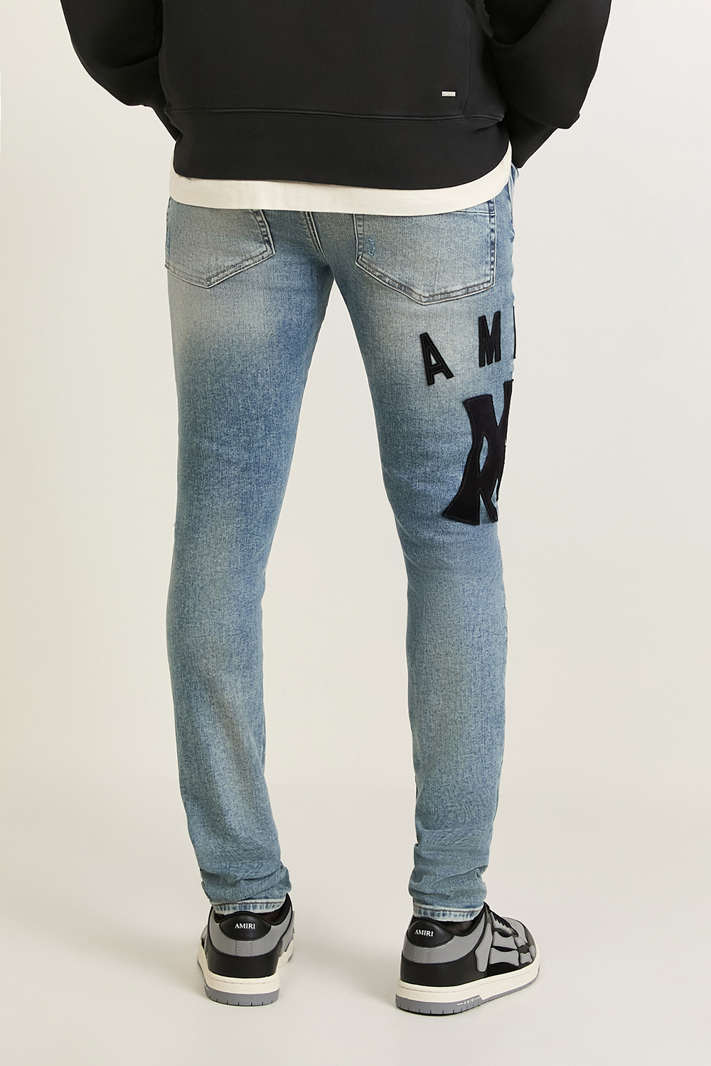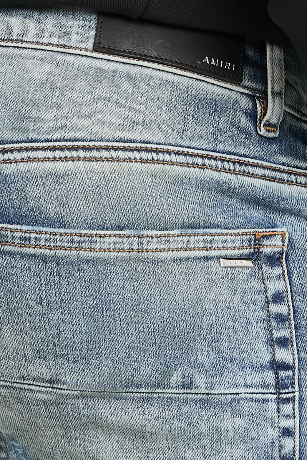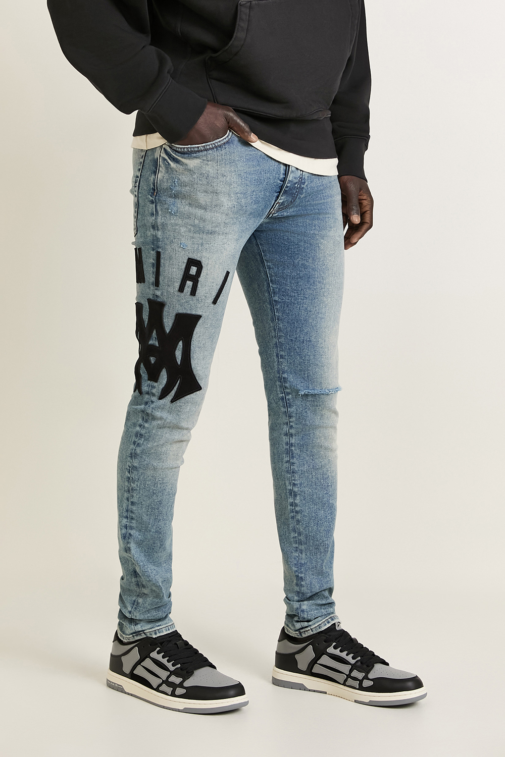 מכנסי סקיני ג'ינס מבית Mike Amiri, תוצרת איטליה. הם עשויים כותנת דנים בצבע כחול עם לוגו פאץ' ונסגרים בכפתורים.