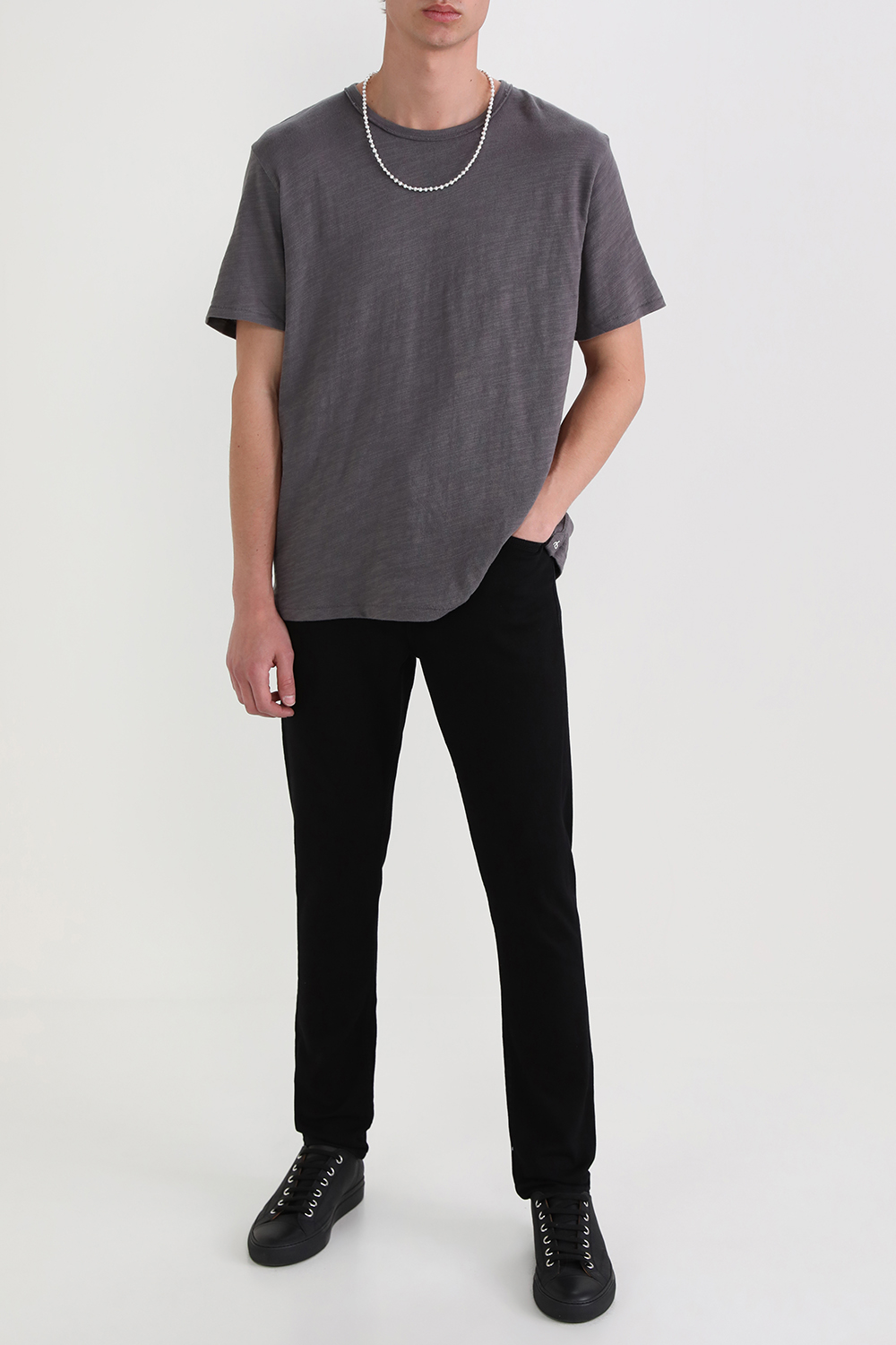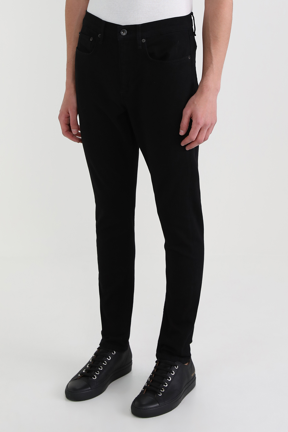 מכנסי ג`ינס מדגם Fit 1 בעיצוב המותג Rag&Bone, העשויים כותנת דנים גמישה בצבע שחור. למכנסיים גזרת סקיני, רוכסן עם כפתור, וחמישה כיסים. רקמת לוגו לבנה תפורה על הכיס האחורי.