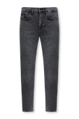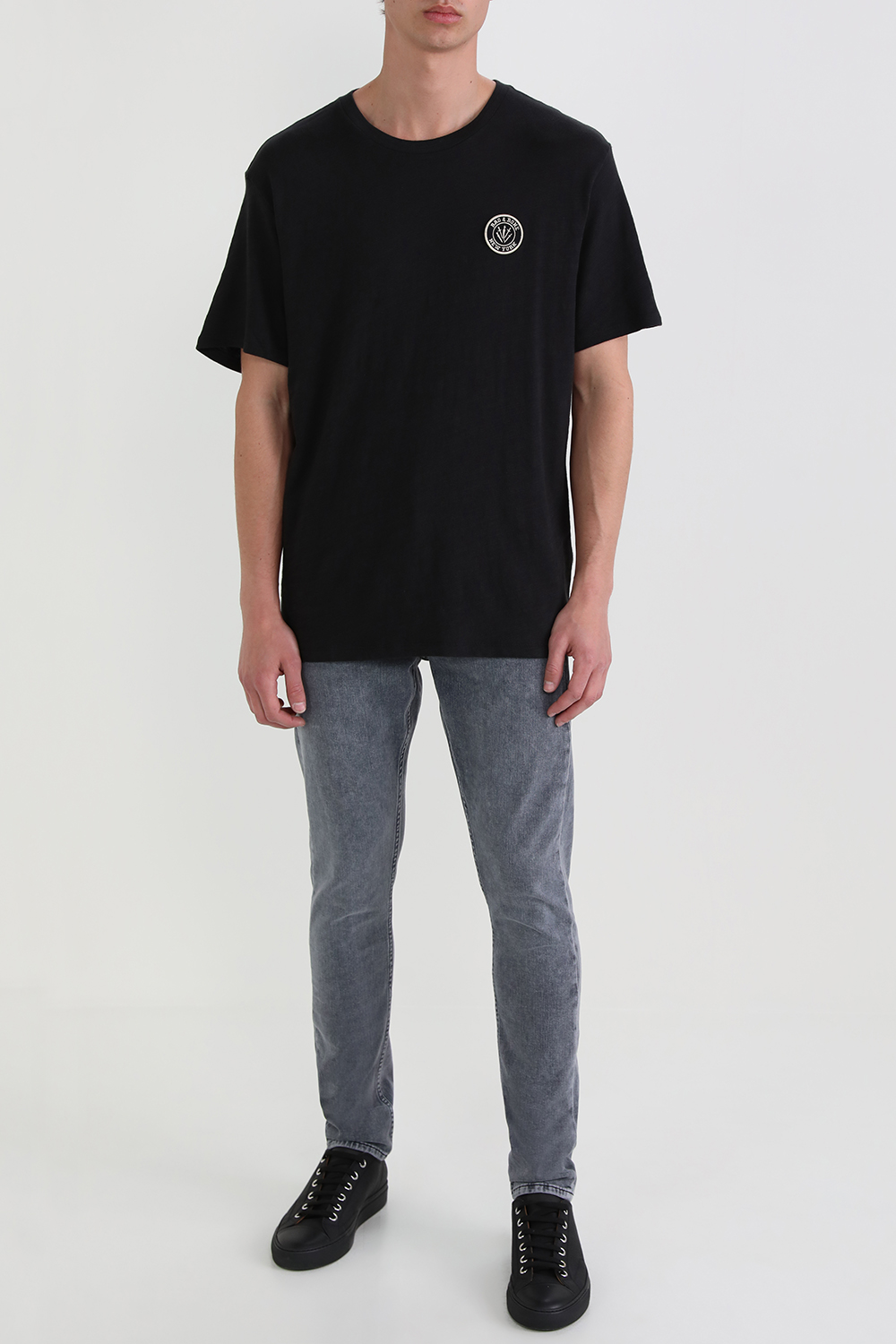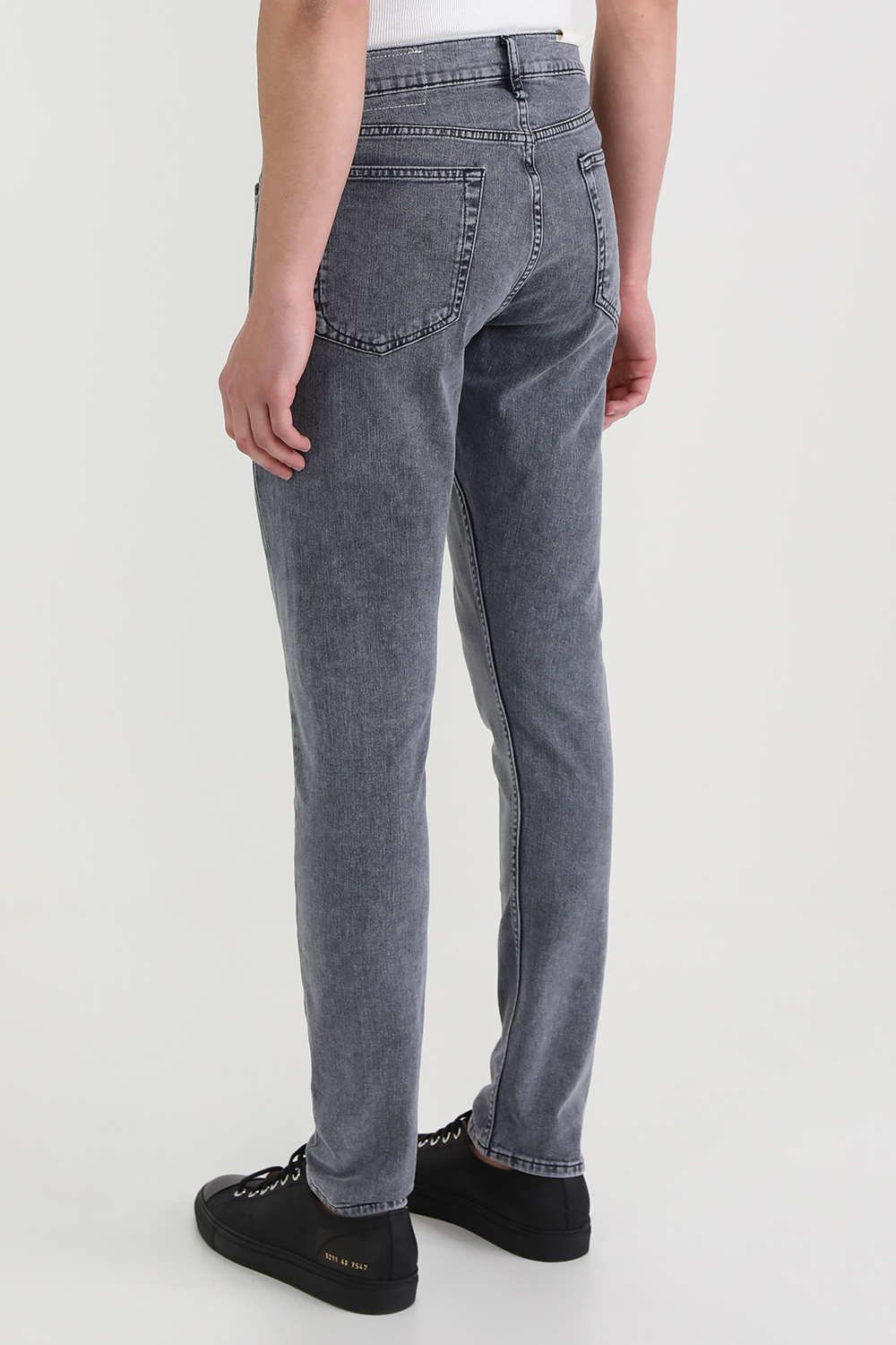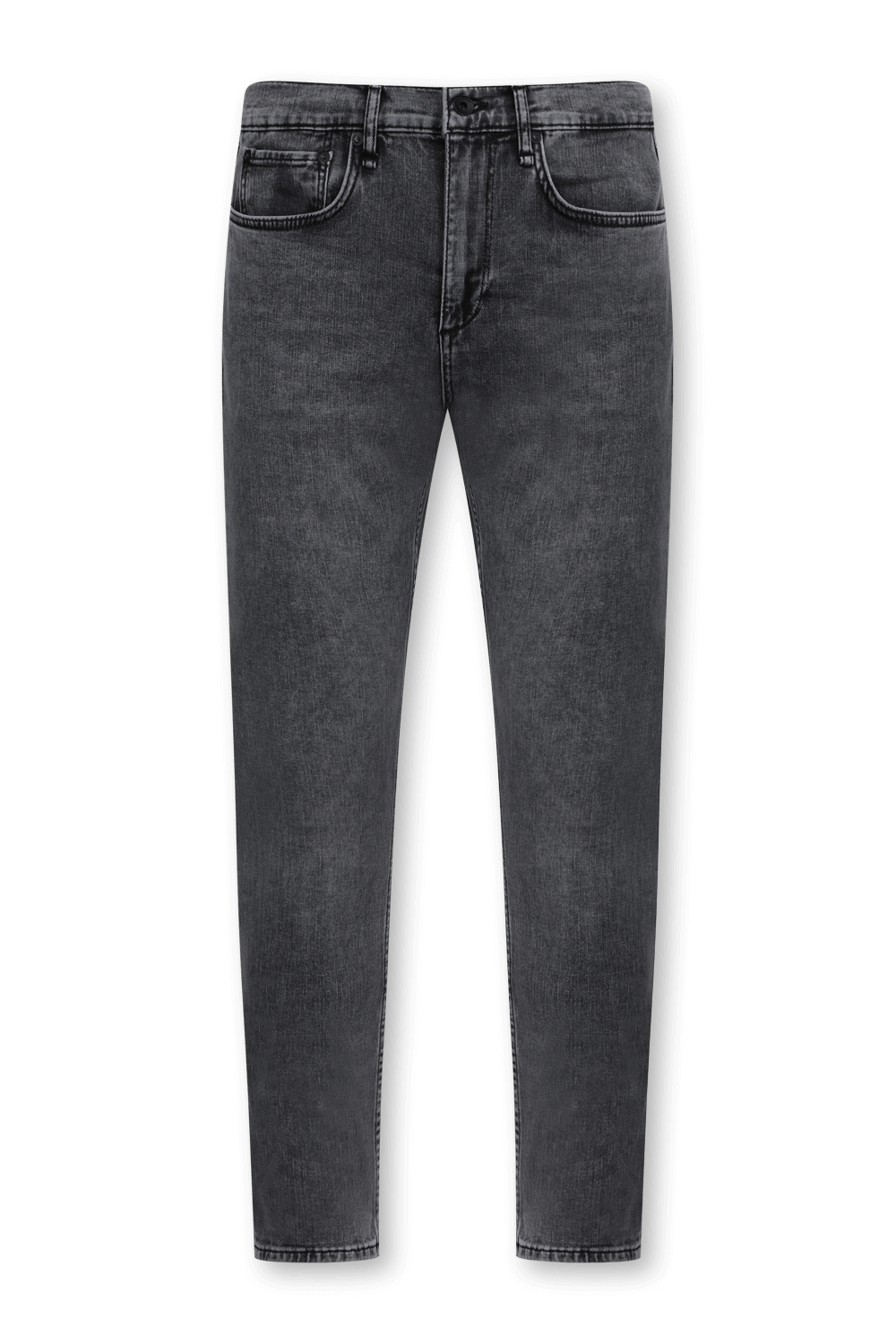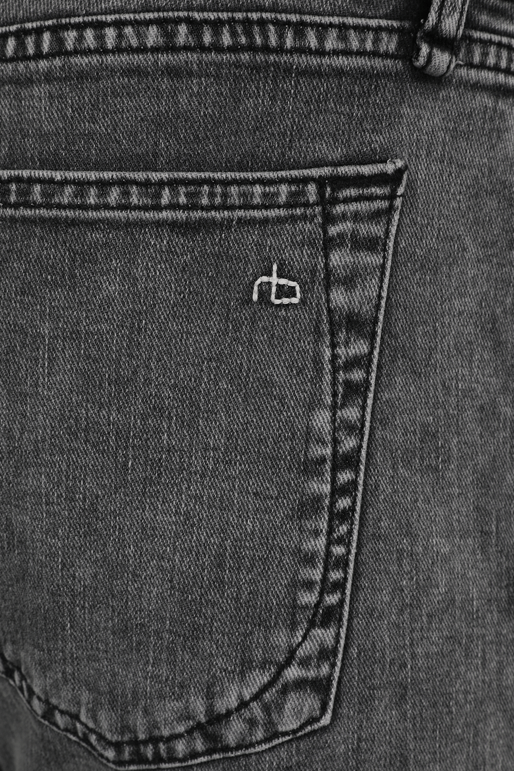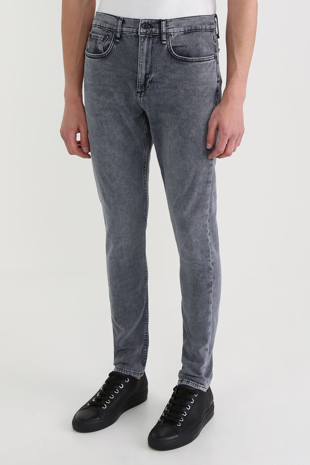 מכנסי ג`ינס מדגם Fit 1 בעיצוב המותג Rag&Bone, העשויים כותנת דנים גמישה בצבע אפור משופשף. למכנסיים גזרת סקיני, רוכסן עם כפתור, וחמישה כיסים. רקמת לוגו לבנה תפורה על הכיס האחורי.