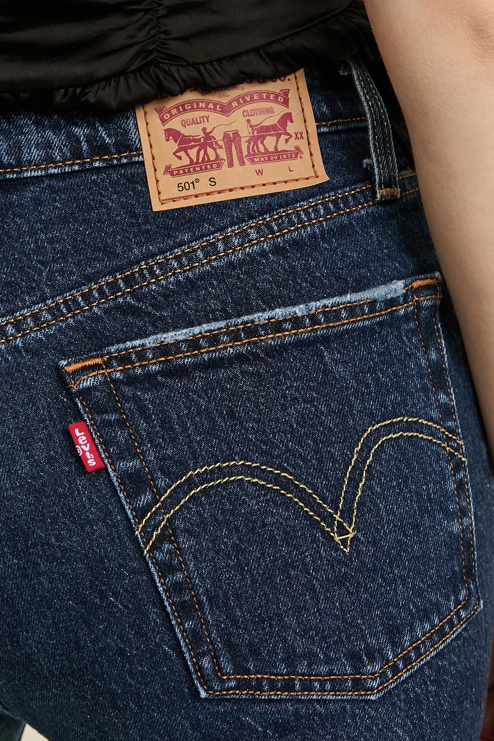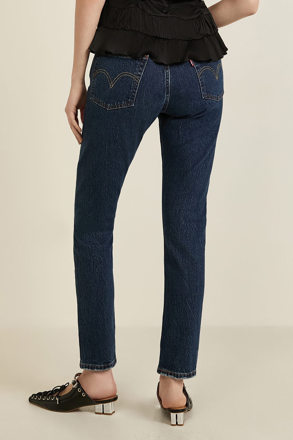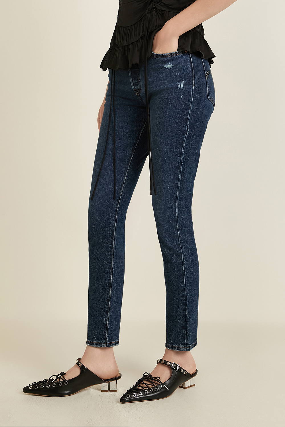 מכנסי ג`ינס מדגם 501 של המותג האמריקאי Levi`s. לפריט גזרת סקיני שיקית והוא עשוי מכותנת דנים מעט גמישה בצבע כחול עם קרעים עדינים.