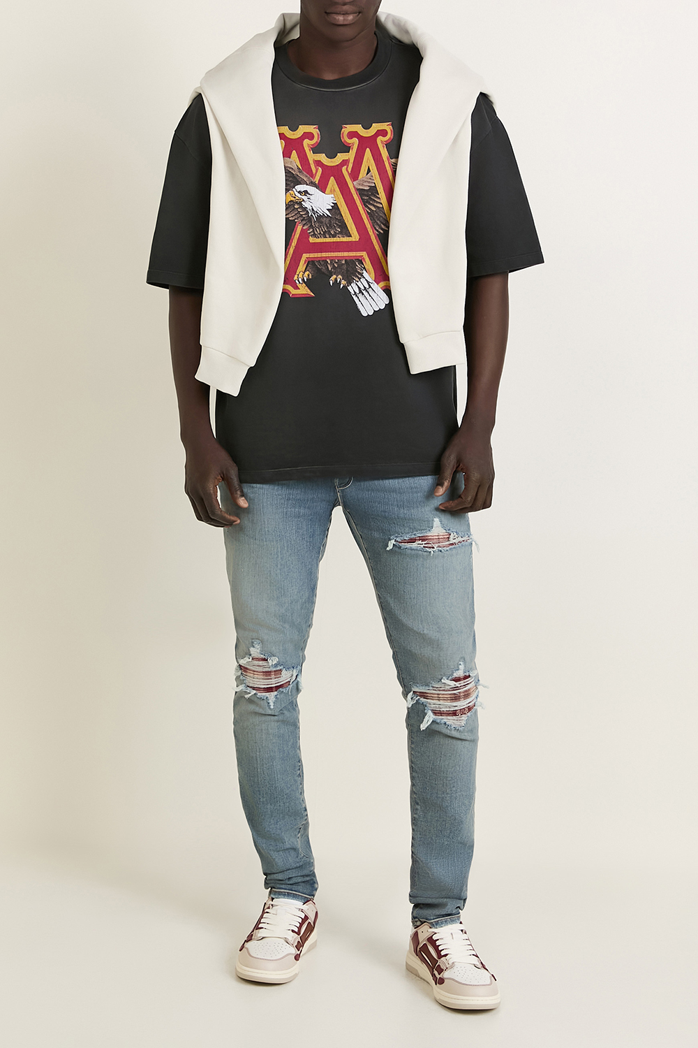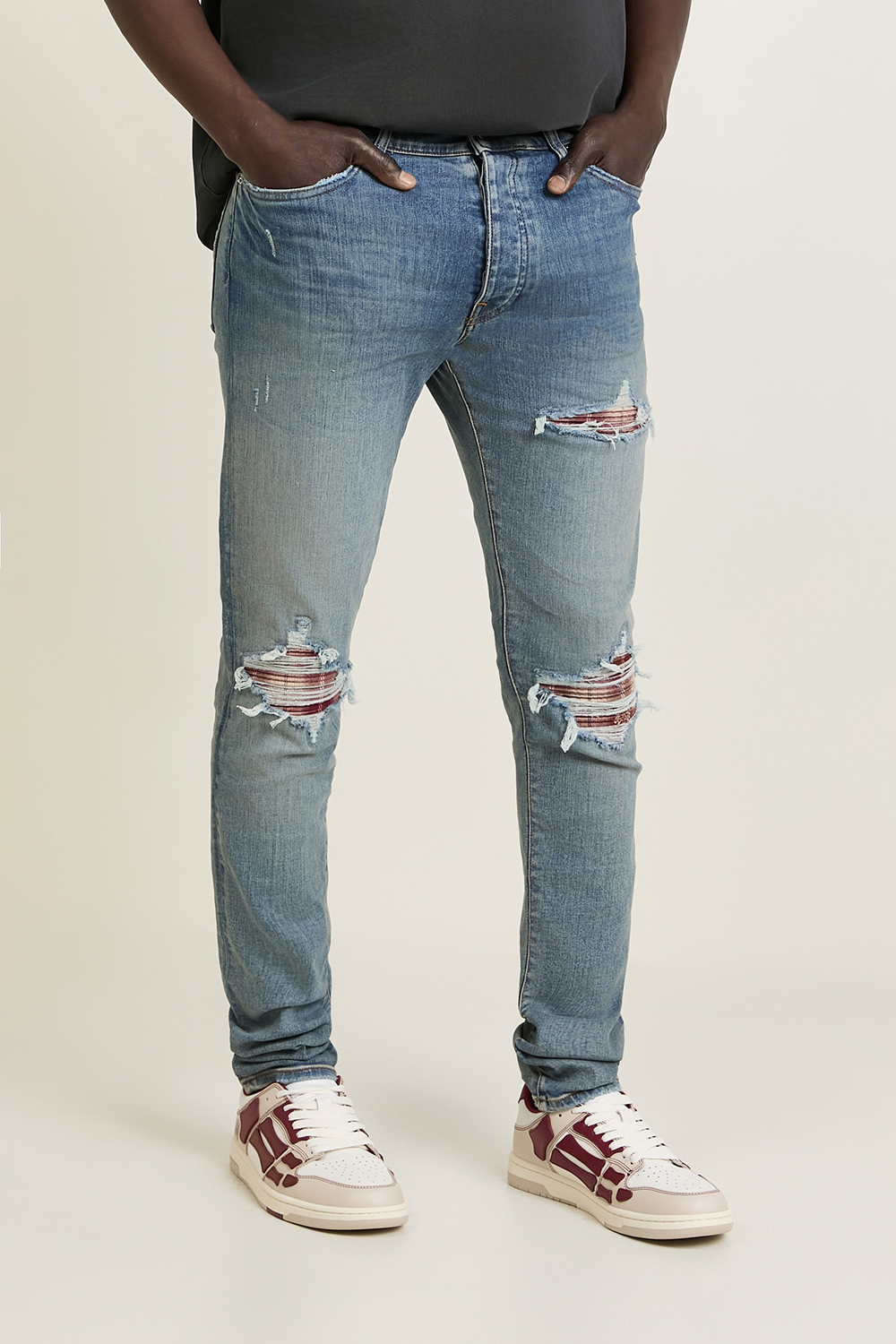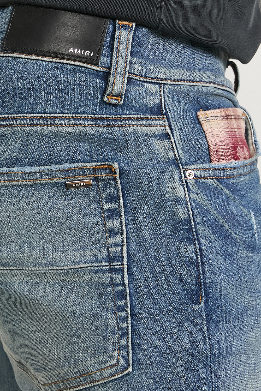 מכנסי ג'ינס בגזרת סקיני מבית Amiri, עשויים כותנת דנים בצבע כחול בשילוב פאצ'ים משבצות ועיצוב קרעים.