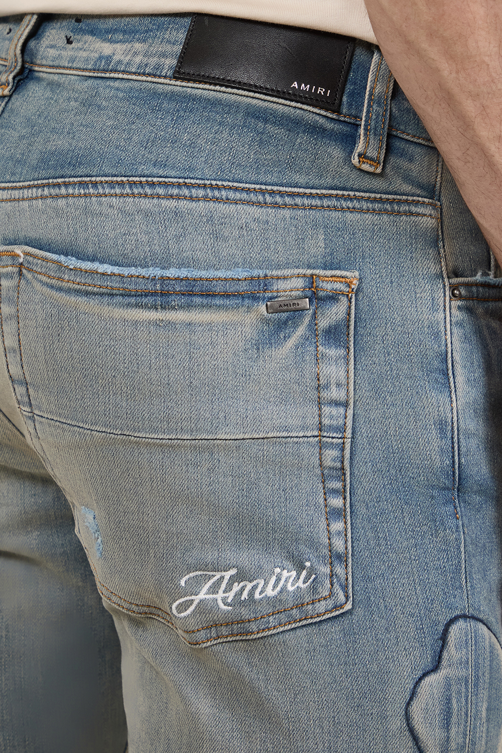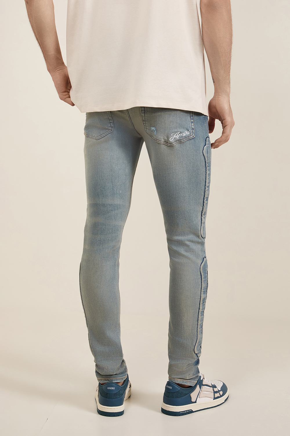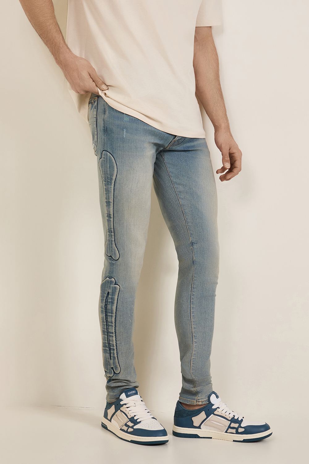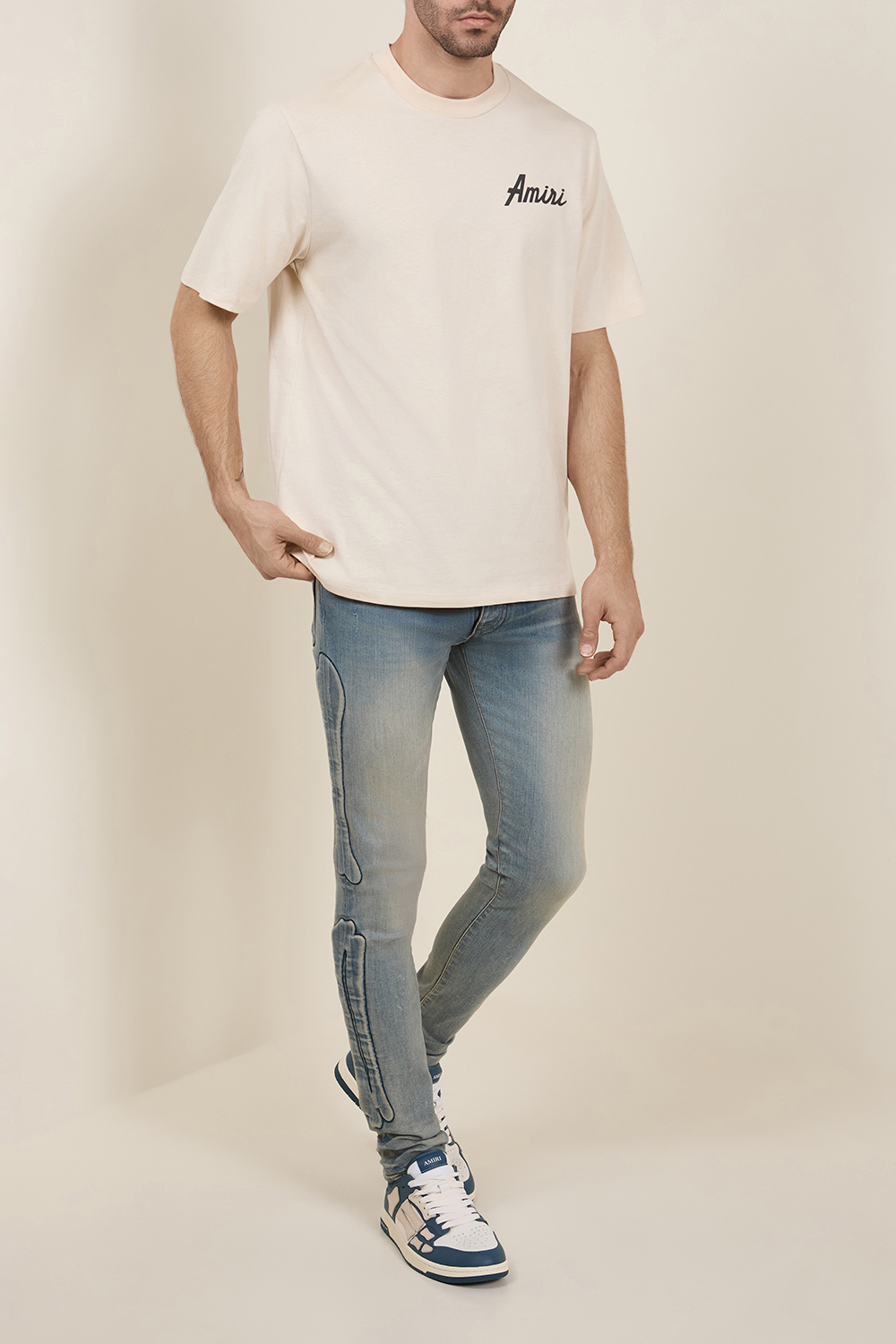 מכנסי ג'ינס בגזרת סקיני מבית Amiri, עשויים כותנת דנים איטלקית, אלסטית, בצבע כחול בדוגמת העצמות האייקונית של המותג.