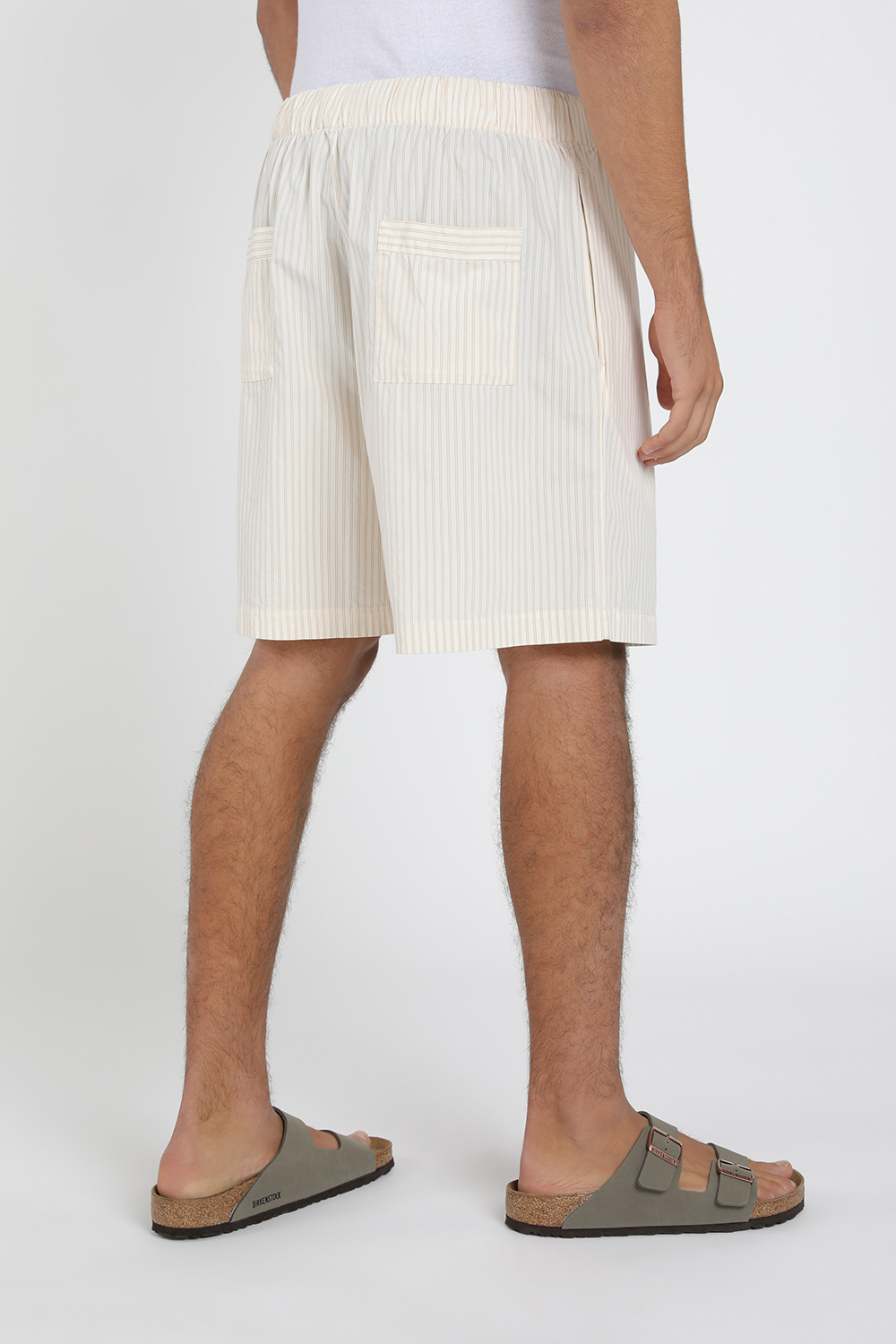 מכנסי פיג'מה ברמודה מבית Birkenstock, עשויים כותנה אורגנית בצבעים לבן וצהוב עם חגורת מותניים אלסטית.