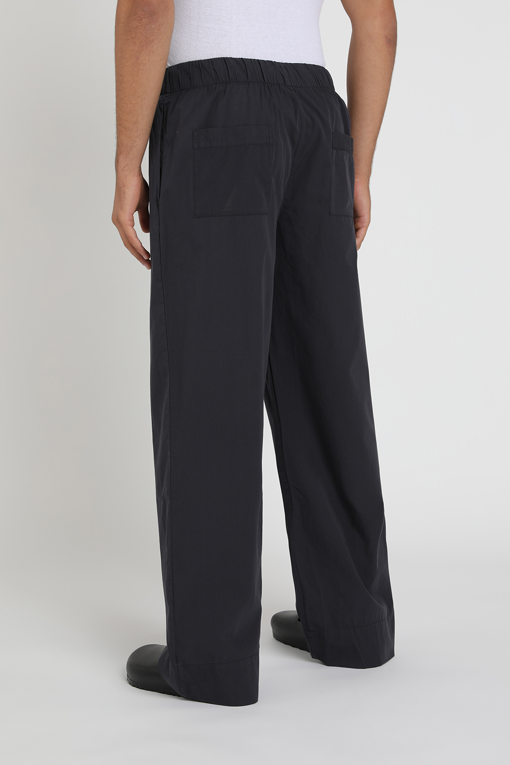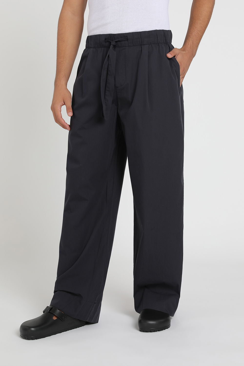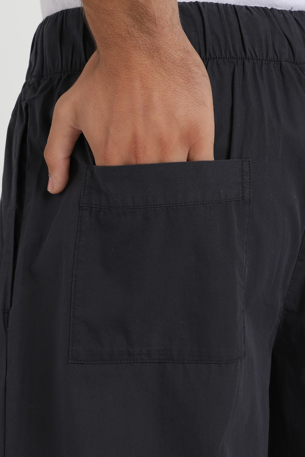 מכנסי פיג'מה ברמודה מבית Birkenstock, עשויים כותנה אורגנית בצבע שחור עם חגורת מותניים אלסטית בגזרה משוחררת.