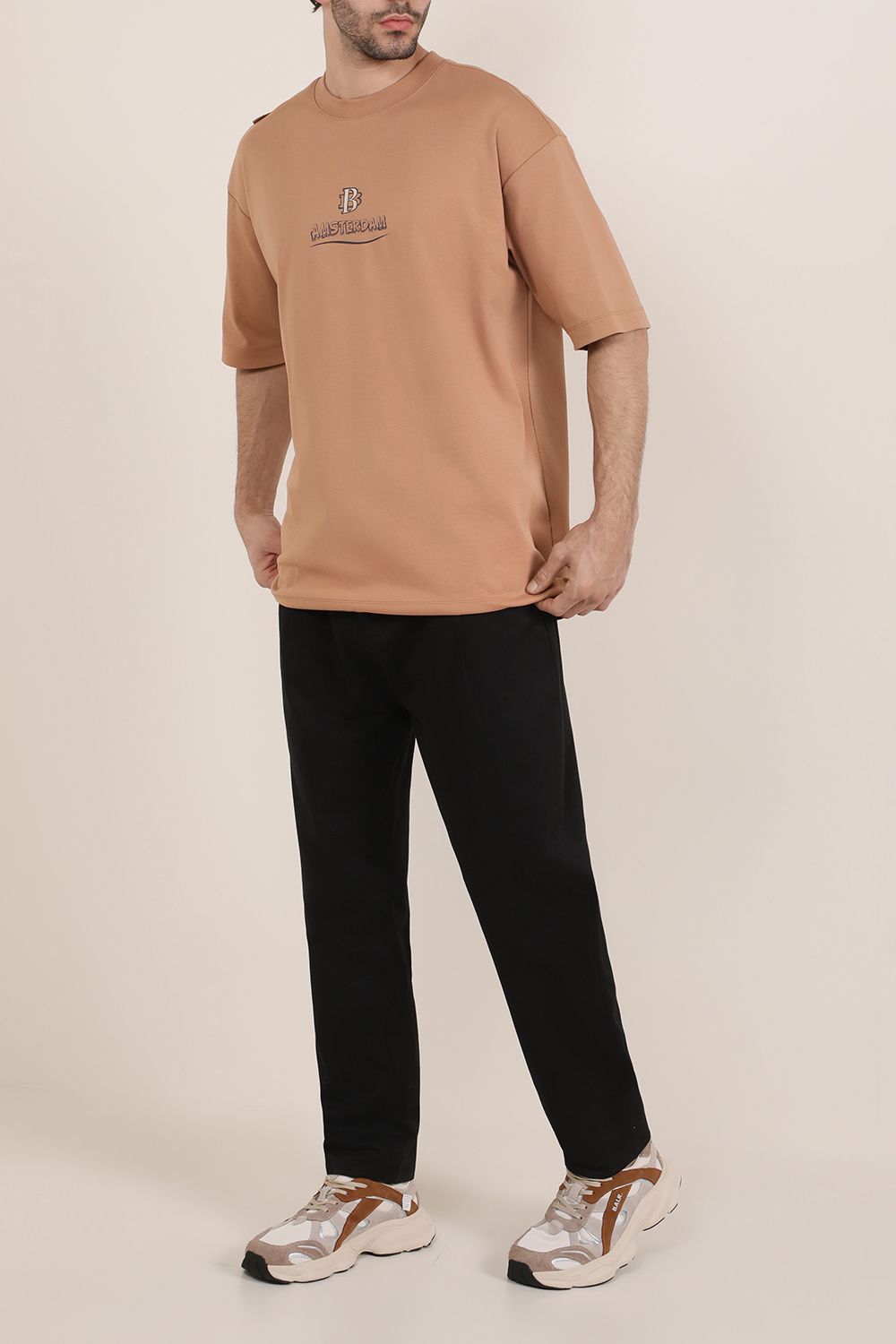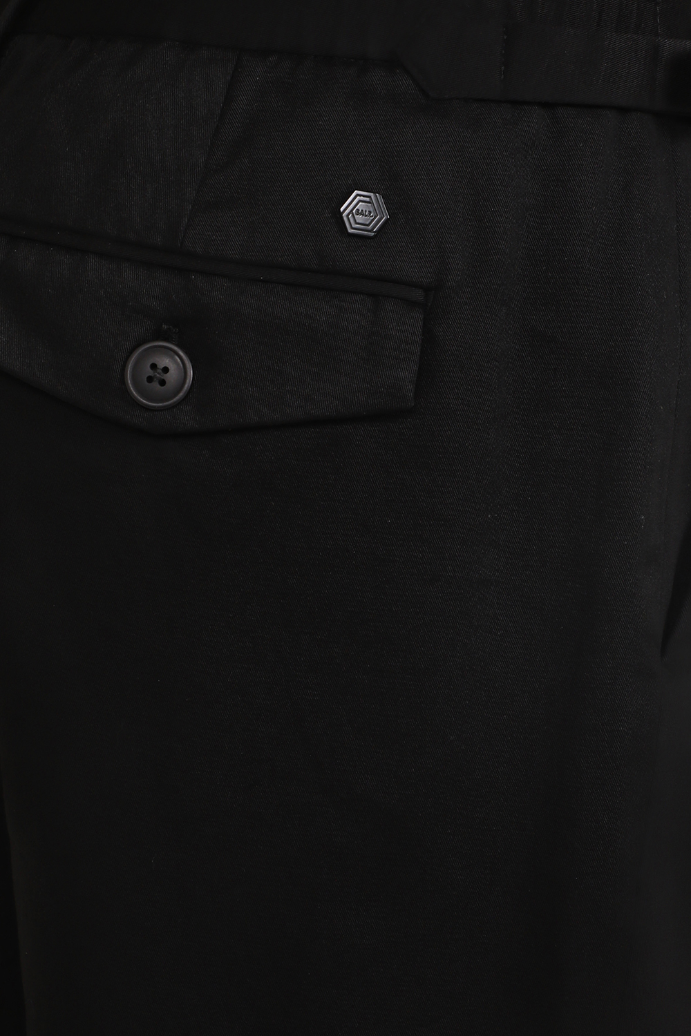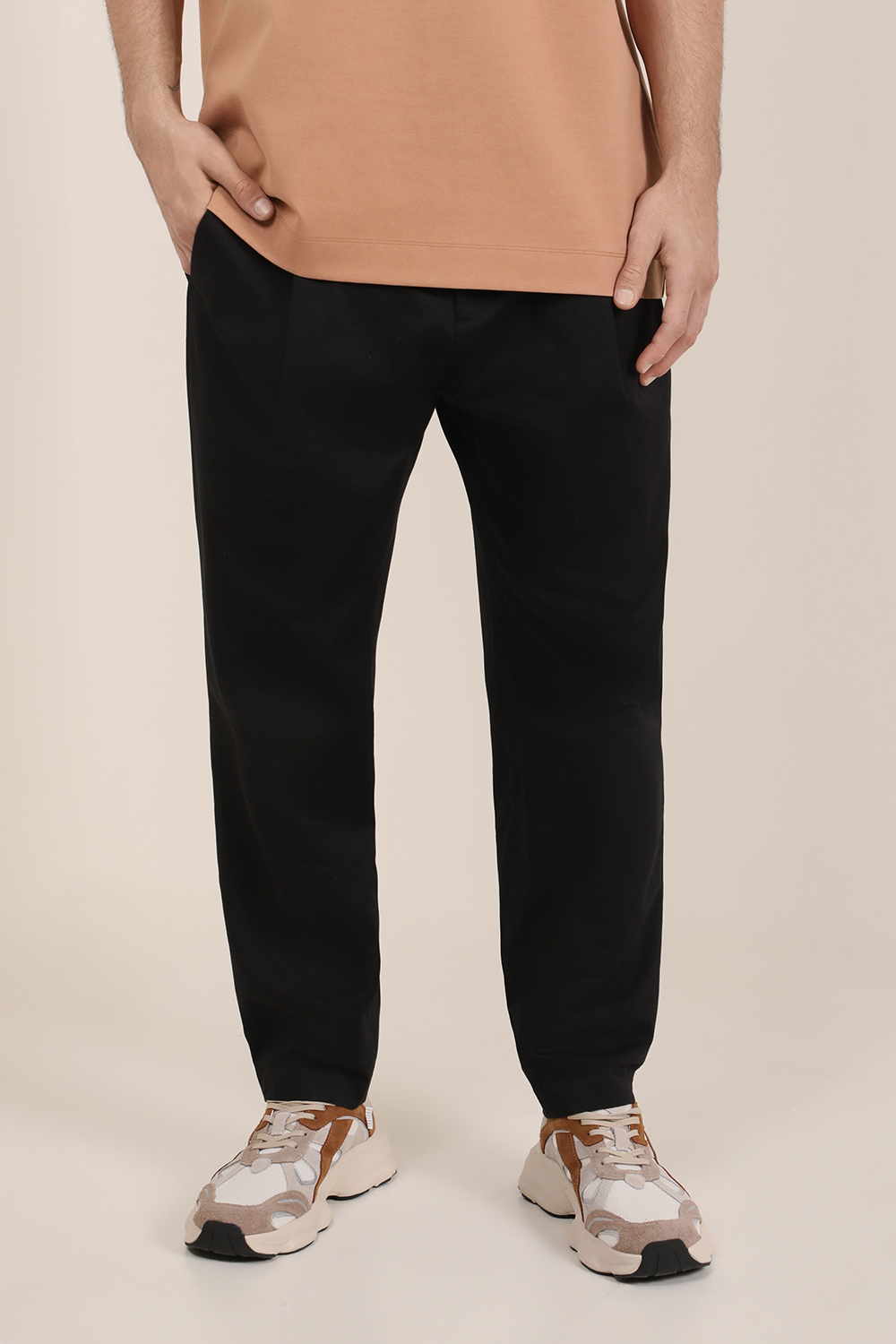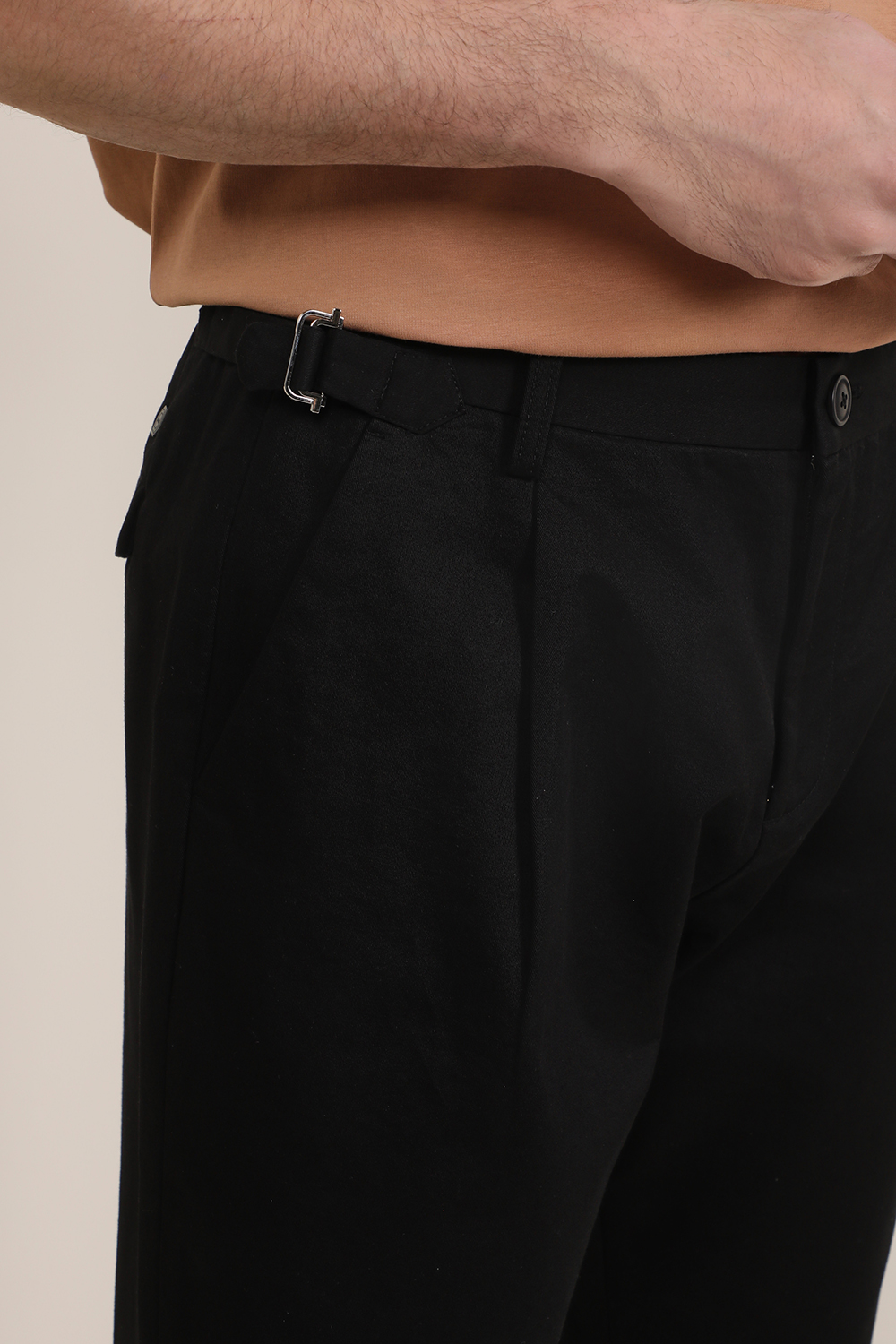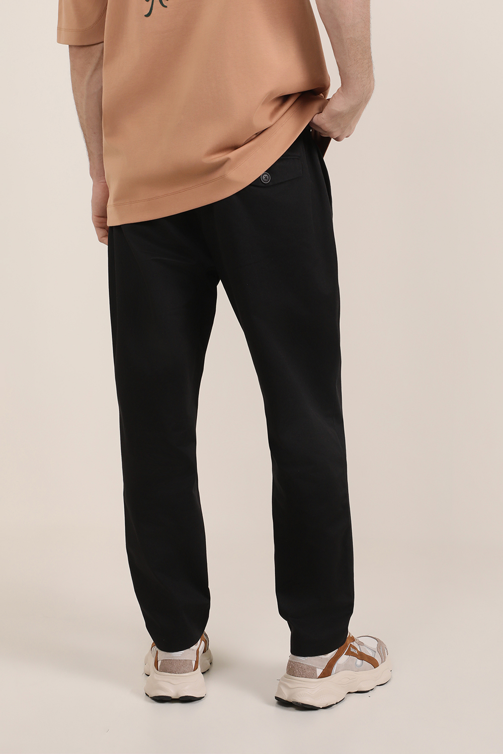 מכנסי צ'ינו מבית Balr, עשויים כותנה בצבע שחור יש להם חגורת מותניים אלסטית מאחור בשילוב שני אבזמים בצד להידוק. נסגרים ברוכסן וכפתור.