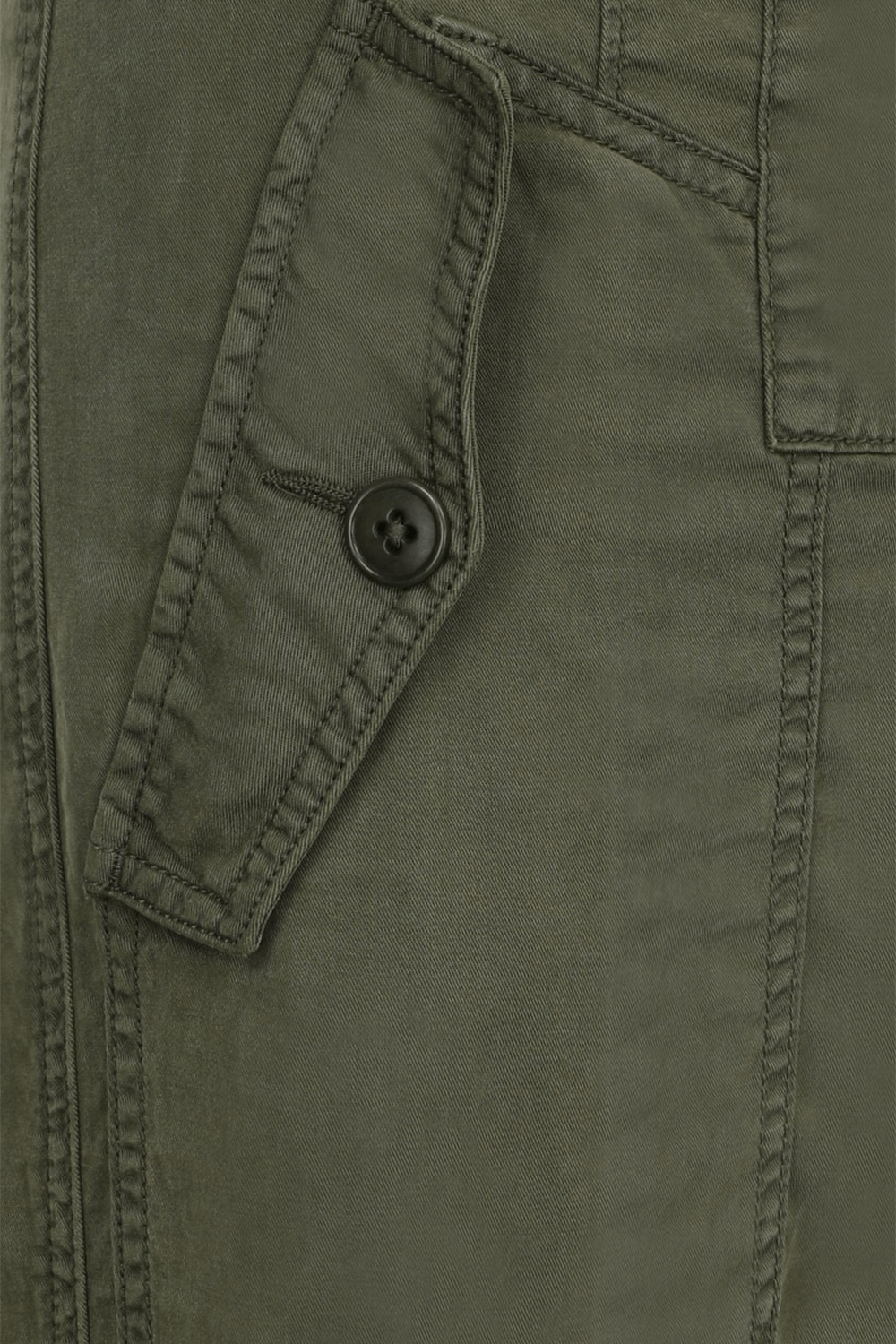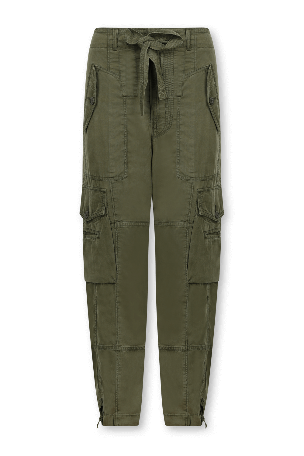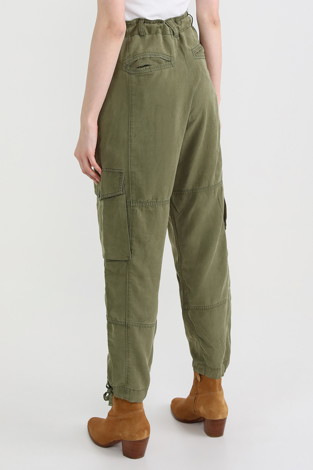 מכנסי קרגו ארוכים בעיצוב בית האופנה PoloRalph Lauren העשויים תערובת פשתן וליוסל בצבע ירוק זית. למכנסיים תיפורים בולטים כחולים כיסים גדולים. הם כוללים חגורת מתניים גמישה עם שרוכים ואמרות עם שרוכי הידוק.